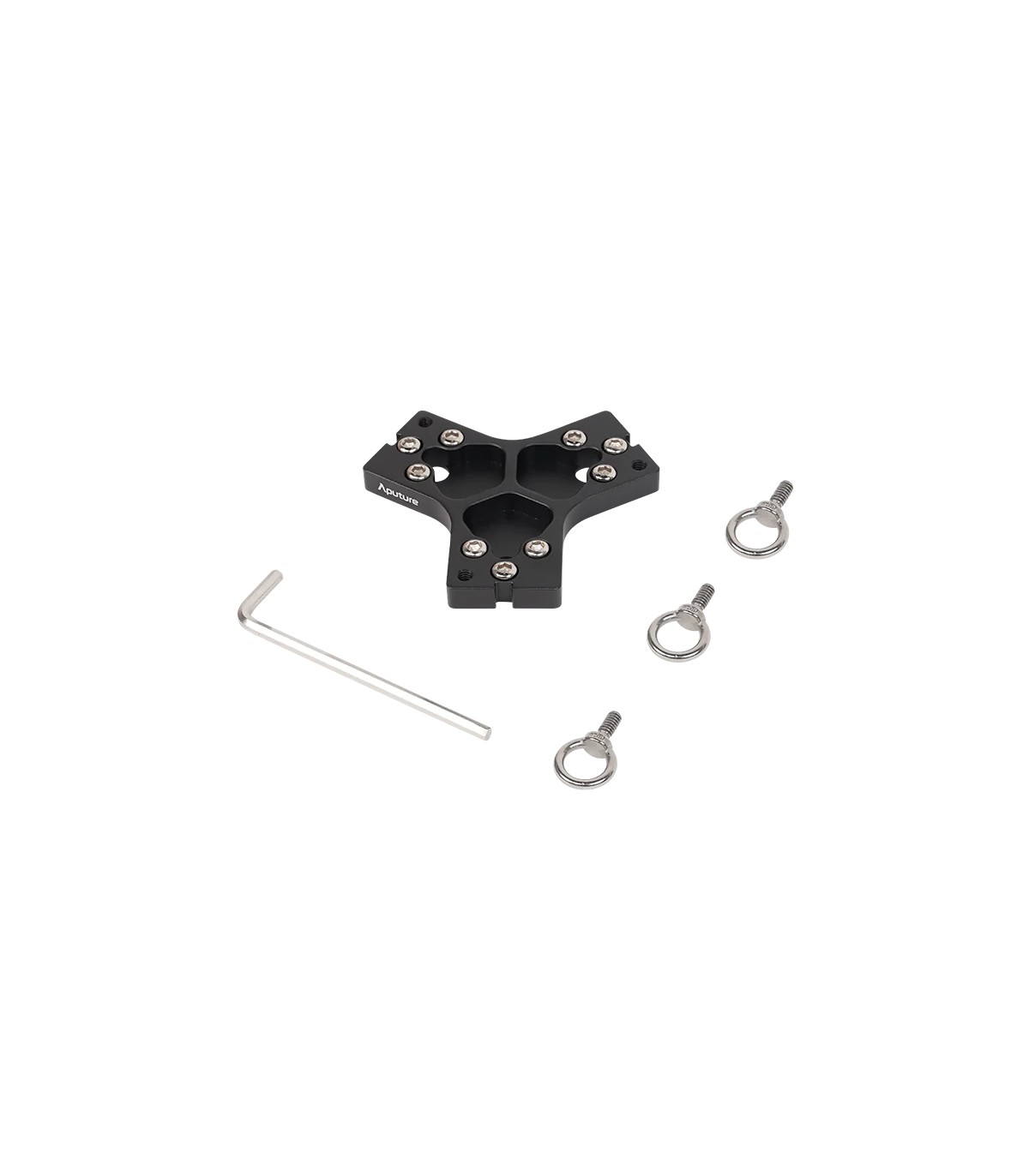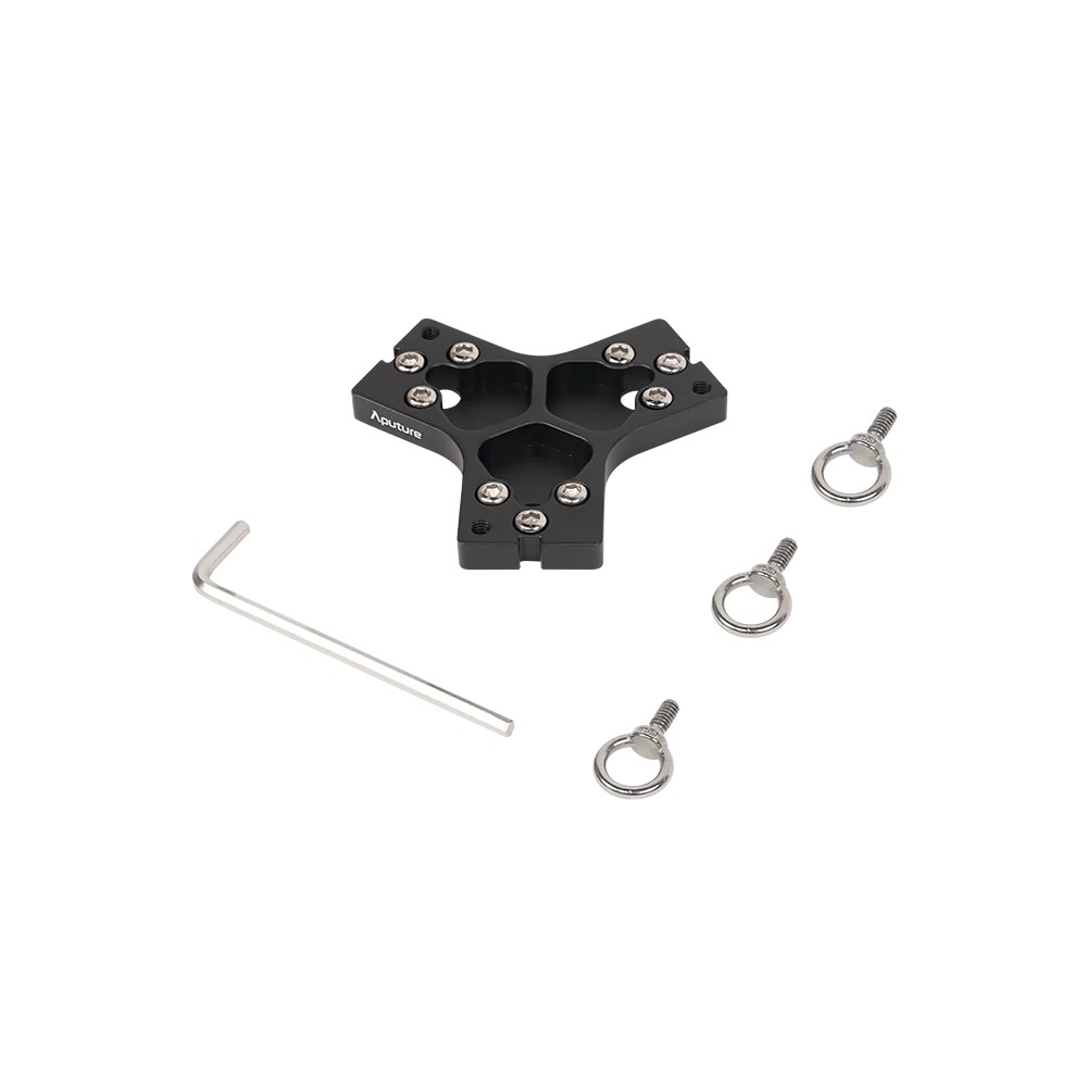 Conector plano 3 vías pasivo para empalmar tres INFINIBAR PB3, PB6 o PB12 de Aputure. Incluye 1 conector plano, 3 cáncamos y 1 llave allen 5.