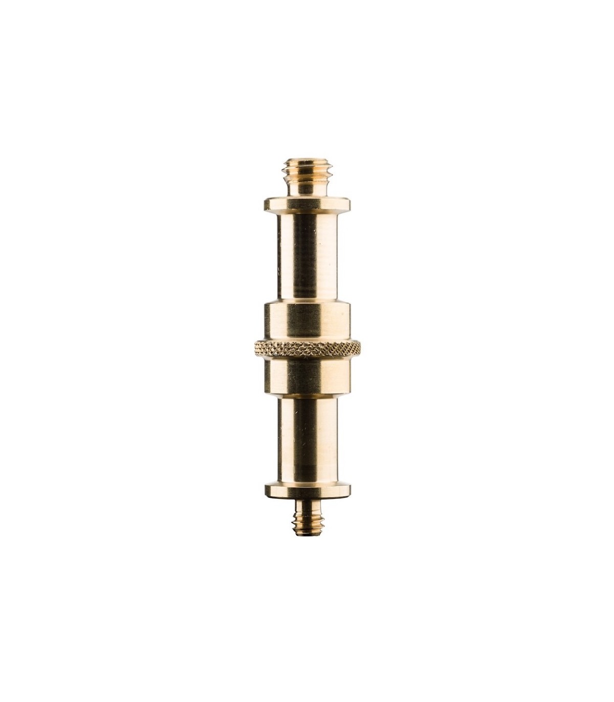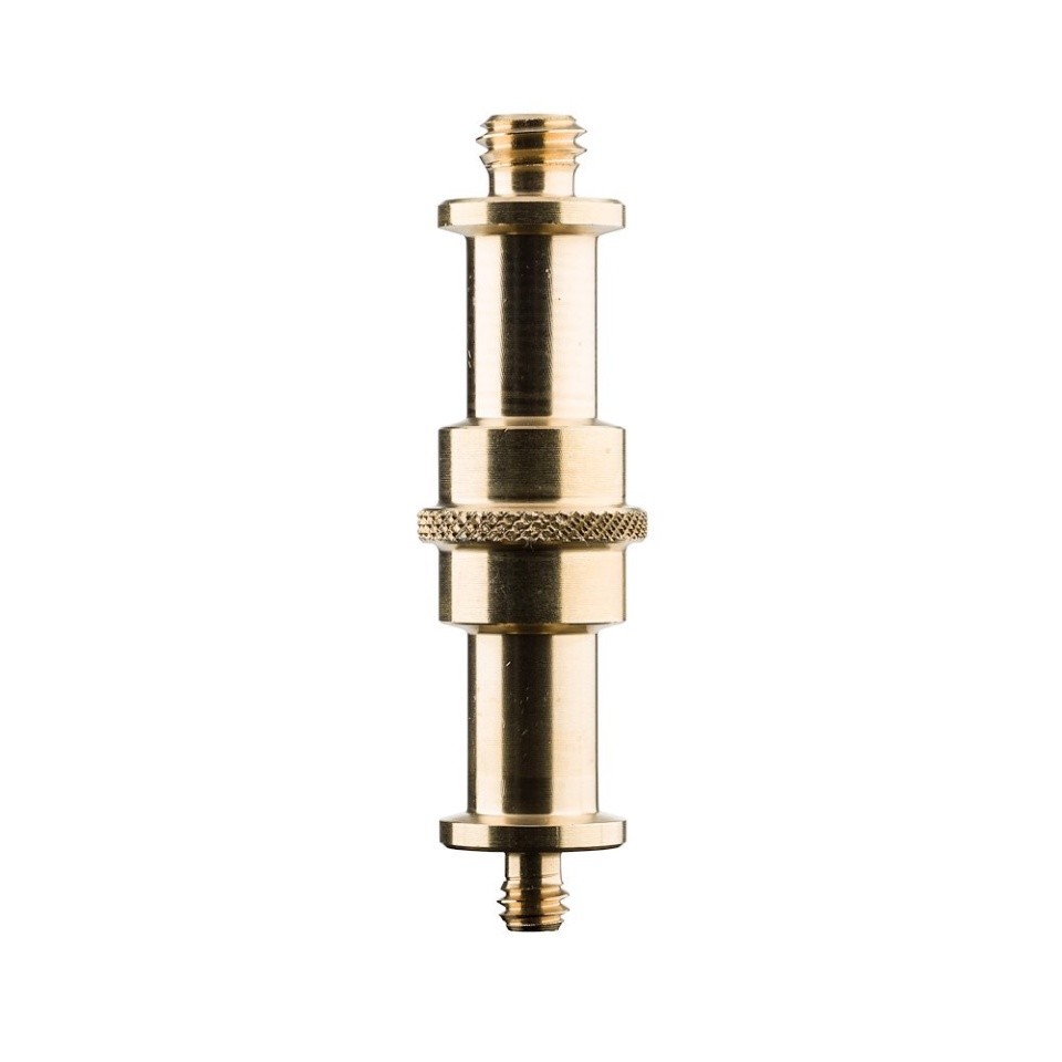 Espárrago de 16mm a 16mm con machos 1/4" y 3/8"; de bronce. También conocido como espigot, tocho o adaptador. Longitud 6,8cm y peso 0,07kg. Para adaptar focos y antorchas pequeñas a trípodes y pinzas.