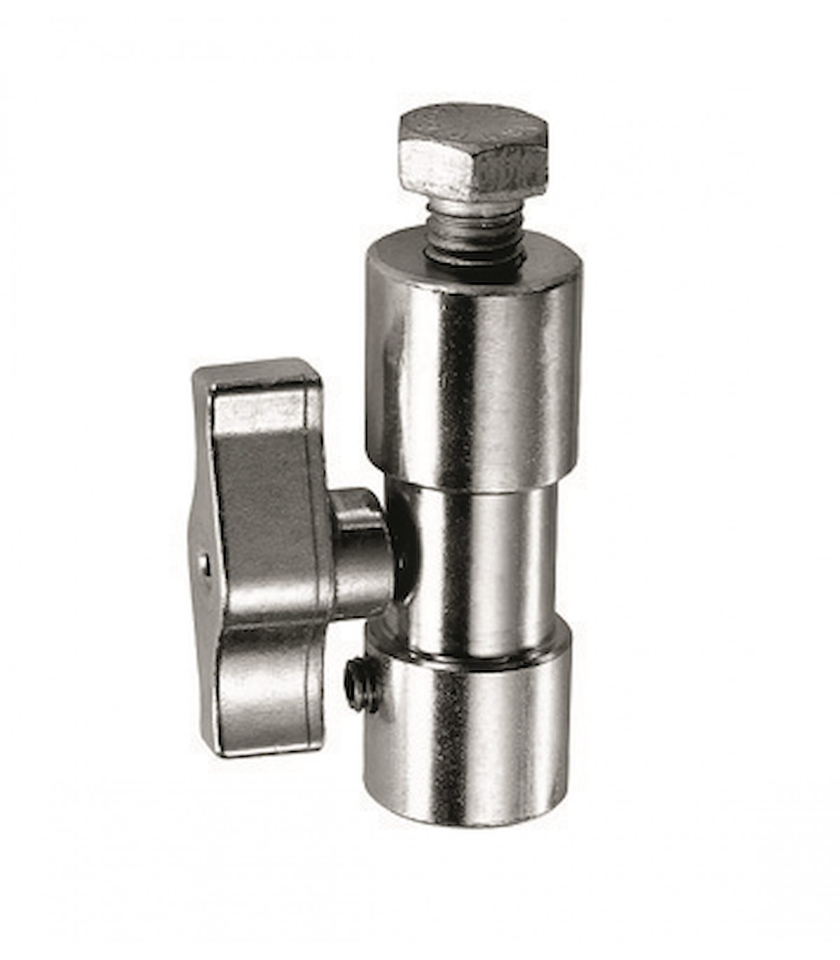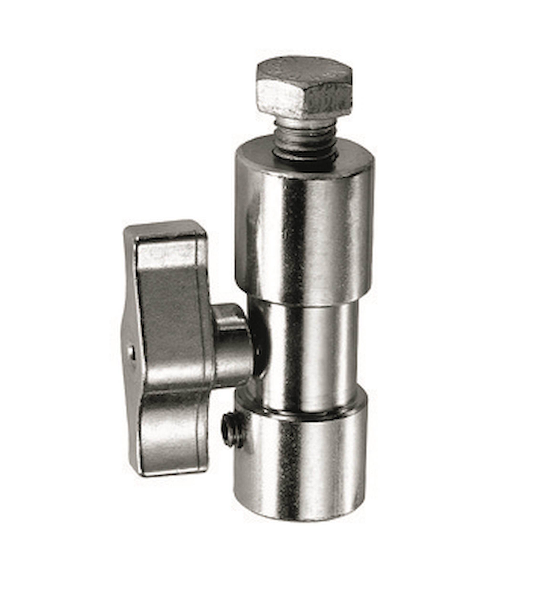 Espárrago de 29mm y manguito de 16mm, a hembra M10; de acero cromado. También conocido como espigot, tocho o adaptador. Longitud 7,6cm y peso 0,15kg. Para adaptar focos de teatro a trípodes y pinzas grandes de boca 29mm y/o manguito 16mm.