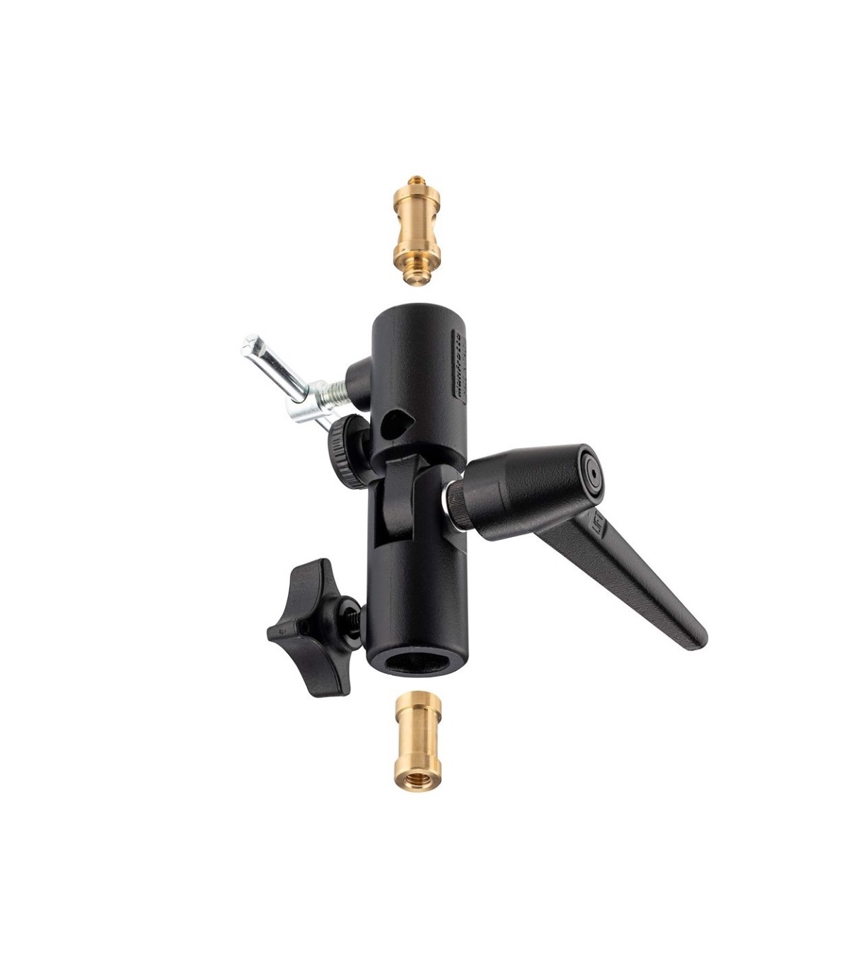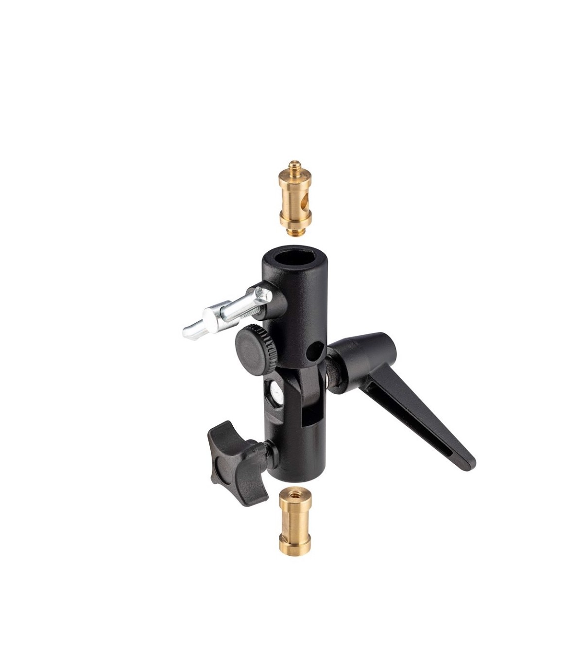 Rótula Lite Tite de aluminio negro para montar un paraguas entre el trípode y el foco. Con 2 manguitos 16mm, manguito 10mm para varilla, y 2 espárragos 16mm (nº118 con machos 1/4" y 3/8", y nº119 con hembras 1/4" y 3/8"), y palometa libre.