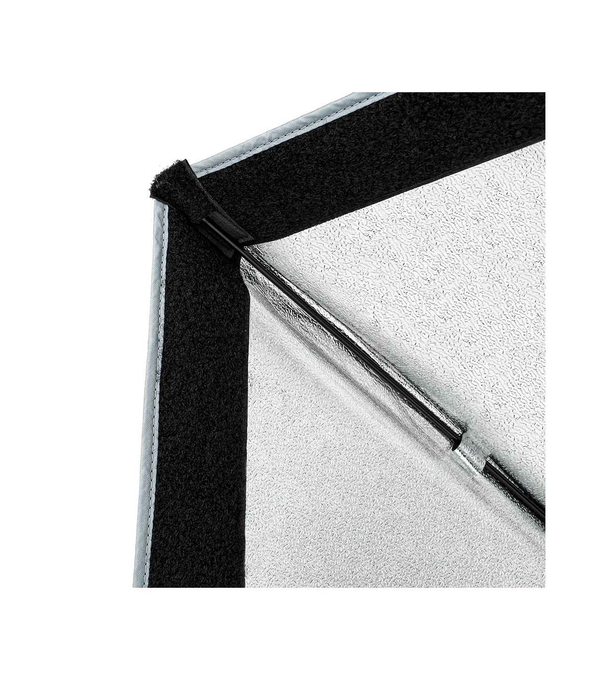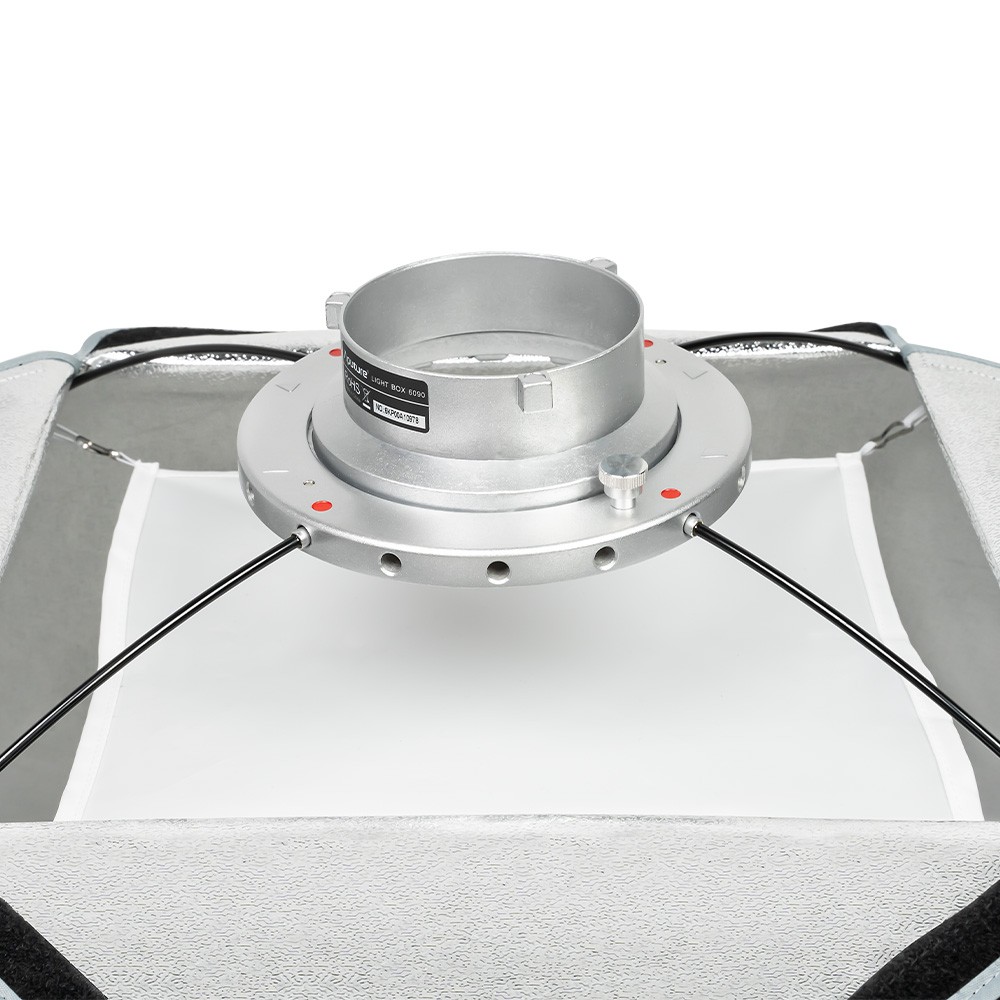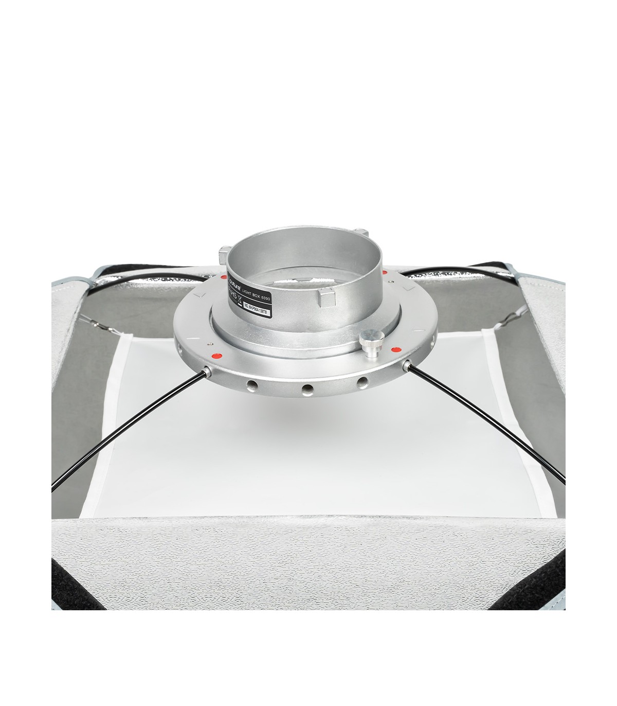 Incluye caja de luz, aro adaptador (speed ring), difusor interno de 1.5 stops, 2 difusores externos de 1.5 y 2.5 stops, nido de abeja 45º y bolsa de transporte. Indicada para luz de modelaje en retrato y producto.