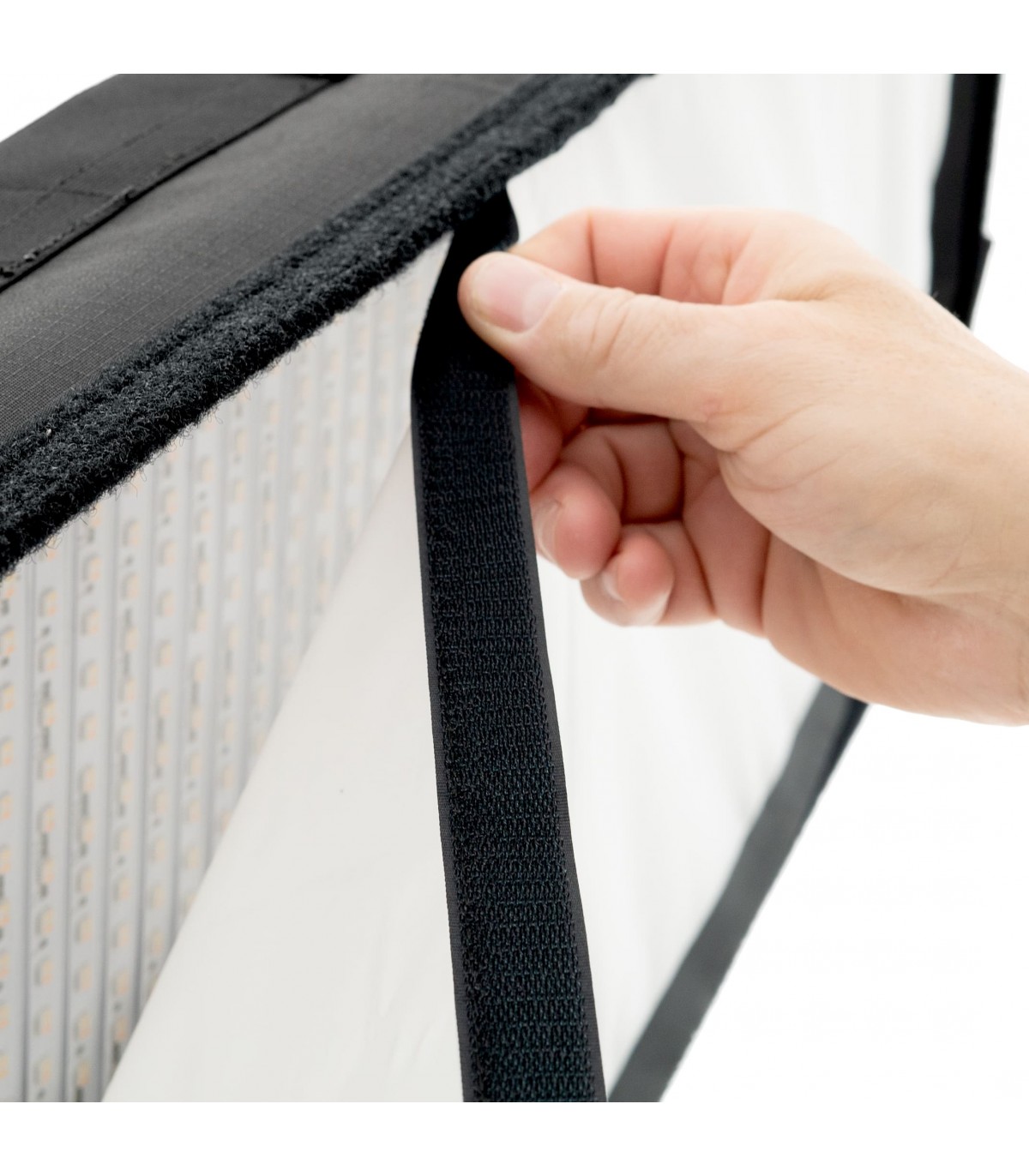 Caja de luz SNAPBOX® 4x1' de DoPchoice, de 108x34cm y 11cm de profundidad, para paneles LiteGear LiteMat 2L y Spectrum 2L, KinoFlo Freestyle Air y Exalux Ledzep 4x1. También conocida como ventana de luz. Suaviza la luz y produce una amplia área de relleno suave y cuadrangular; reduce 2 stops. Incluye caja de luz, difusor frontal Magic Cloth de 2 stops, 4 difusores laterales, 4 tapas laterales y bolsa de transporte. Se monta directamente en el panel.