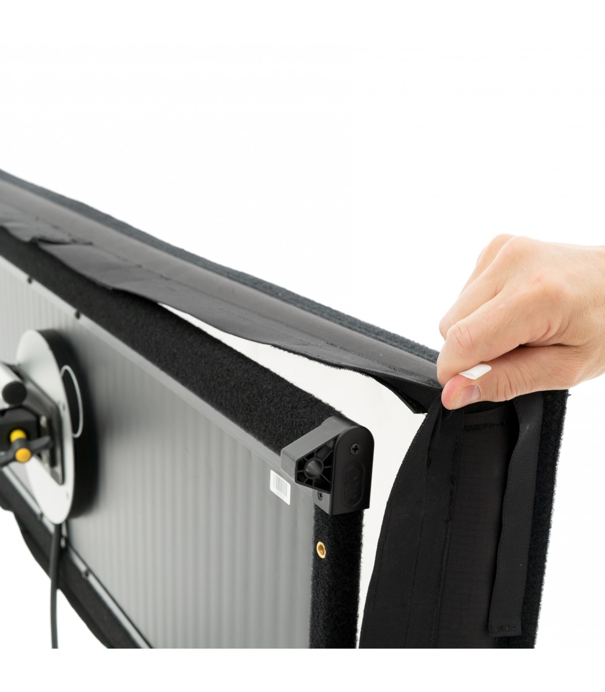 Caja de luz SNAPBOX® 4x2' de DoPchoice, de 107x59cm y 11cm de profundidad, para paneles Litegear LiteMat 4 y Spectrum 4, KinoFlo Freestyle Air Max y Exalux Ledzep 4x2. También conocida como ventana de luz. Suaviza la luz y produce una amplia área de relleno suave y cuadrangular; reduce 2 stops. Incluye caja de luz, difusor frontal Magic Cloth de 2 stops, 4 difusores laterales, 4 tapas laterales y bolsa de transporte. Se monta directamente en el panel.
