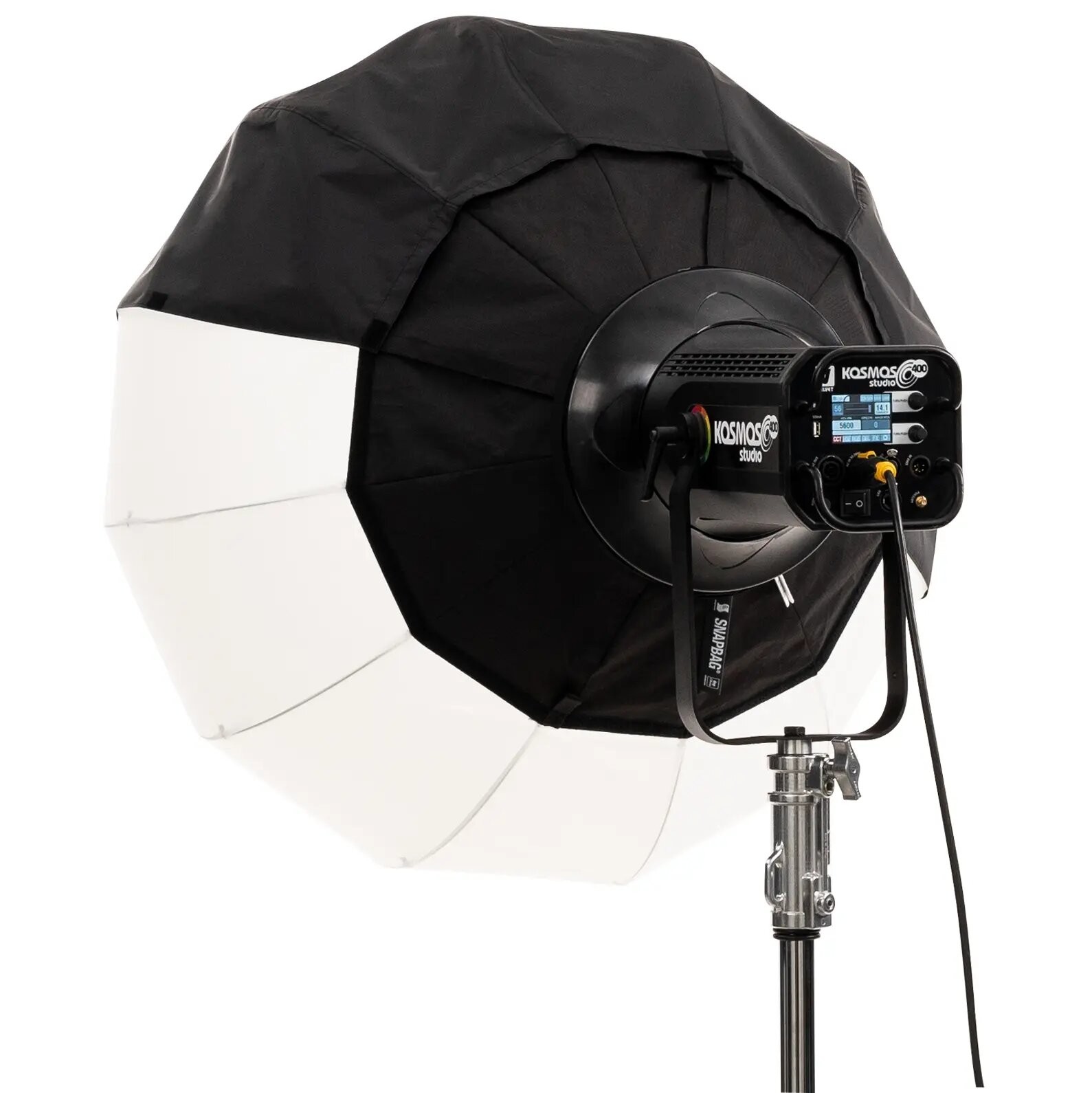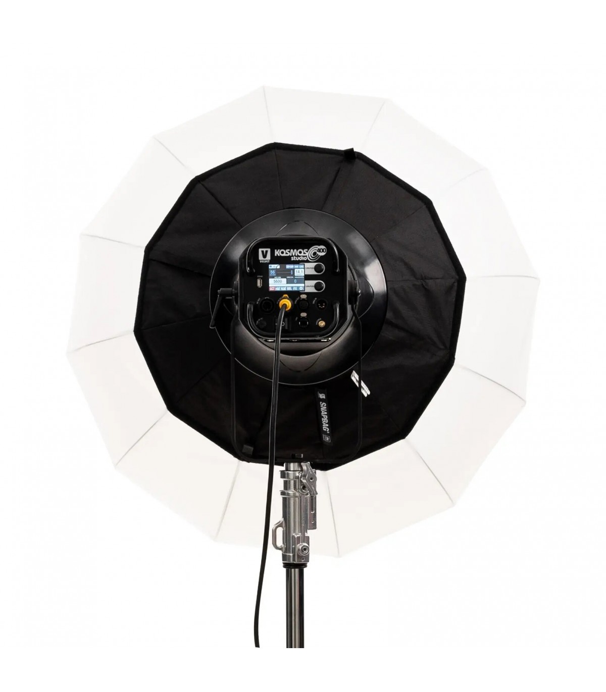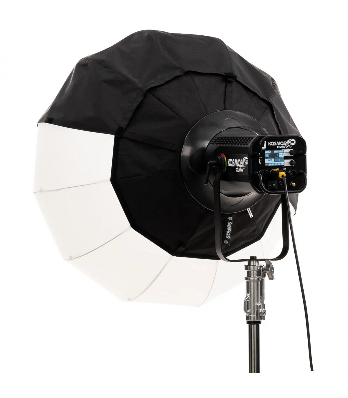 Caja de luz SNAPBAG® Lantern L de DoPchoice, circular de 100cm y 80cm de profundidad, para el proyector Velvet Kosmos 400. También conocida como lantern o lámpara china. Suaviza la luz y produce una amplia área de relleno suave, circular y envolvente; reduce 2 stops. Incluye caja de luz, difusor externo Magic Cloth de 2 stops, 2 tapas traseras de 90º y bolsa de transporte. Se monta directamente en el panel. Indicada para luz cenital o muy alta y dispersa para cobertura 340º.