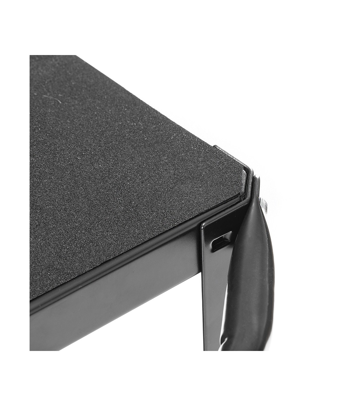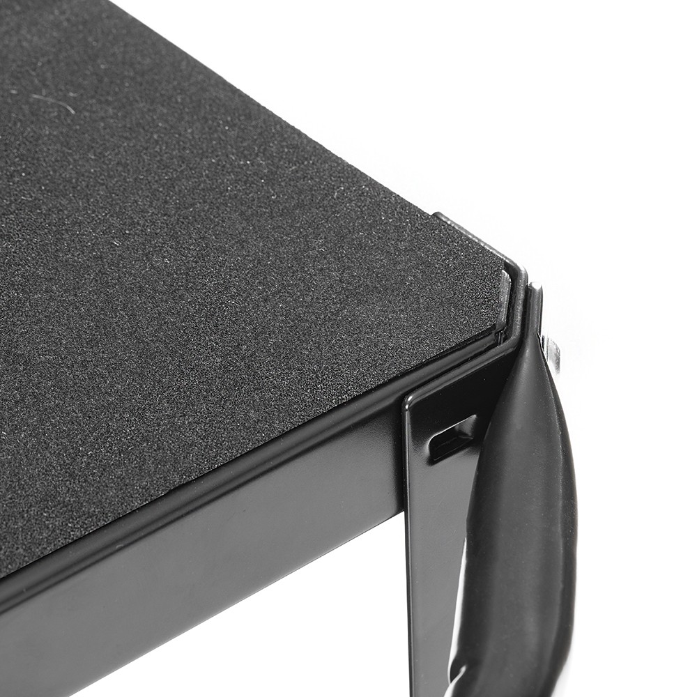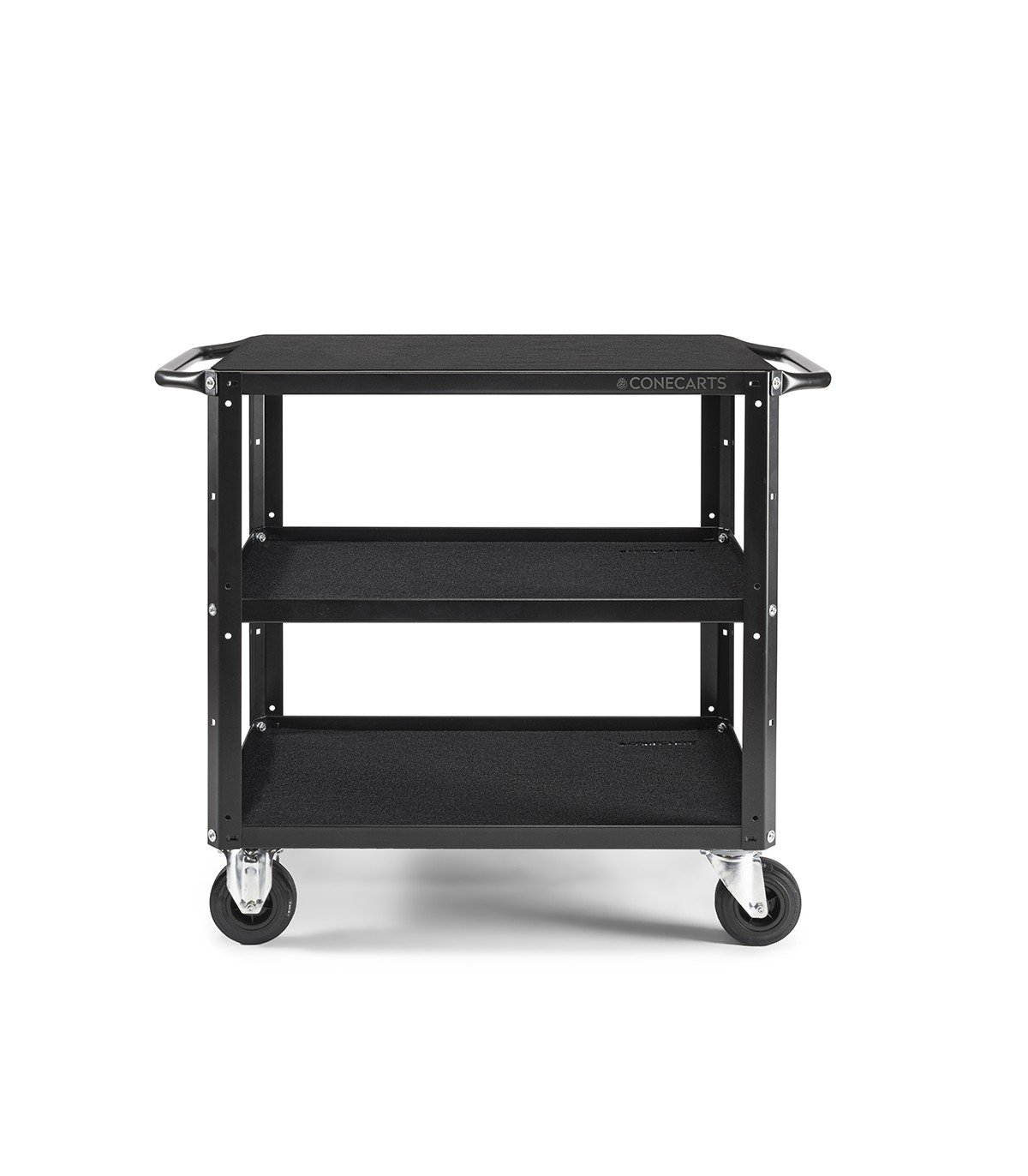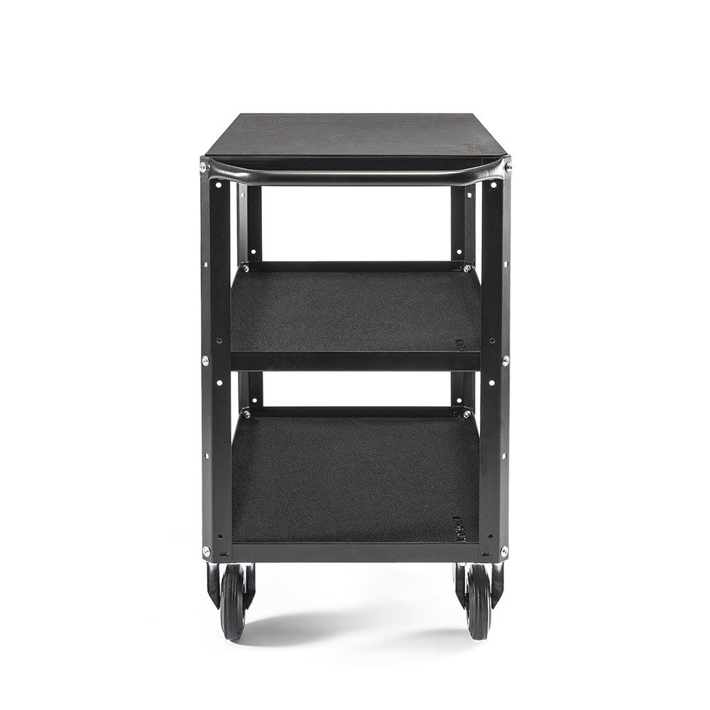 Carro workstation para transportar y manipular material de cámara, iluminación y rodajes. Sus medidas son: largo 92cm, ancho 52cm y alto 85cm. El carro está construido en acero pintado de negro, y es fácil de montar; lleva 3 bandejas con moqueta negra y goma, 2 barra de empuje y 4 ruedas de 125mm, dos de ellas móviles, y una con freno. Ideal para todos los usos: carro de cámara, DIT, iluminación, grip, taller electrónico, mecánico, almacén, logística.
