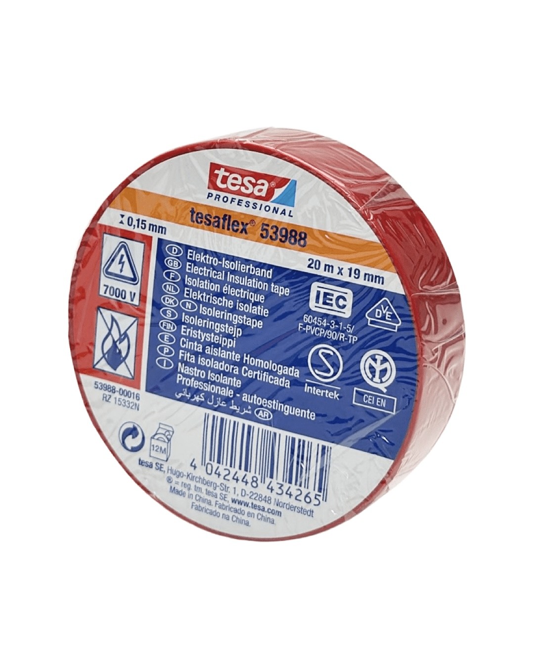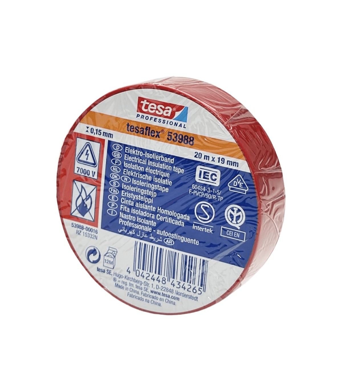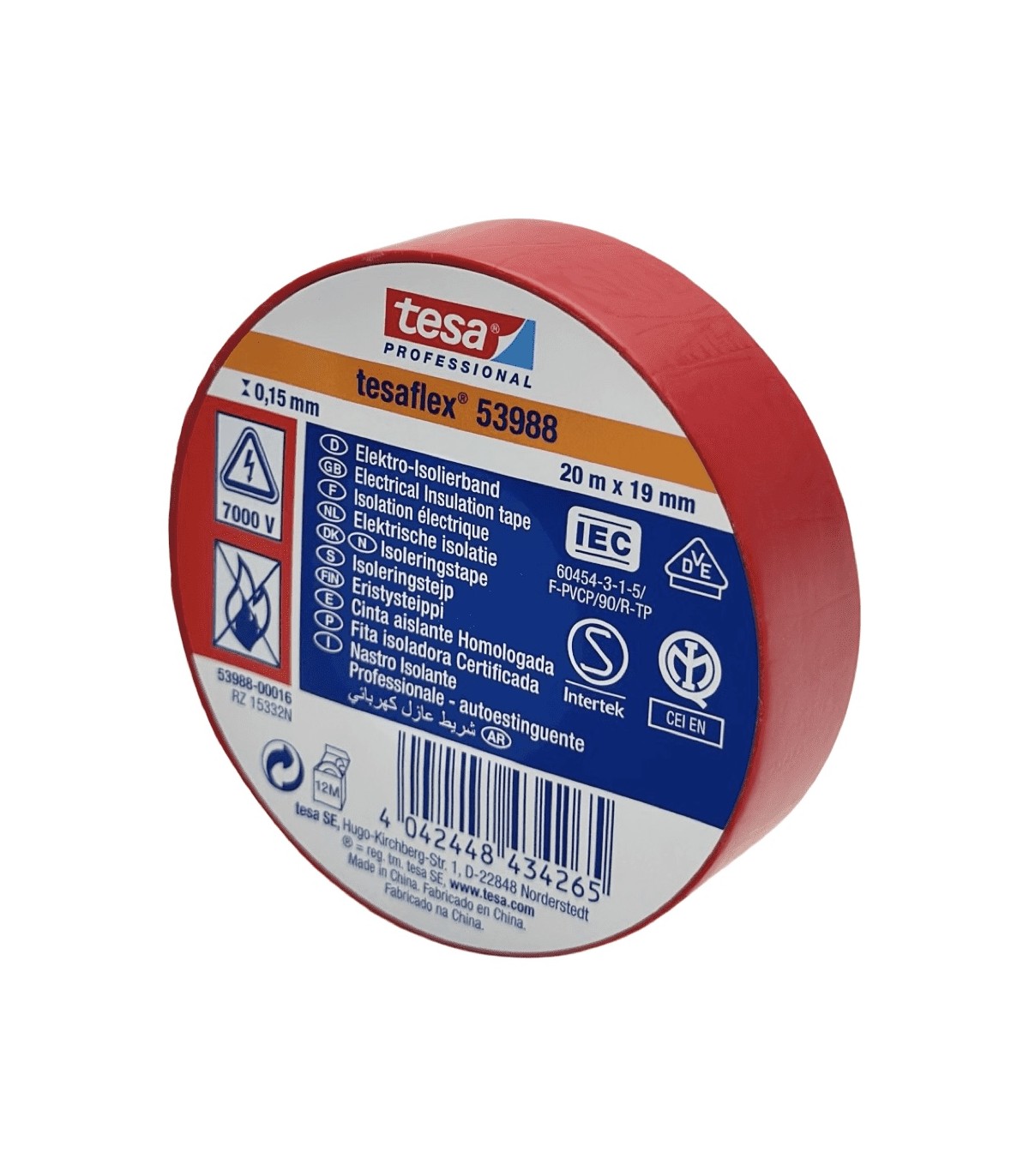 Cinta adhesiva Aislante roja; ancho 2cm; rollo de 20m. La cinta de la serie 53988 de PVC es la ayuda fiable para electricistas, eléctric@s y mecánic@s. Base de PVC relativamente gruesa, un alto grado de flexibilidad y un rendimiento adhesivo muy bueno, incluso en acero y a bajas temperaturas. La cinta aislante de PVC no es solo adecuada para aislar y marcar cables, sino también para reparaciones y encintar mangueras eléctricas.