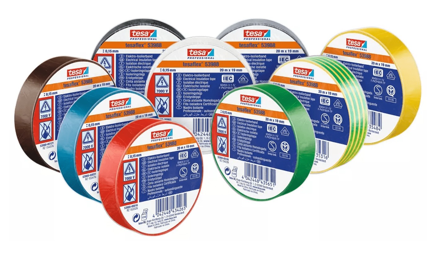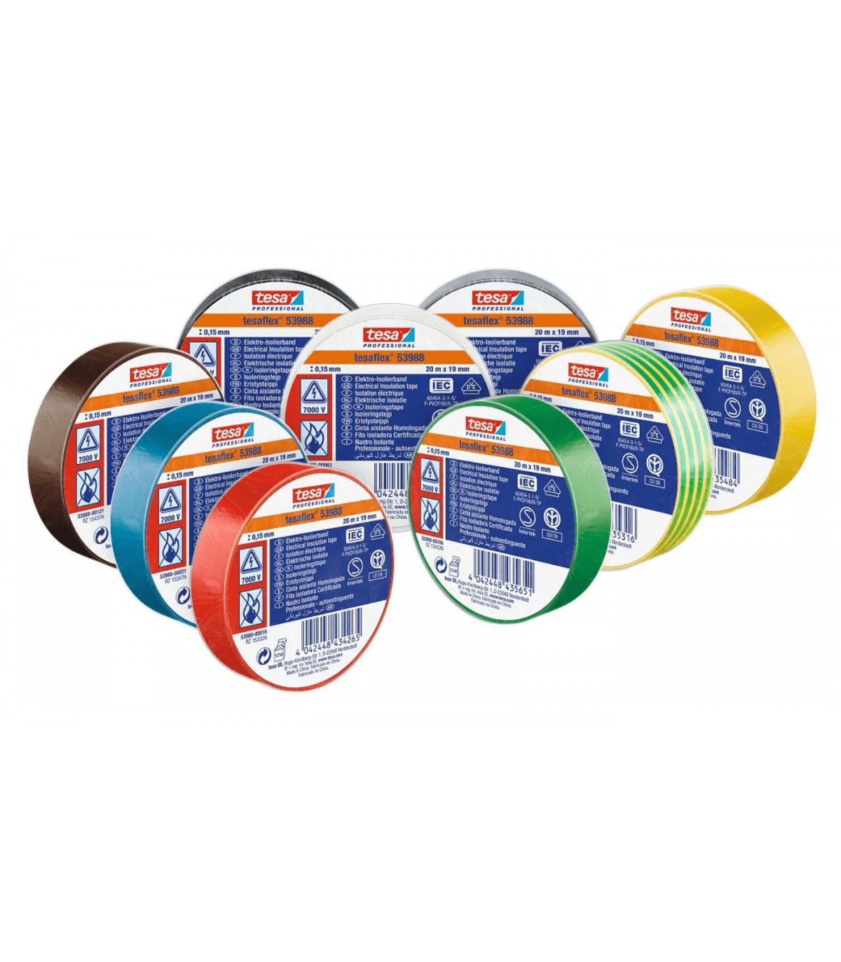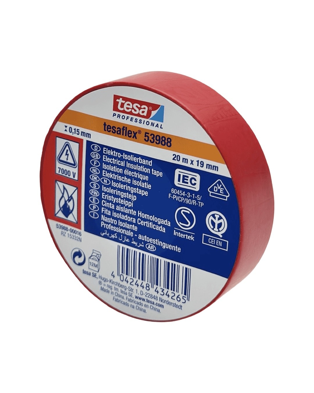 Cinta adhesiva Aislante roja; ancho 2cm; rollo de 20m. La cinta de la serie 53988 de PVC es la ayuda fiable para electricistas, eléctric@s y mecánic@s. Base de PVC relativamente gruesa, un alto grado de flexibilidad y un rendimiento adhesivo muy bueno, incluso en acero y a bajas temperaturas. La cinta aislante de PVC no es solo adecuada para aislar y marcar cables, sino también para reparaciones y encintar mangueras eléctricas.