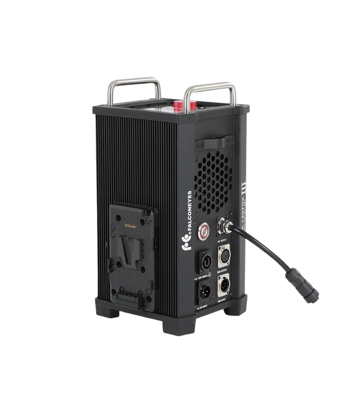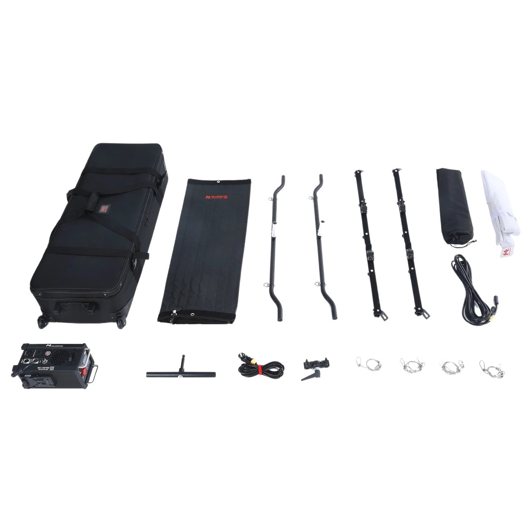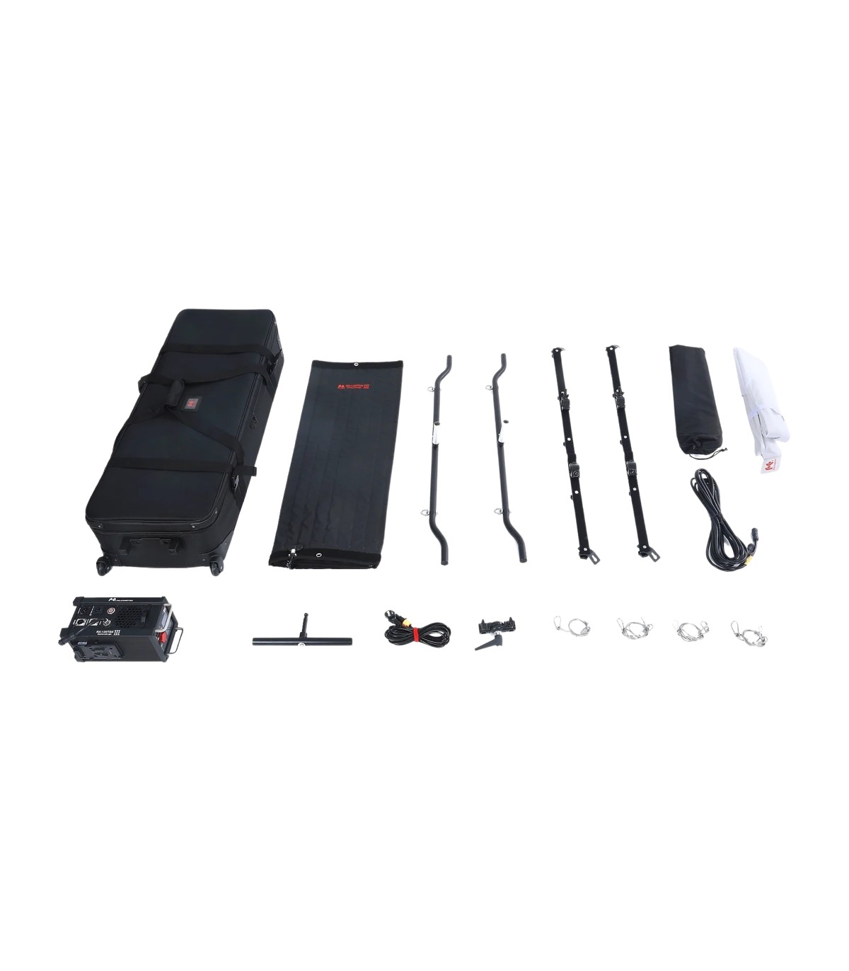 Panel flexible Rollflex III (RX-120TDX III) de 680W LED matricial Bicolor 3000K a 5600K, wireless DMX, de Falcon Eyes. Sus características principales son la ligereza y la flexibilidad, pero al ser panel matricial genera multisombras si lo ponemos cerca de un objeto a una pared, por esa razón viene con una caja de luz para convertirlo en softlight con sombra medio suave, haz 75º. Modos de trabajo: CCT y efectos. Incluye panel de 680W con brazo soporte, caja de luz, nido de abeja (eggrate), control DMX, adaptador V-Lock, cable a cabeza, cable alimentación, 2 adaptadores de montaje y maleta con ruedas de transporte. Datos fotométricos a 5600K: SIN caja de luz: 34.100 Lux a 0.5m, 15.500 a 1m, 5.140 a 2m, 2.680 a 3m. Indicado para andar liger@ de equipaje y tener siempre un recurso a mano para una esquina, un personaje sentado en una mesa, en un coche...