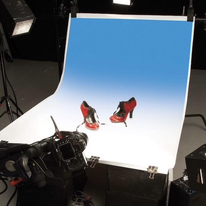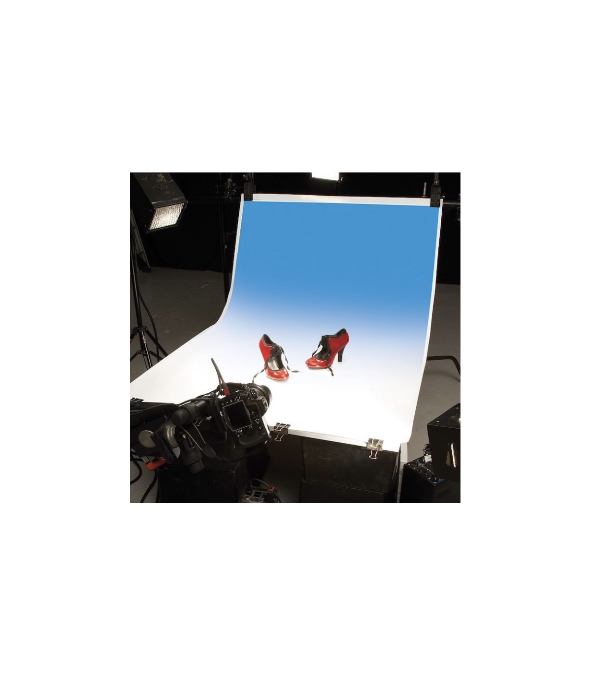 Fondo fotográfico Colorgrad de cartulina de color degradado de blanco a cielo (315) de Colorama. Papel de alta calidad, con superficie no reflectante. Usado habitualmente para fotografía de producto. Colorama es el fondo más popular entre los fotógrafos y Colorgrad es su gama de fondos degradados.