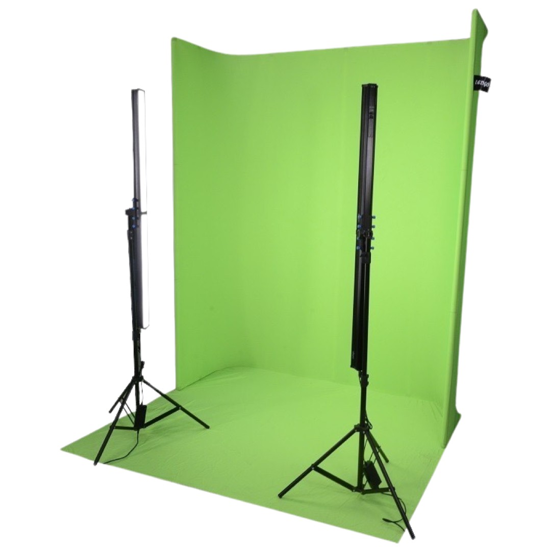 Fondo plegable chroma key verde en "U" con marco. Altura de 220cm y fondo de 180cm, con suelo de 180x180cm. Incluye tela chroma verde, marco y bolsa de transporte.