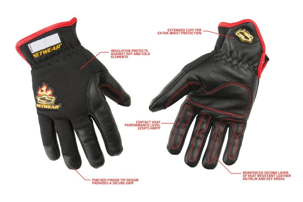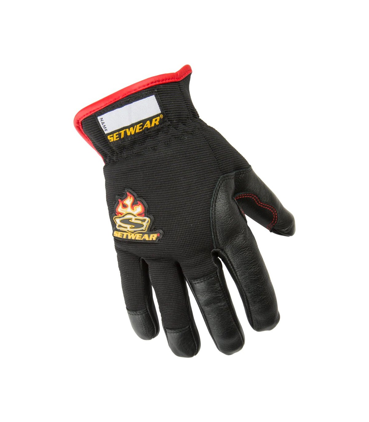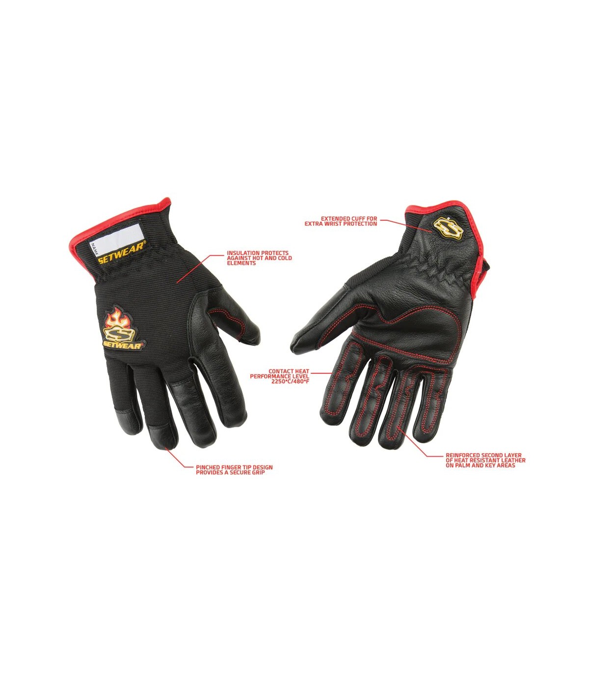 Guantes Hot Hand de piel negra doble capa, con nylon y poliéster, de Setwear. Especial superficies muy calientes. Talla M; ancho palma 6,35cm. Segunda capa reforzada de cuero resistente al calor en la palma de la mano y dedos. Estos guantes de cuero resistente al calor de primera calidad es excelente para los profesionales que trabajan con materiales calientes y proporciona un agarre seguro y una protección superior para las manos. Rendimiento térmico de contacto Nivel 2 hasta 250ºC. Indicado para iluminación, rigging, rapel, rescate, clima frío, etc.