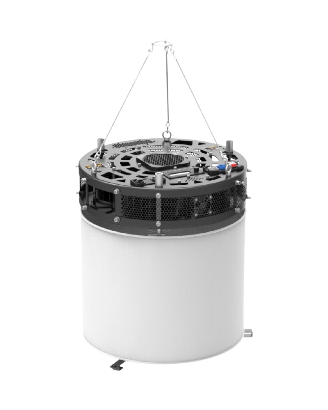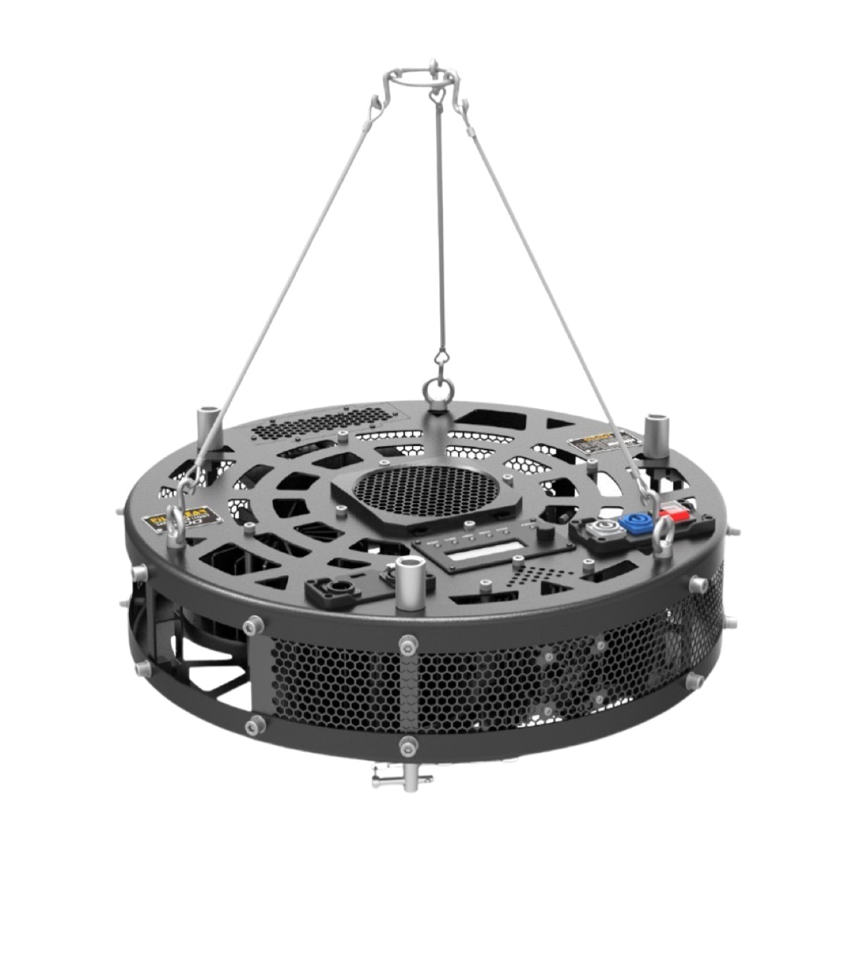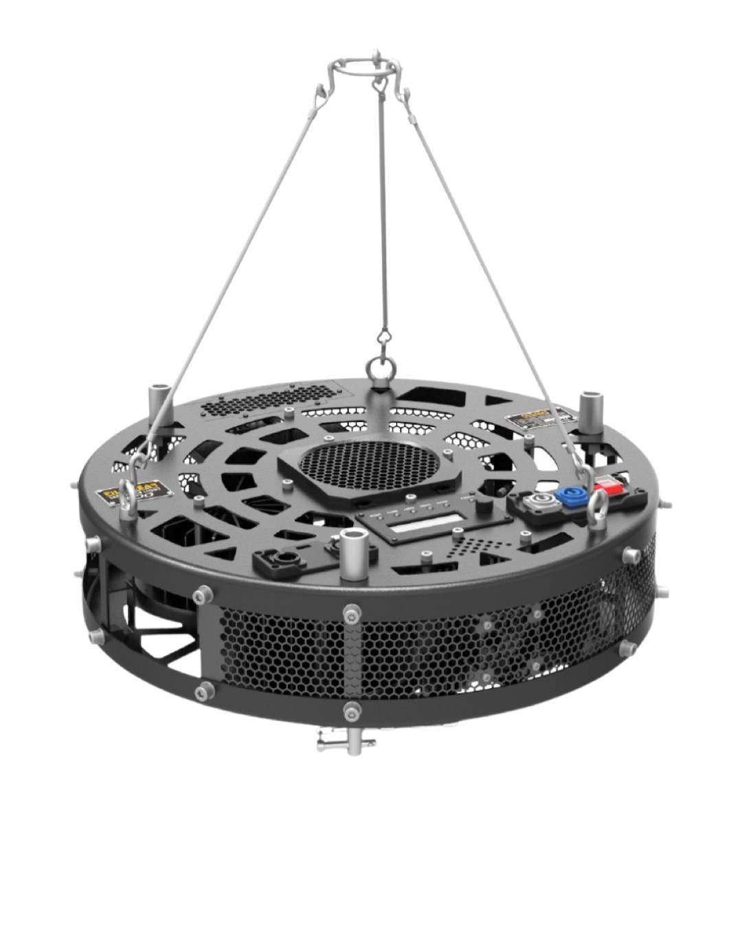 Foco Helios Spacelight 480W LED matricial Bicolor 2700K a 6000K con 4 lentes, DMX; luz suave envolvente con base más dura y lateral más difuminado para relleno. Incluye cabeza 480W con cadenas para cuelgue, cable alimentación AC, tapa difusora, camisa difusora seda y camisa negra faldón. Datos fotométricos a 5600K SIN difusor: 1.620 Lux a 3m, 405 a 6m, 180 a 9m. El spacelight se utiliza colgado del techo y produce una luz de relleno 360º suave y envolvente, controlable con la camisa negra. Indicado para plató de media altura.