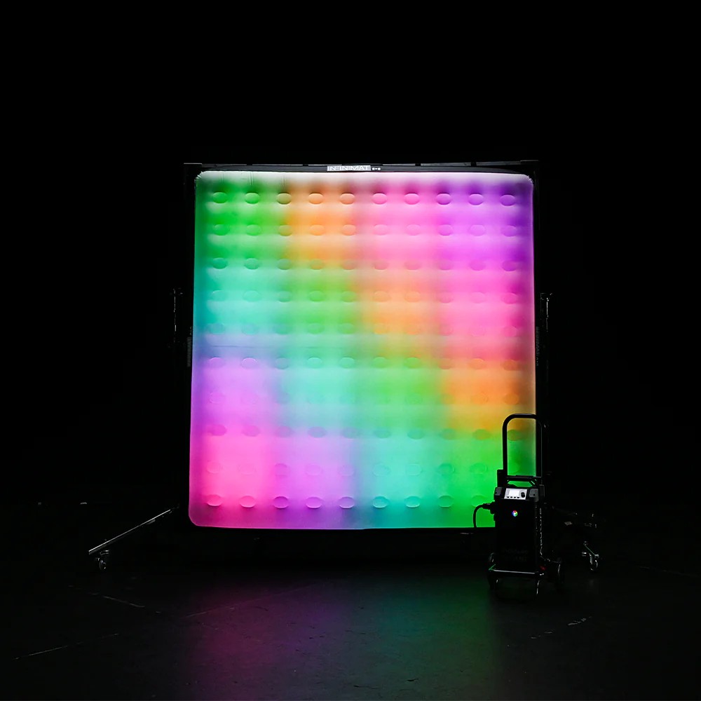Panel hinchable INFINIMAT 8x8' de 1600W, LED matricial RGBWW 2000K a 10000K y wireless DMX. Sus características principales son la ligereza y la flexibilidad, eliminando el problema de las multisombras de los paneles matriciales con su ingeniosa caja de luz hinchable, para convertirlo en softlight con sombra medio suave, haz 45º con eggcrate. Modos de trabajo: CCT con ajuste verde/magenta, HSI, RGB, gelatinas y efectos.