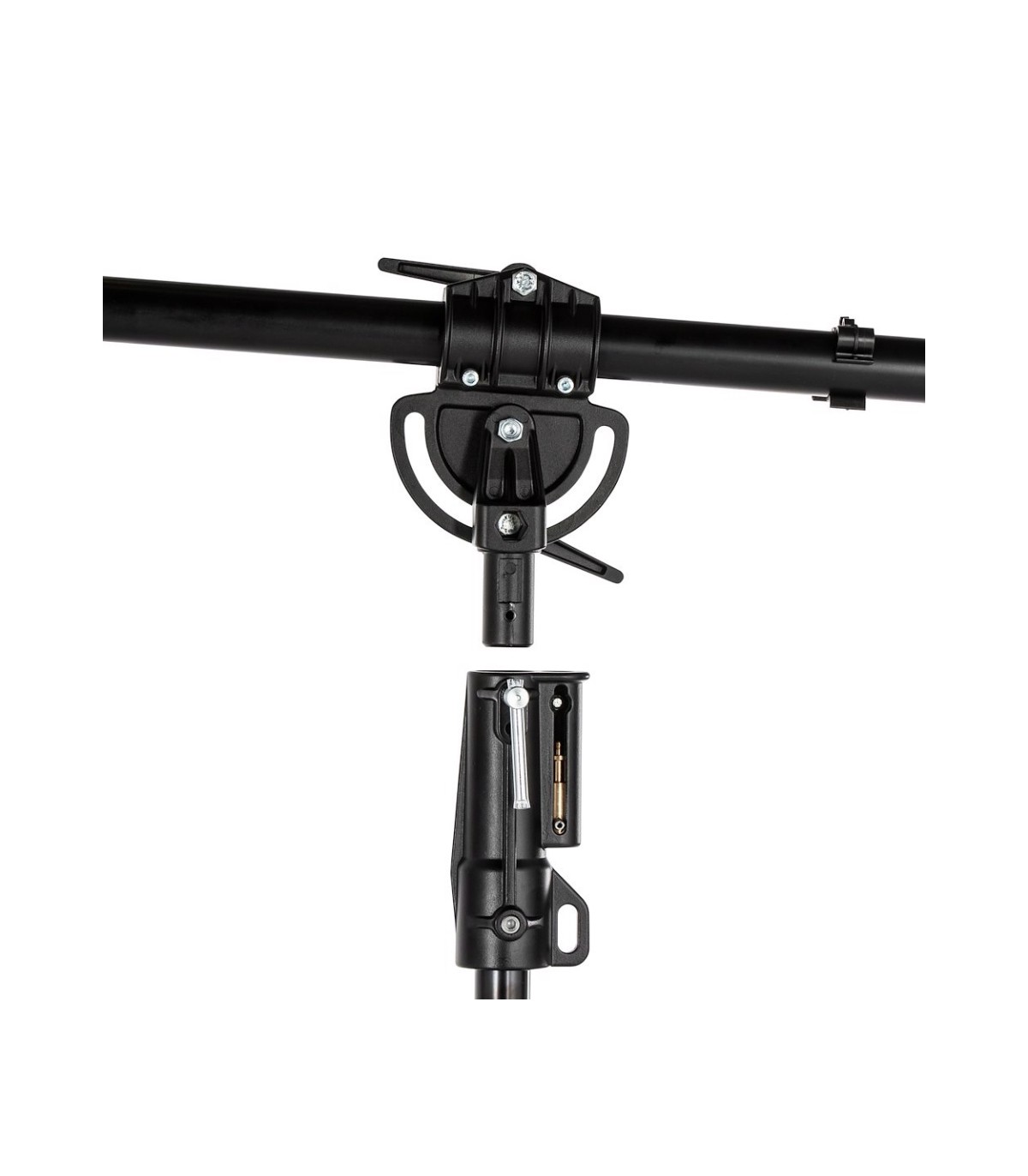 Jirafa Super Boom de aluminio negro, con espárrago 16mm móvil. CON trípode 008CSU con ruedas. Jirafa de 1 sección con pinza basculante 123, contrapeso 022 de 6,7kg y espárrago de 16mm movible desde las manivelas traseras. Medidas de la jirafa: extensión 270cm, alcance máximo desde centro trípode 100cm, alcance minimo desde centro trípode 24cm. Otras medidas: capacidad 5kg, peso (sin contrapeso) 4,1kg. Indicado para alcanzar posiciones difíciles con un foco o panel y poder direccionarlo desde la parte trasera.