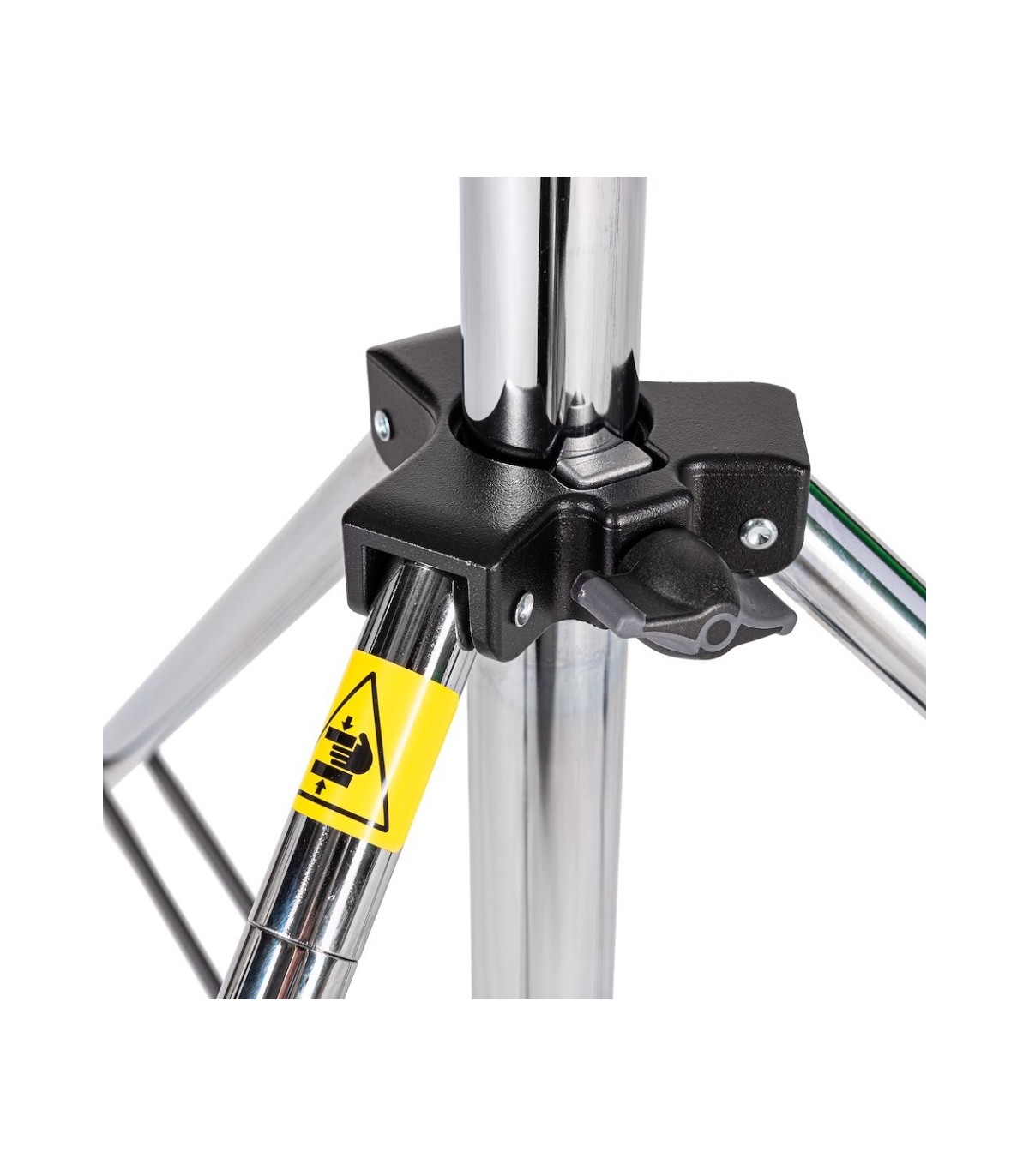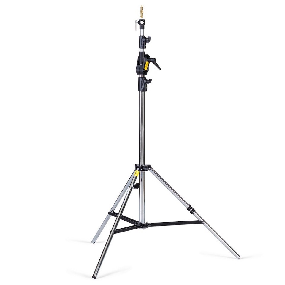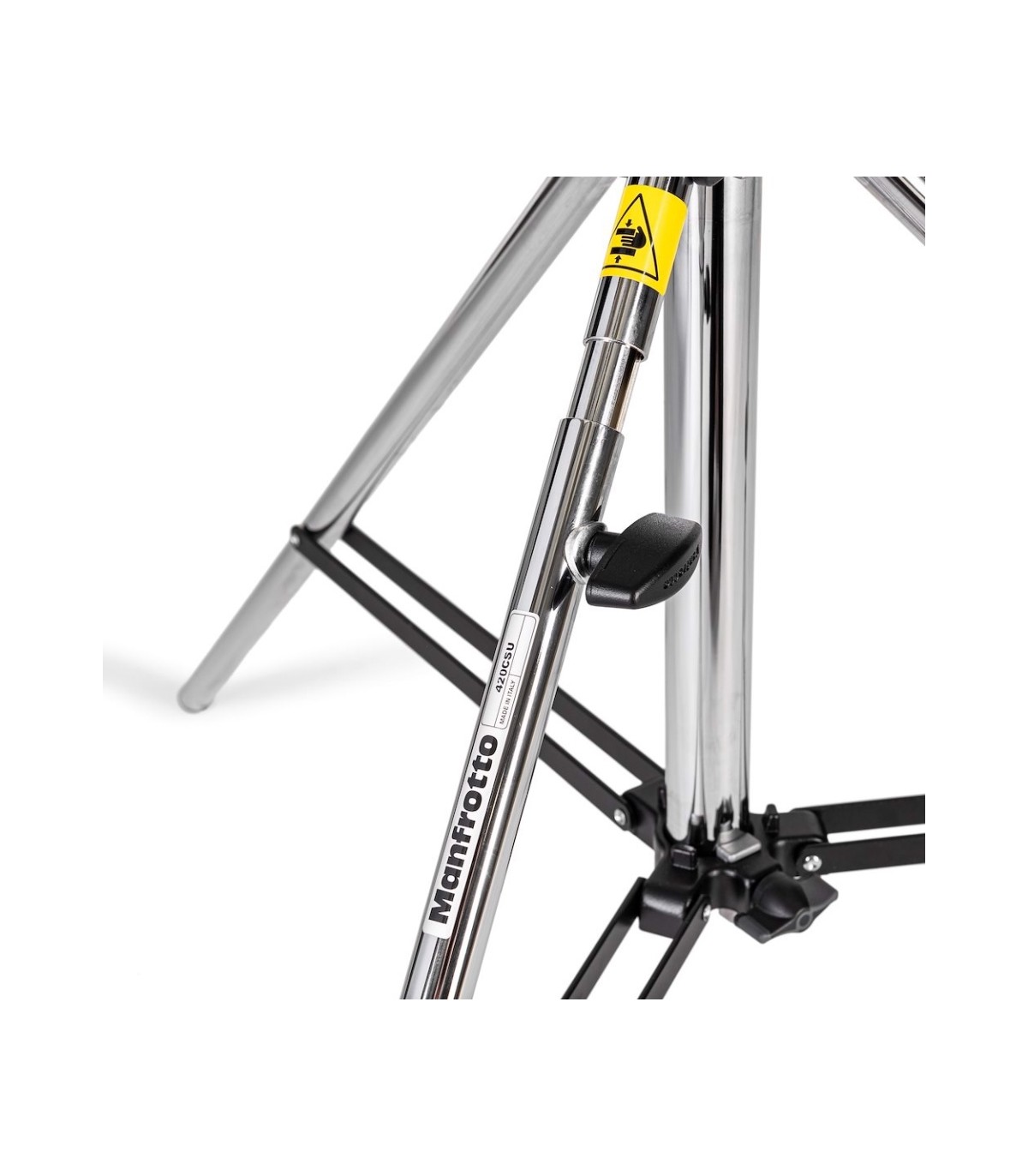 Trípode Combi Boom de acero cromado y aluminio, convertible a jirafa, con manguito 16mm con palometa y espárrago 16mm (013), y saco contrapeso vacío. Trípode de 4 secciones (3 extensiones); las dos últimas de aluminio convertibles en jirafa. Alturas trípode: máxima 392cm, mínima 131cm, plegado 113cm. Otras medidas trípode: diámetro huella 109cm, capacidad 12kg, peso 5,6kg. Otras medidas en modo jirafa: extensión máxima 191cm, extensión mínima 19cm, capacidad con extensión máxima y contrapesada 5kg. Este es el trípode jirafa dos en uno para focos o paneles pequeños.