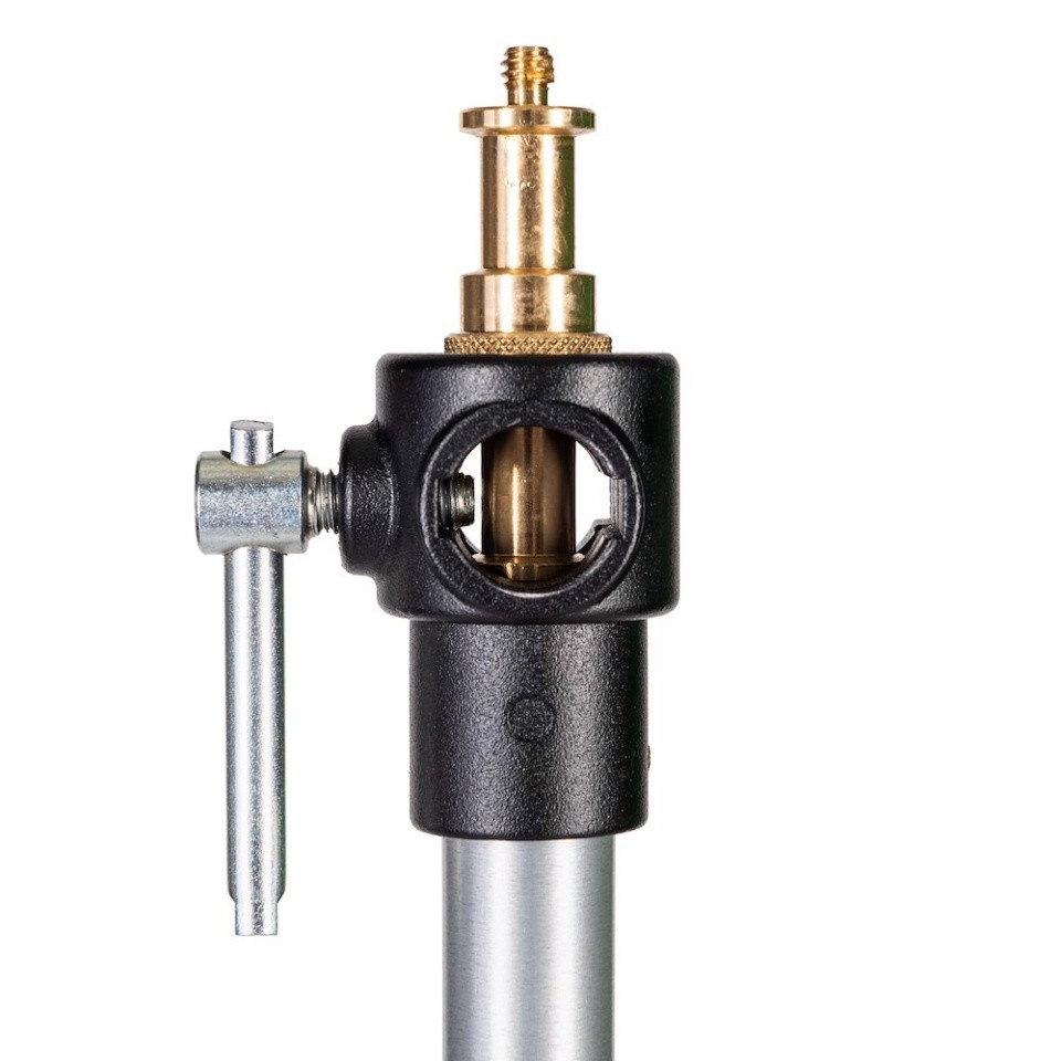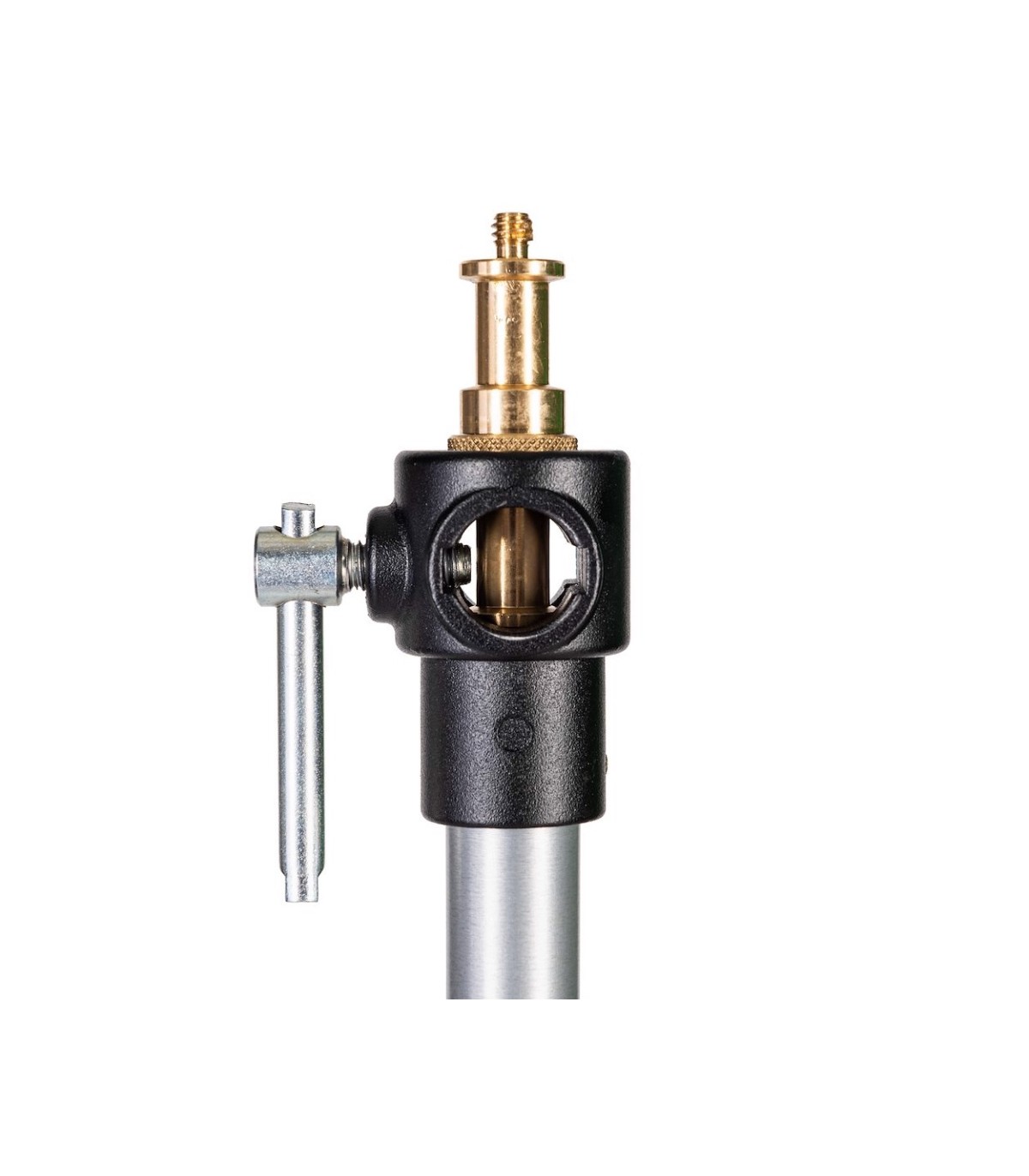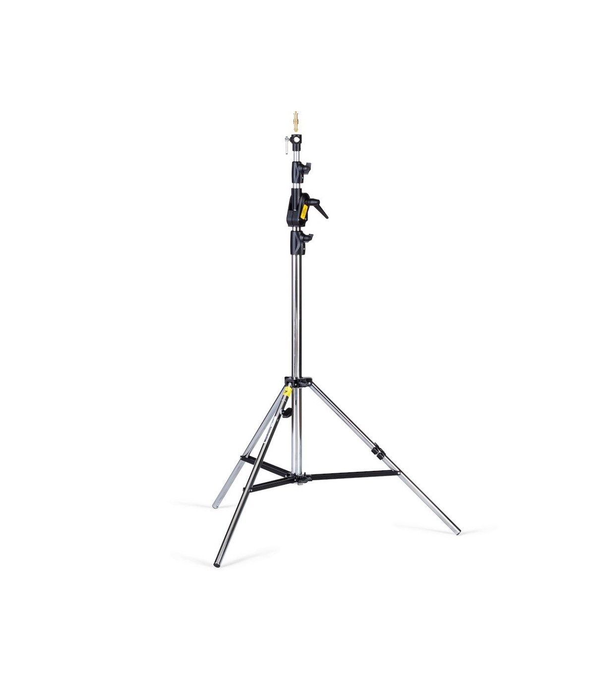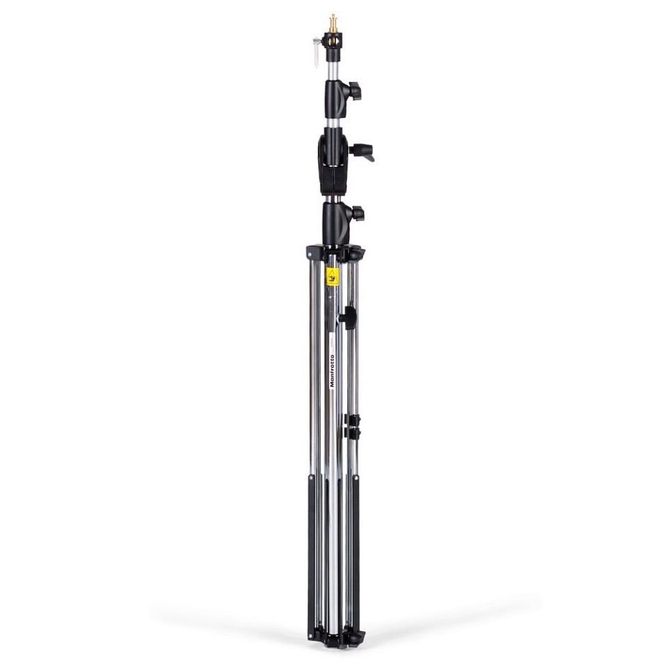 Trípode Combi Boom de acero cromado y aluminio, convertible a jirafa, con manguito 16mm con palometa y espárrago 16mm (013), y saco contrapeso vacío. Trípode de 4 secciones (3 extensiones); las dos últimas de aluminio convertibles en jirafa. Alturas trípode: máxima 392cm, mínima 131cm, plegado 113cm. Otras medidas trípode: diámetro huella 109cm, capacidad 12kg, peso 5,6kg. Otras medidas en modo jirafa: extensión máxima 191cm, extensión mínima 19cm, capacidad con extensión máxima y contrapesada 5kg. Este es el trípode jirafa dos en uno para focos o paneles pequeños.