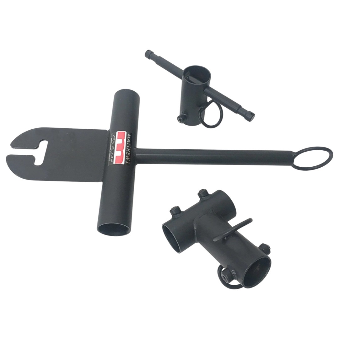 Kit montaje para jirafa Menace en acero negro, para tubo de diámetro 42mm. Incluye adaptador T para la trasera, adaptador T con 2 espárragos 16mm para la delantera y un adaptador central para tirante y basculante. NO incluye tubos; NO incluye rótula basculante. Peso: 2,7kg. Matthews, también conocida como MSE, es la marca americana de referencia en la industria del cine.