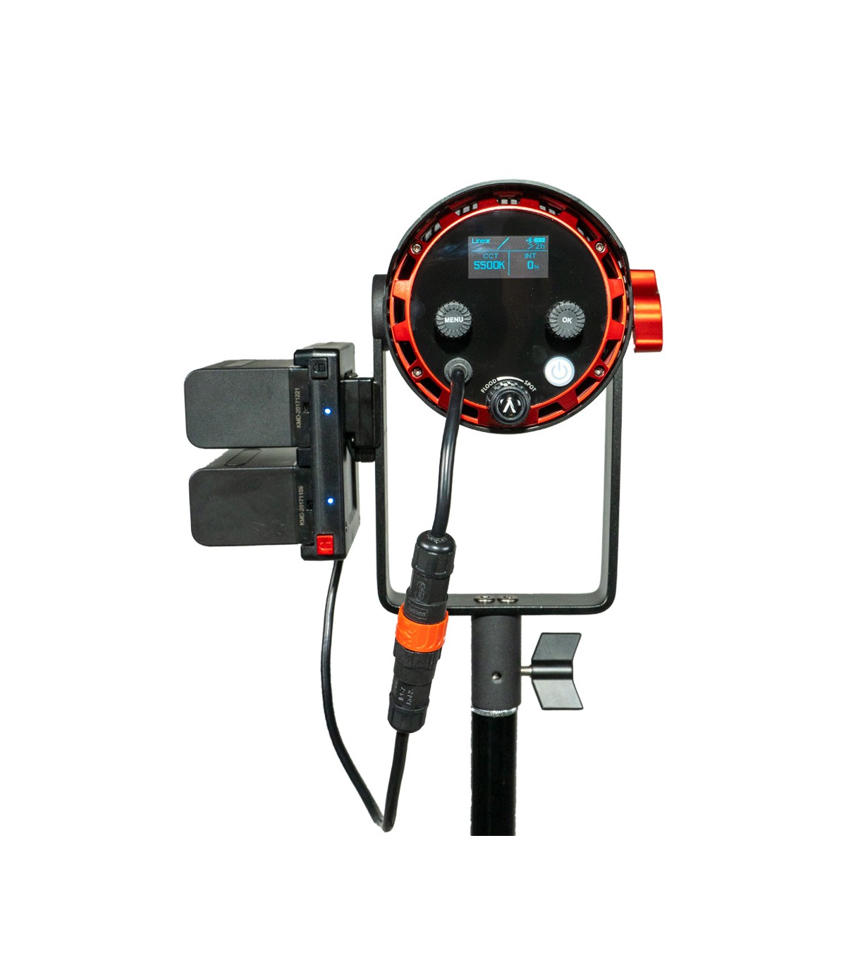 Incluye cabeza 60W con horquilla, visera 8 hojas, adaptador Bowens, adaptador a 2 baterías NP, cable D-Tap, cable alimentación AC y maleta transporte. Datos fotométricos a 5600K: spot 15º: 30.000 Lux a 1m, 3.800 a 3m, 1.300 a 5m; flood 45º: 5.200 Lux a 1m, 630 a 3m, 240 a 5m.