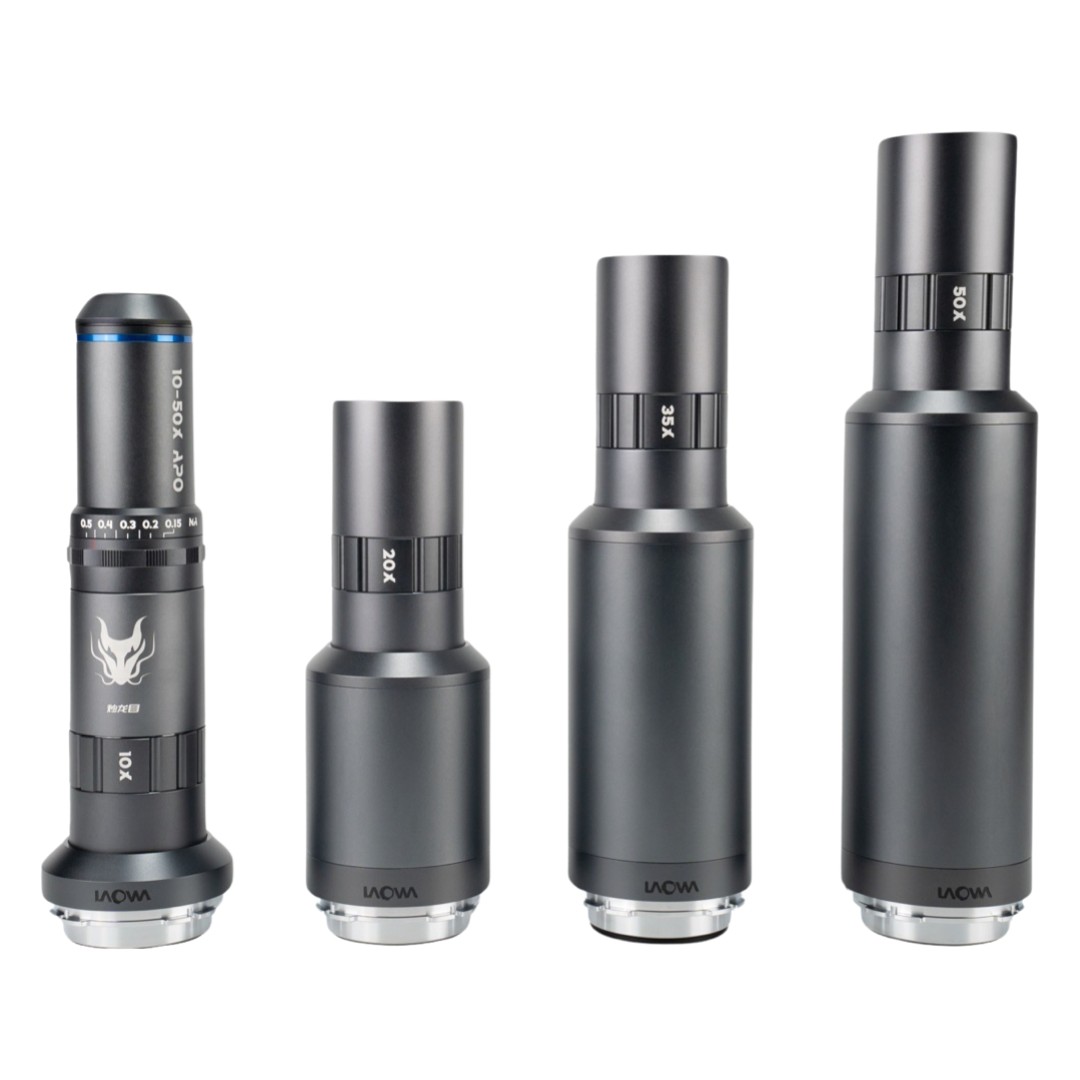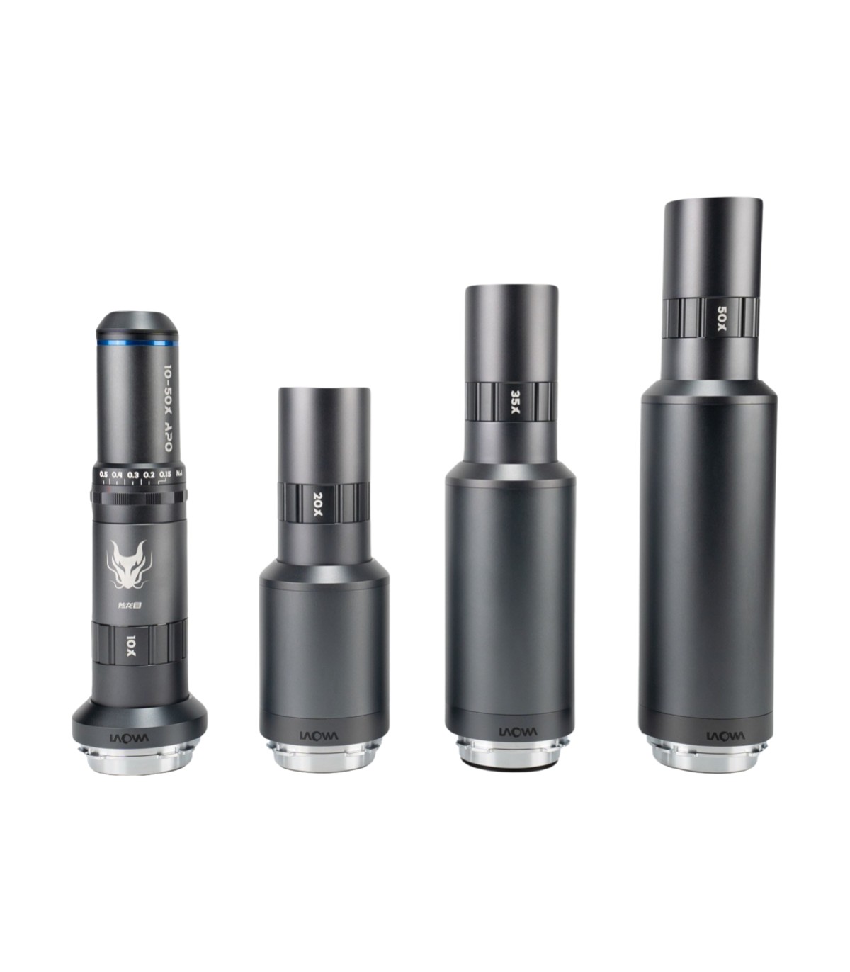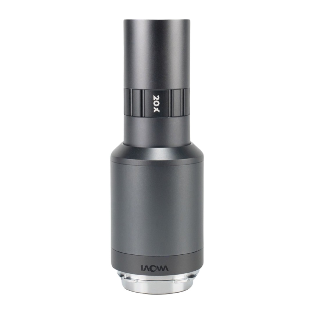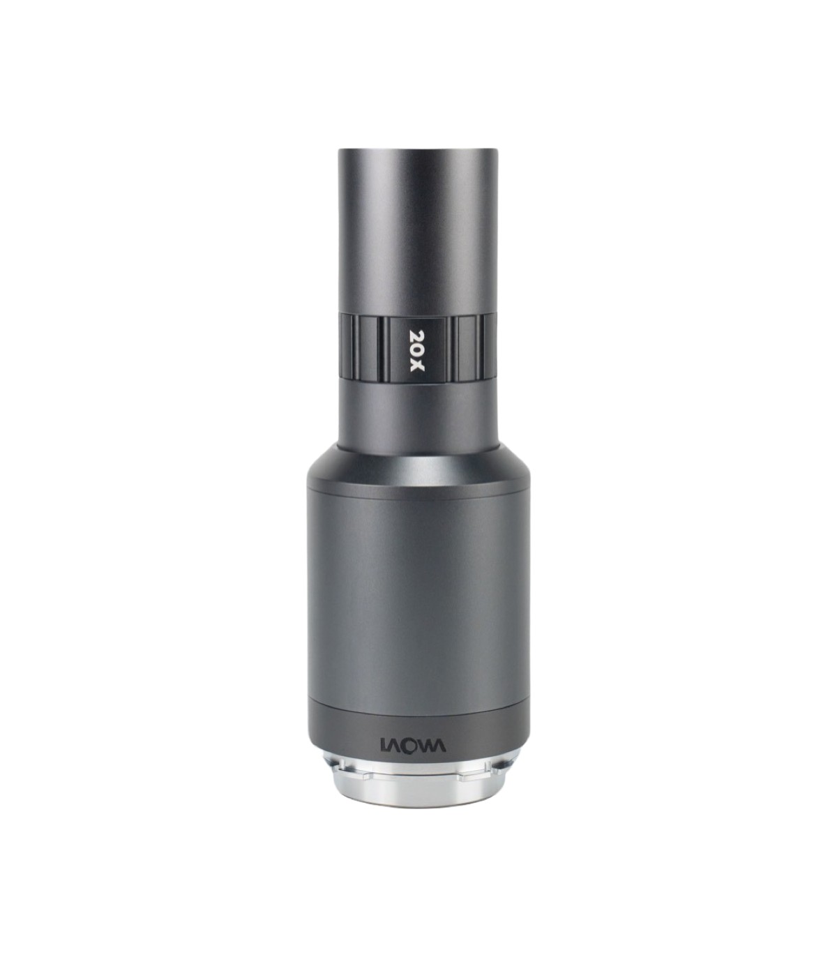 Óptica cámara para cine. Laowa Aurogon 20mm Full Frame 10/20/30/50x supermicro con montura PL de Arri; incluye maleta. La Aurogón es una óptica APO supermicroscópica con un juego de extensiones de 10, 20, 30 y 50 aumentos para el mercado de sensor Full Frame. Distancia de trabajo 20mm para tomas microscópicas, lo que brinda más oportunidades para ver en movimiento la antena de una hormiga o los ojos de una araña.