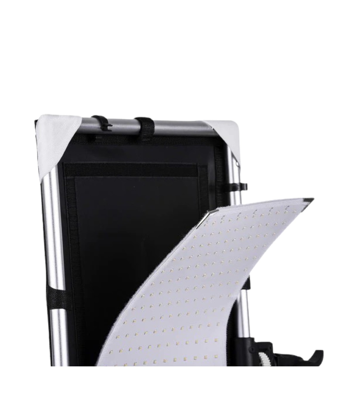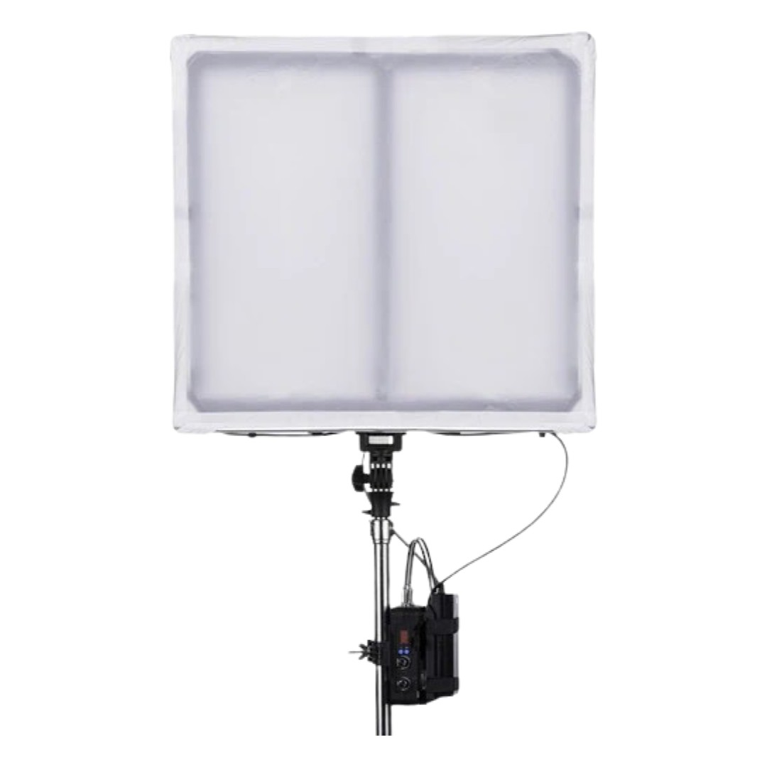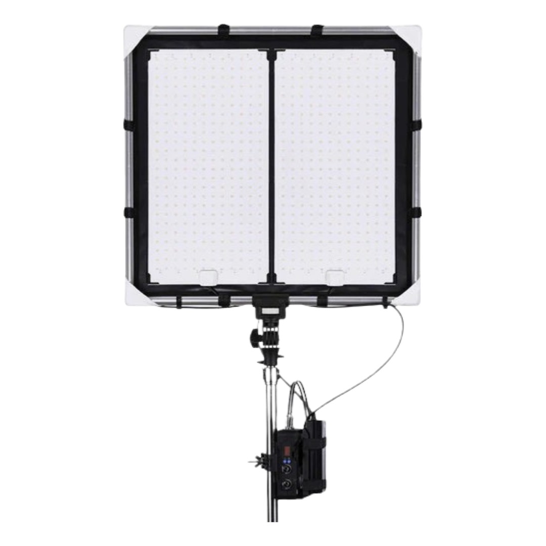 Kit 2 paneles flexibles Versatile de 29W LED matricial Bicolor 3200K a 5600K, DMX, 120º, de LEDGO. Sus características principales son la ligereza y la flexibilidad. Modo de trabajo: CCT. Incluye 2 paneles de 29W de 51x26mm con marco clásico "cuadrado" de 60x60cm, rótula tilt-top con manguito 16mm, difusor, trasera negra, control AC/DC con V-Lock, 2 cables a cabeza de 1,5m, cable alimentación, fuente de alimentación, adaptador V-Lock y maleta de lona para transporte. Datos fotométricos por panel a 5600K: SIN difusor: 1.690 Lux a 1m. Indicado para andar liger@ de equipaje y tener siempre un recurso a mano para una esquina, un personaje sentado en una mesa, en un coche...