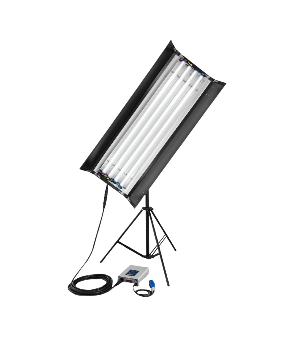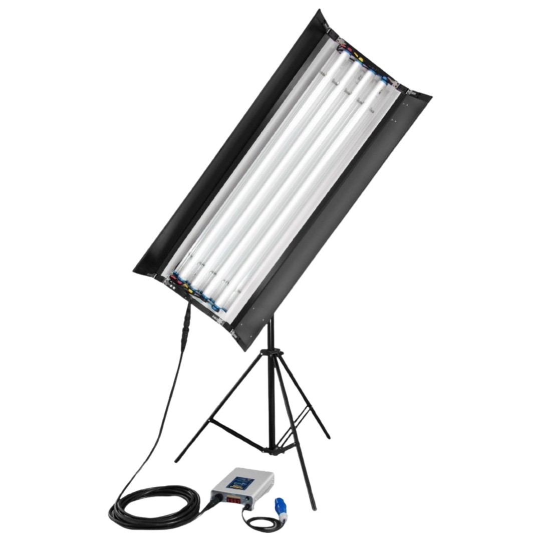 Panel FloBox para 4 tubos Kino 4' (no incluidos) de FilmGear. Modo de trabajo: CCT. Consigue una luz suave con sombra poco marcada. Incluye panel con viseras 2 hojas, montura K, eggcrate, arnés eléctrico, cable a cabeza de 7m, control AC, cable de alimentación. Datos fotométricos a 5600K: 2.670 Lux a 1m, 700 a 2m, 382 a 3m.