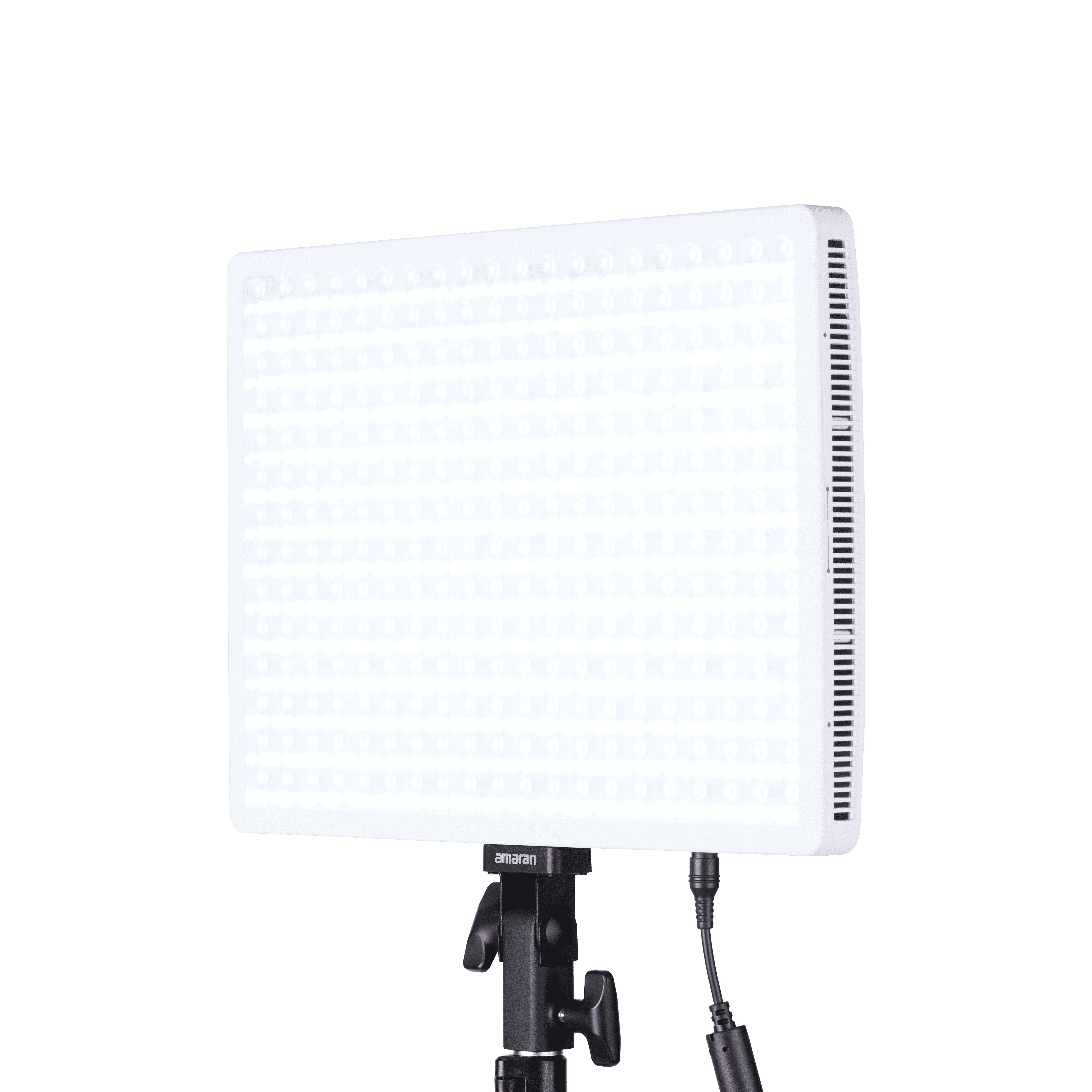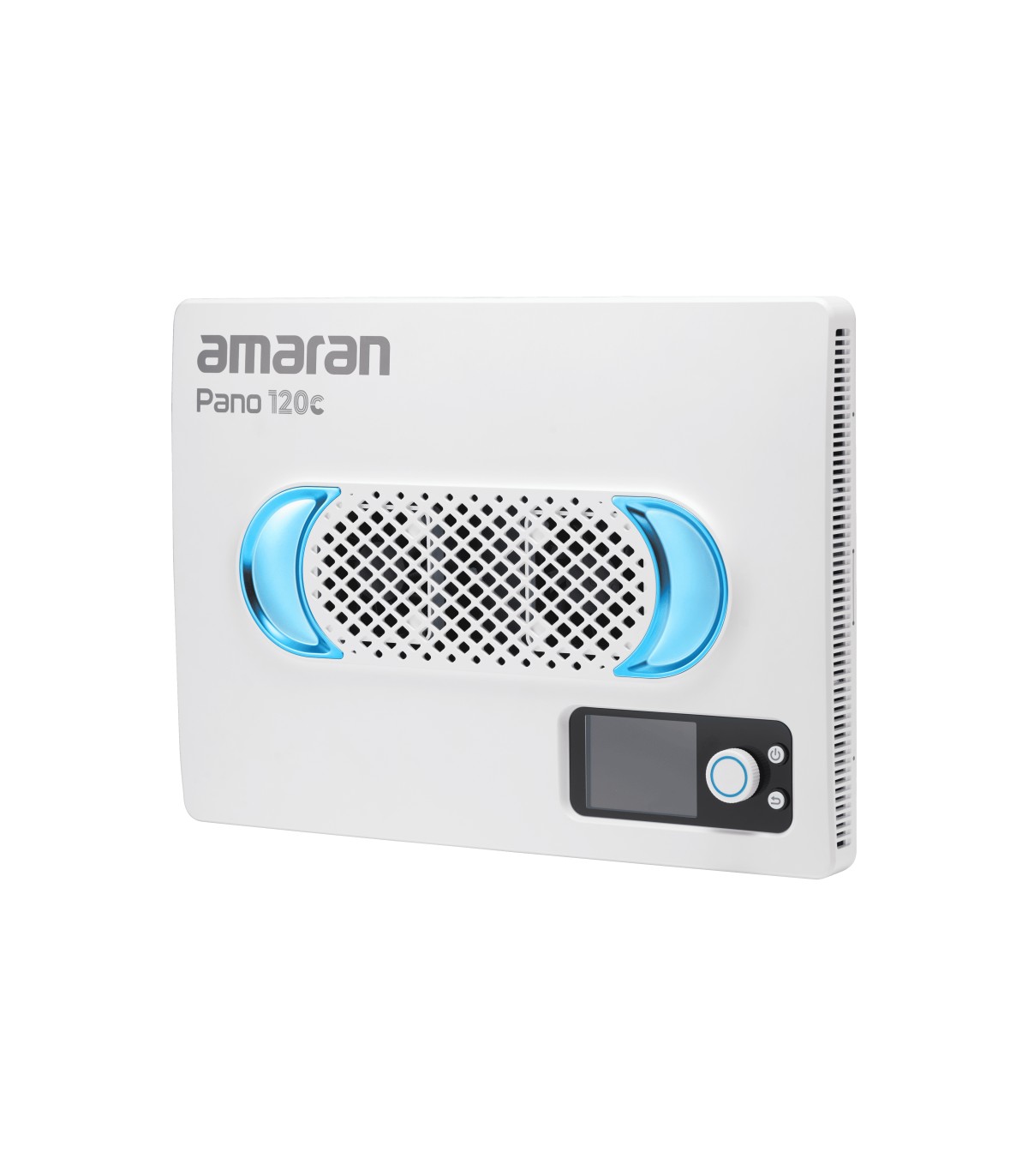 Panel Amaran Pano 120c de 120W, con LED matricial RGBWW 2,300K a 10,000K (1,800K a 20,000K con modo CCT+), en color blanco. Panel compacto y portátil (35,5 x 25,6cm; 1,6kg), con modo de ventilador silencioso o inteligente. Modos de trabajo: CCT con ajuste verde/magenta, HSI, gelatinas y 12 efectos (fuegos artificiales, bombilla, paparazzi, fuego, TV, etc).