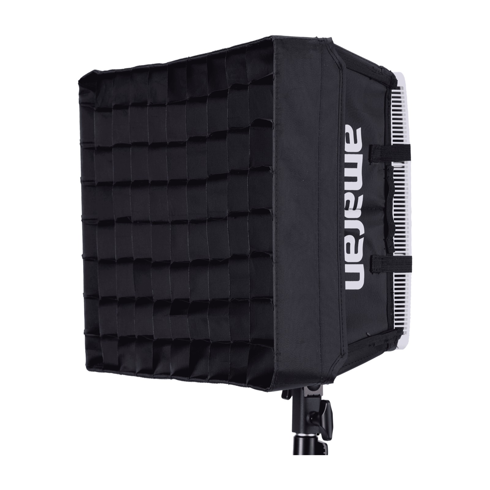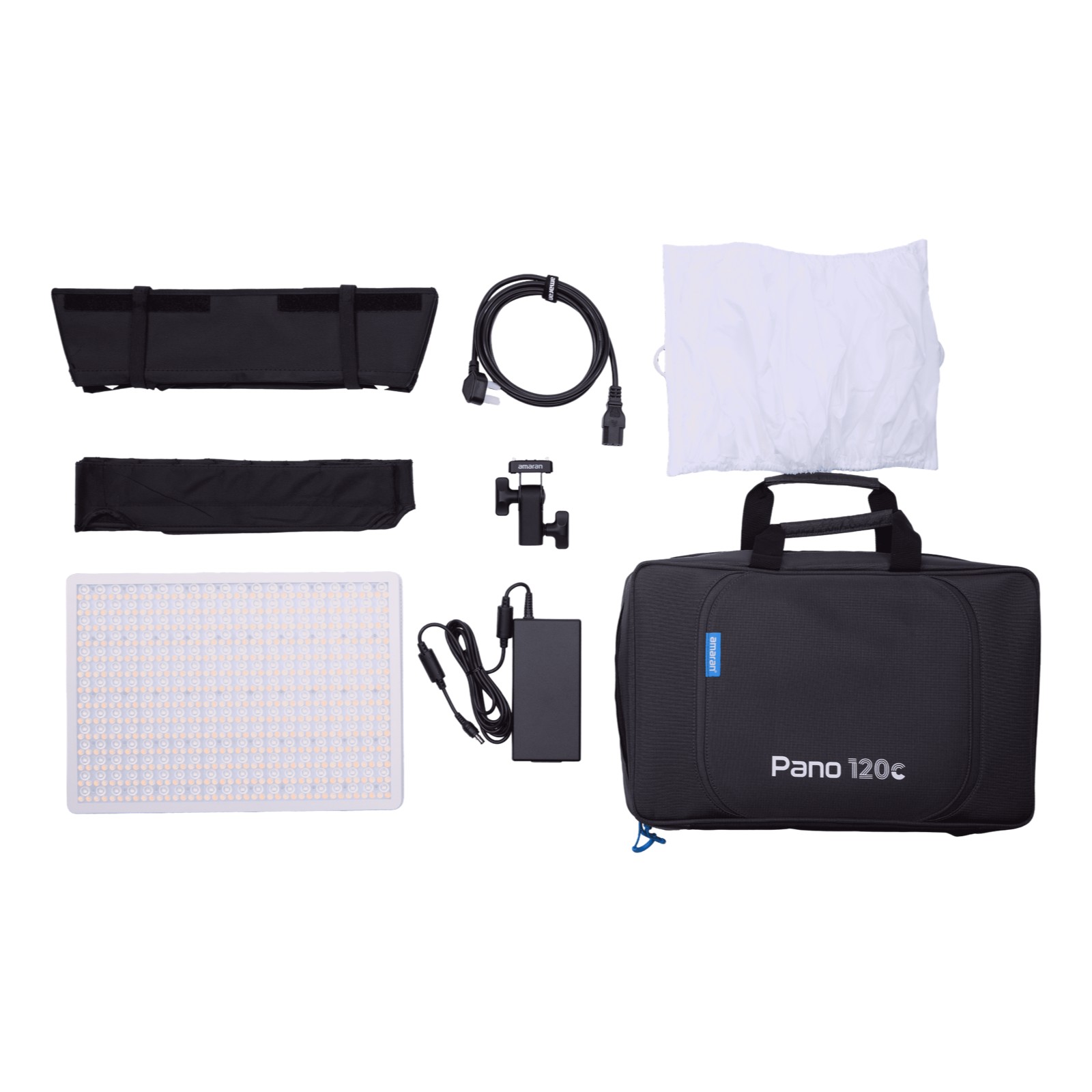 El kit incluye el panel de 120W, caja de luz, nido de abeja, difusor, adaptador amaran Ace Lock (para soporte de iluminación), adaptador de alimentación, cable y bolsa acolchada de transporte.