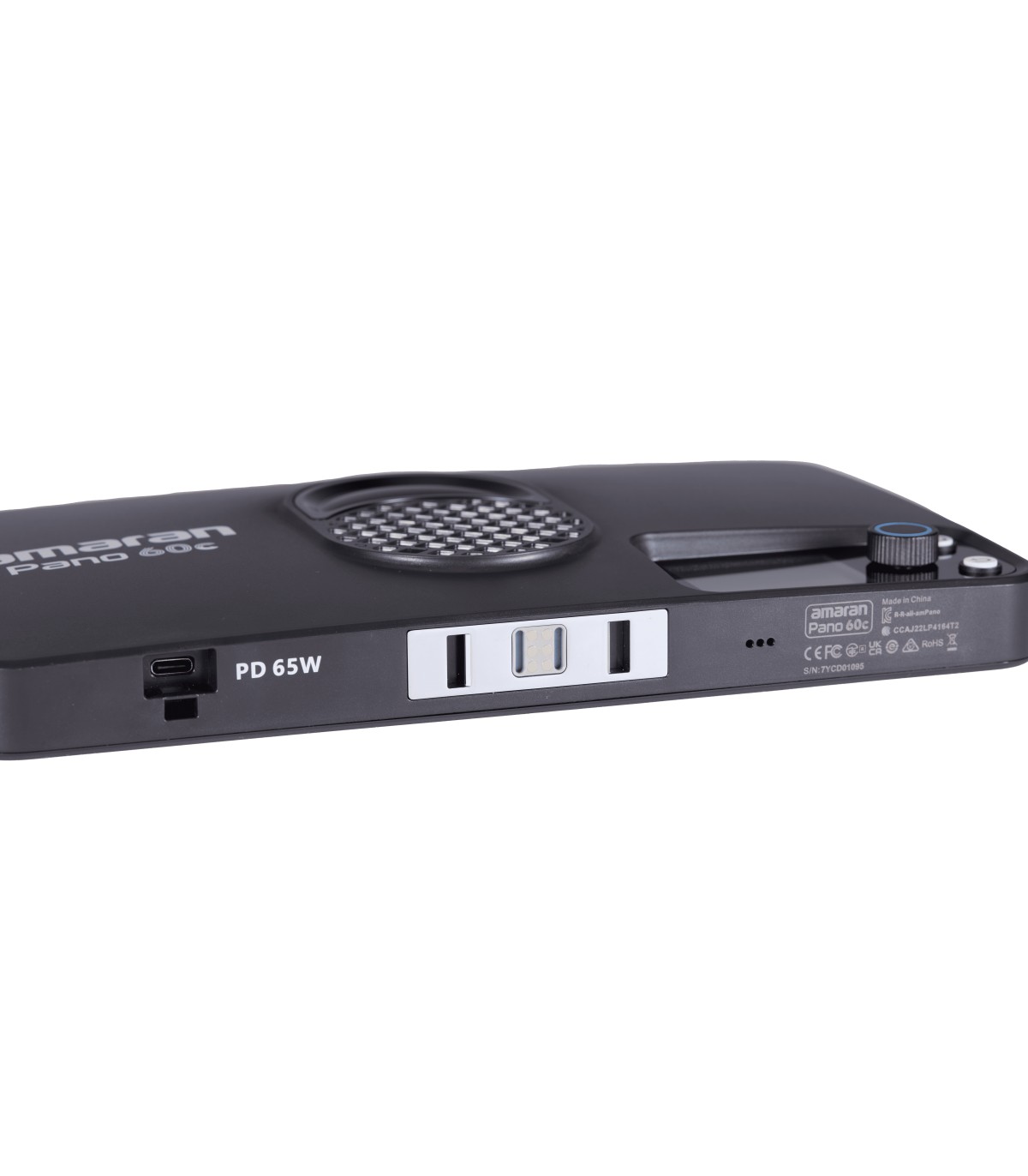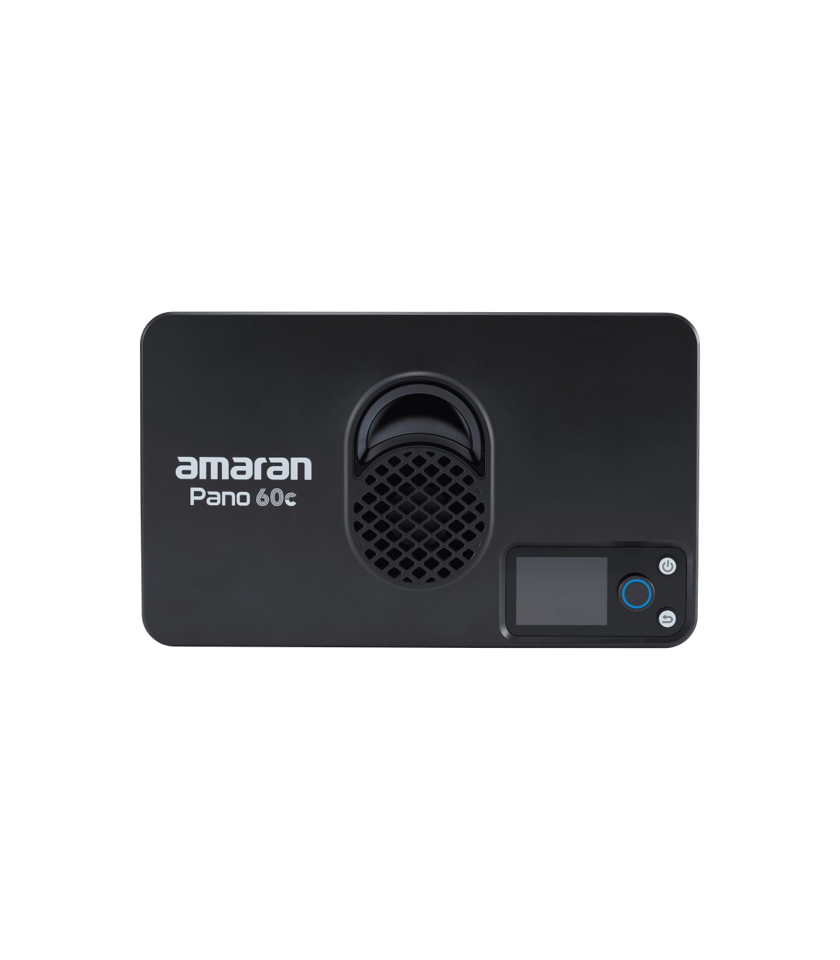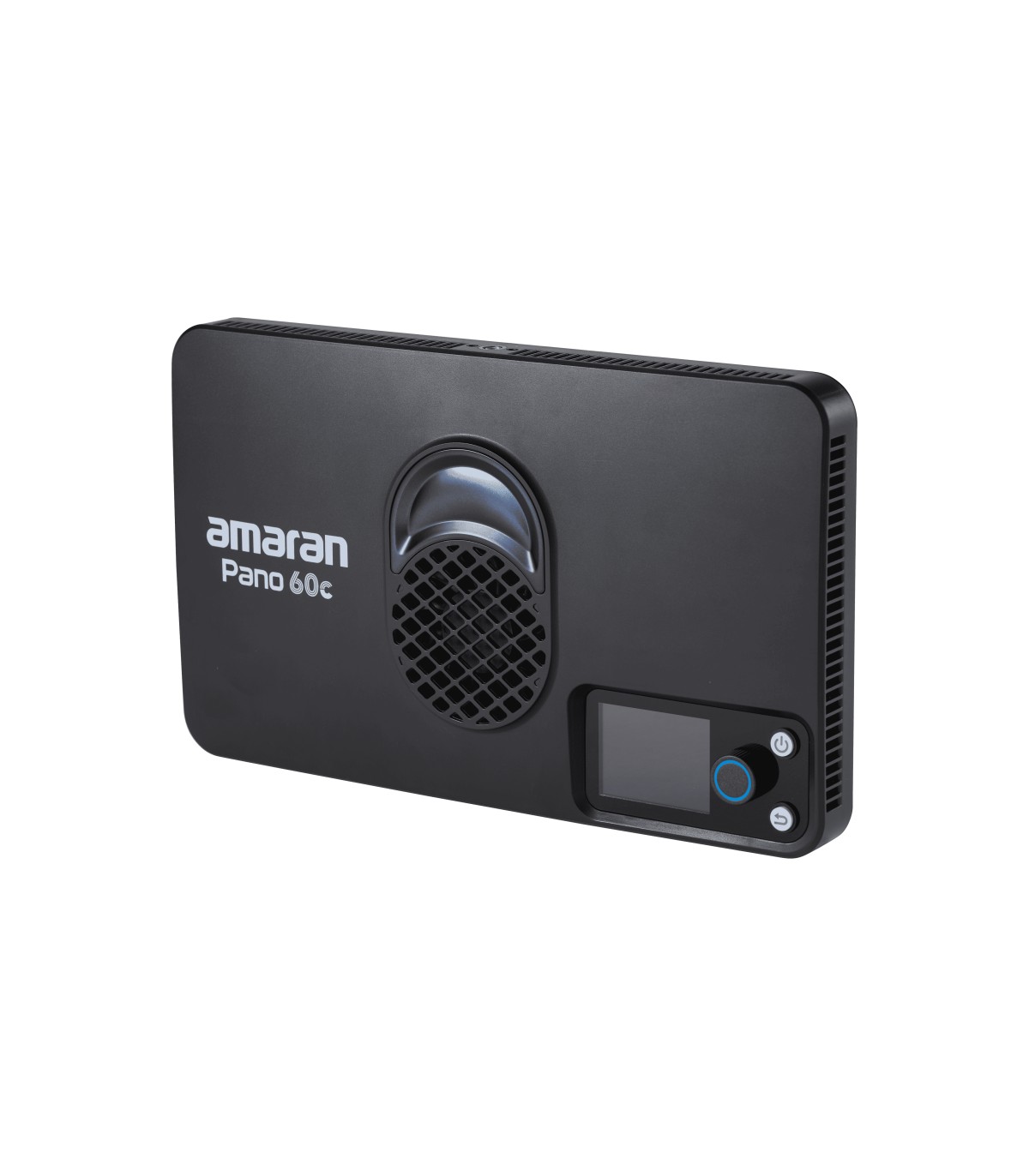 Panel Amaran Pano 60c de 60W, con LED matricial RGBWW 2,300K a 10,000K (1,800K a 20,000K con modo CCT+), en color charcoal (carbón). Panel compacto y portátil (25,5 x 15,5cm; 0,6kg), con modo de ventilador silencioso o inteligente. Modos de trabajo: CCT con ajuste verde/magenta, HSI, gelatinas y 12 efectos (fuegos artificiales, bombilla, paparazzi, fuego, TV, etc).