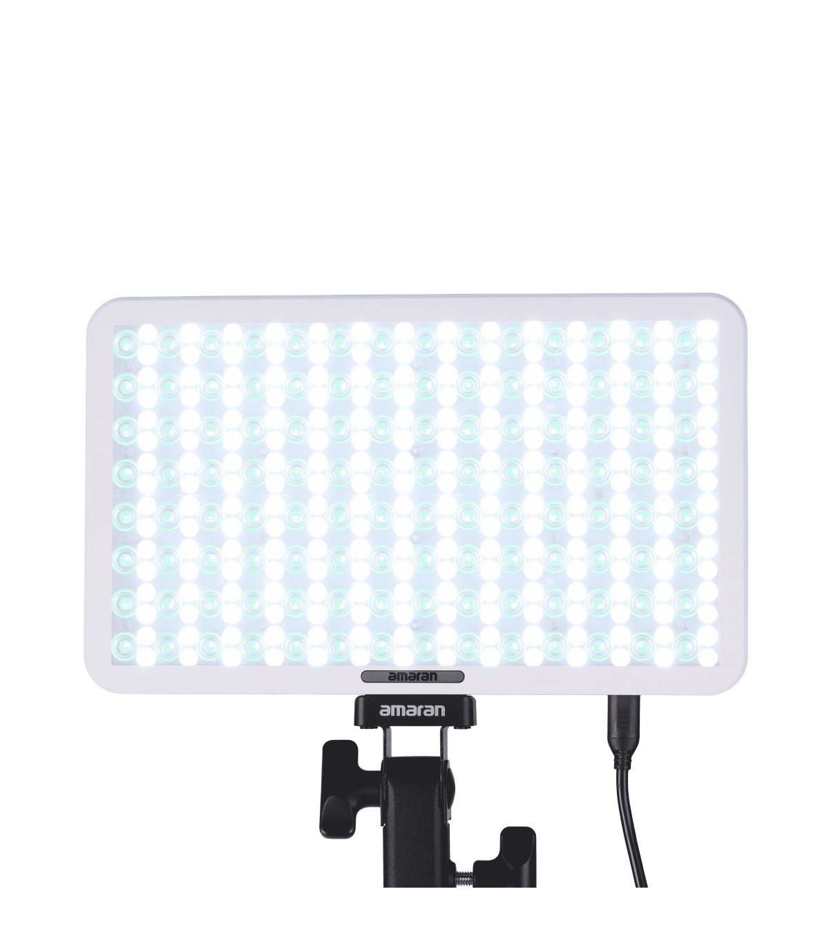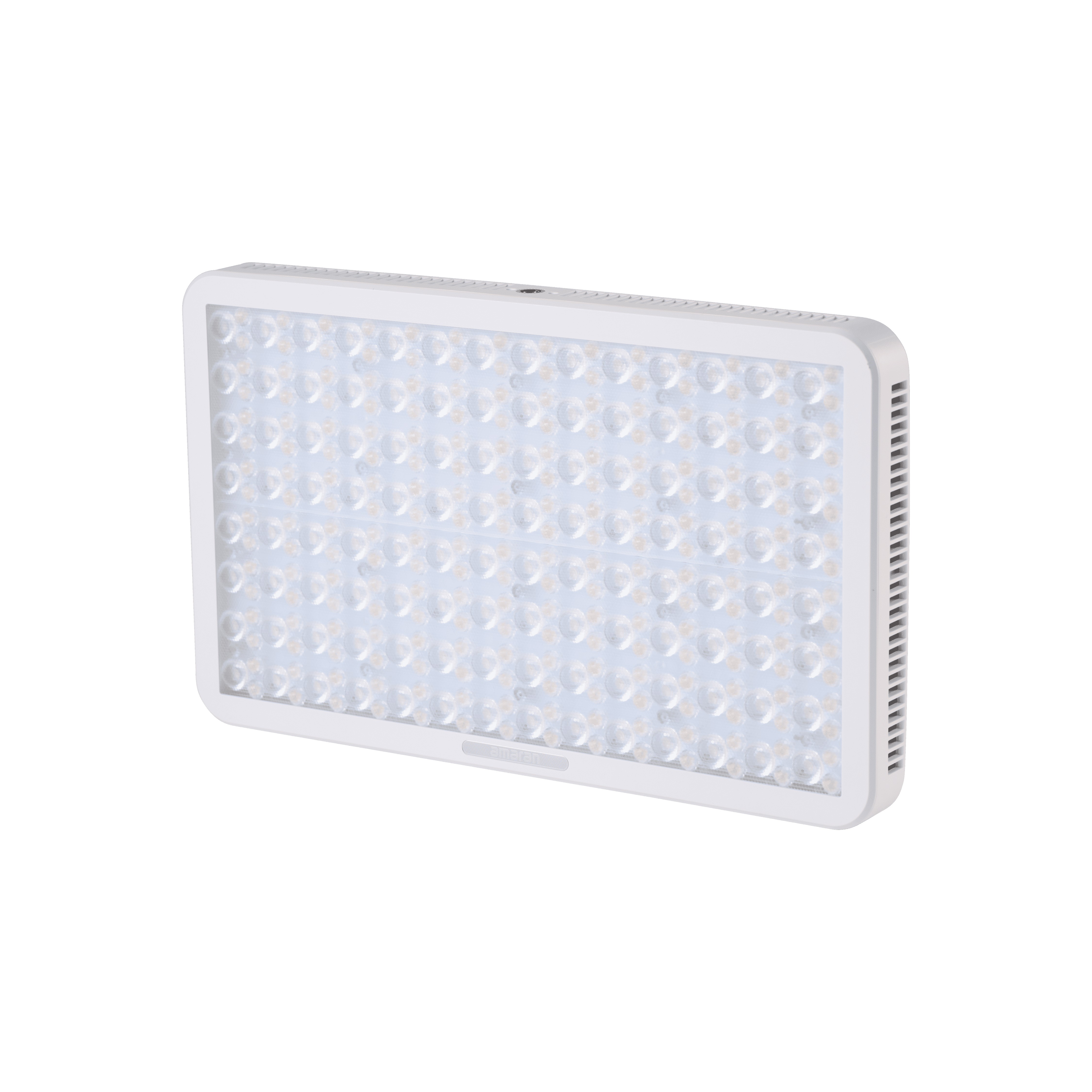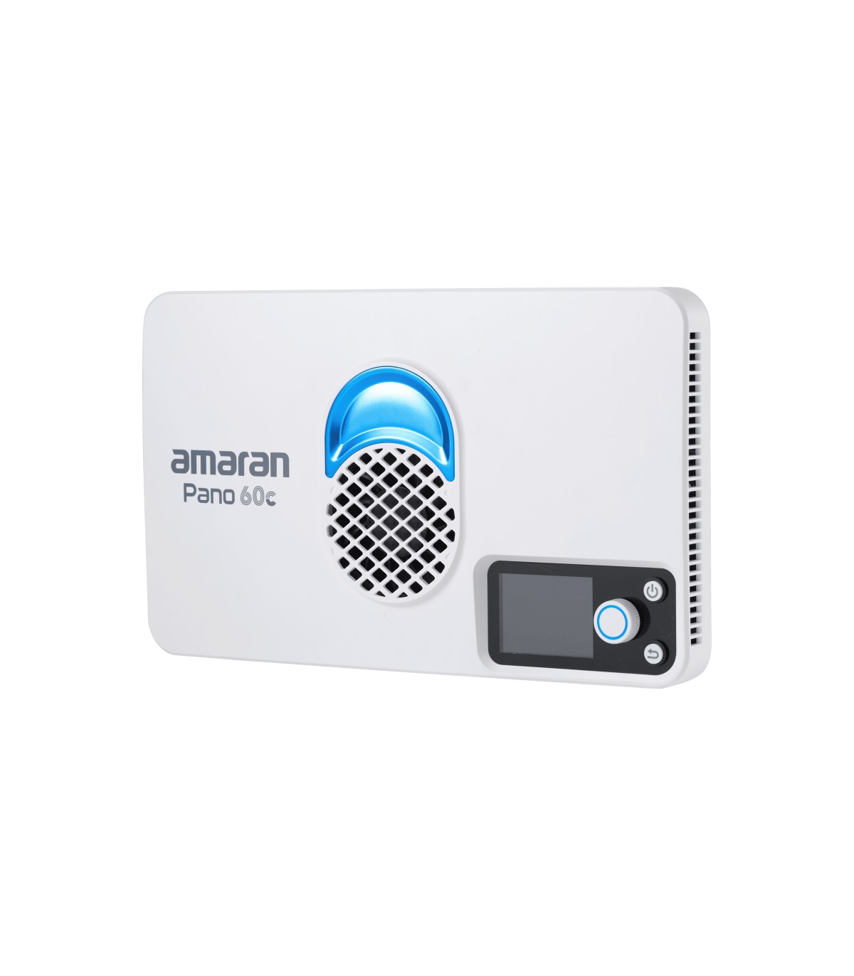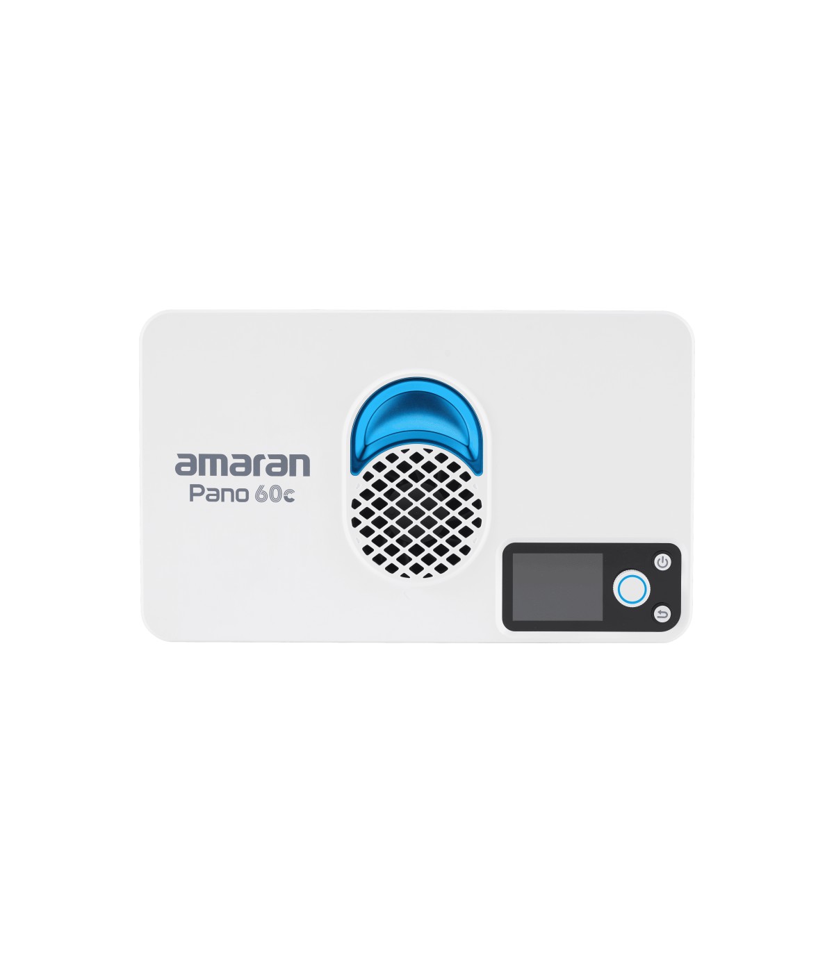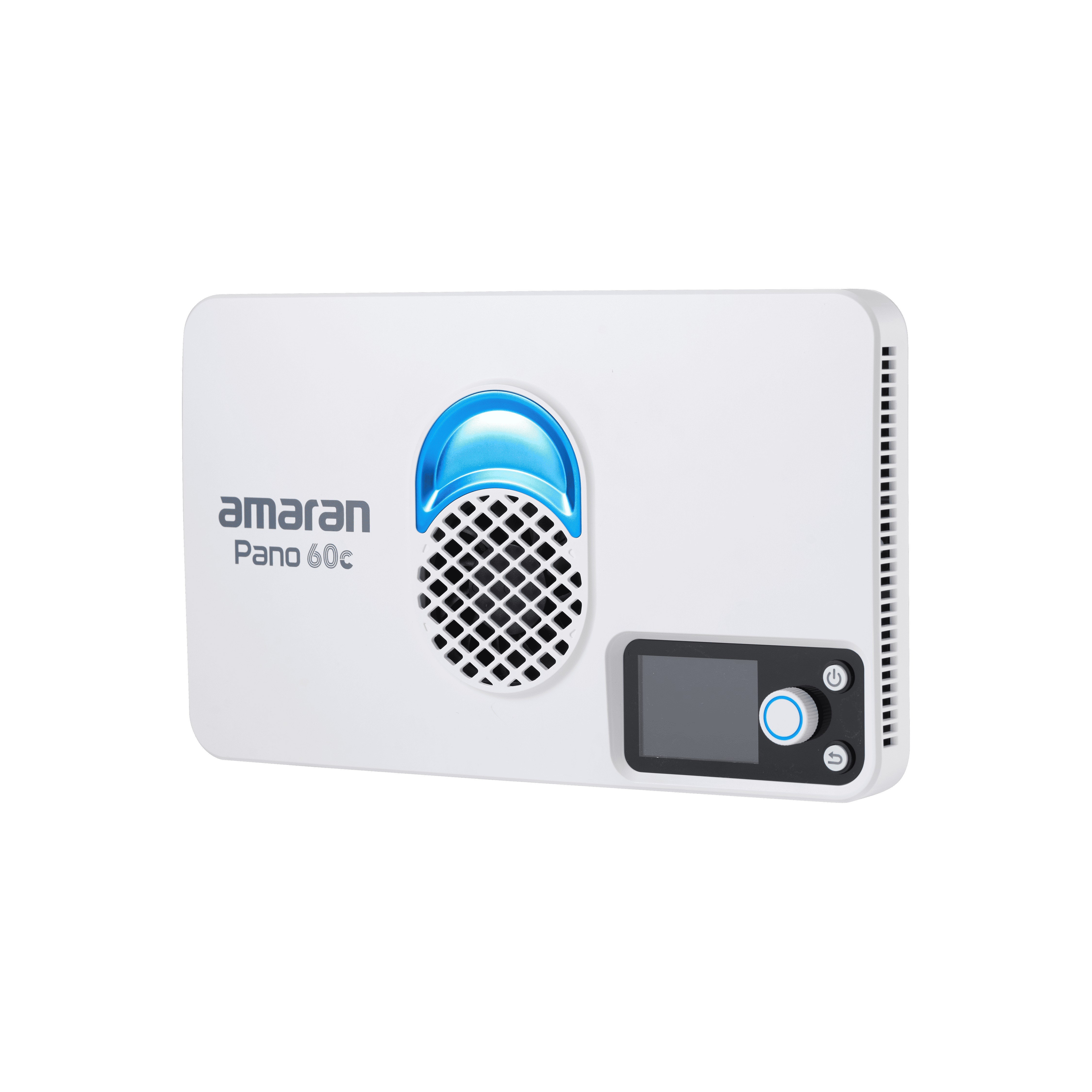 Panel Amaran Pano 60c de 60W, con LED matricial RGBWW 2,300K a 10,000K (1,800K a 20,000K con modo CCT+), en color blanco. Panel compacto y portátil (25,5 x 15,5cm; 0,6kg), con modo de ventilador silencioso o inteligente. Modos de trabajo: CCT con ajuste verde/magenta, HSI, gelatinas y 12 efectos (fuegos artificiales, bombilla, paparazzi, fuego, TV, etc).