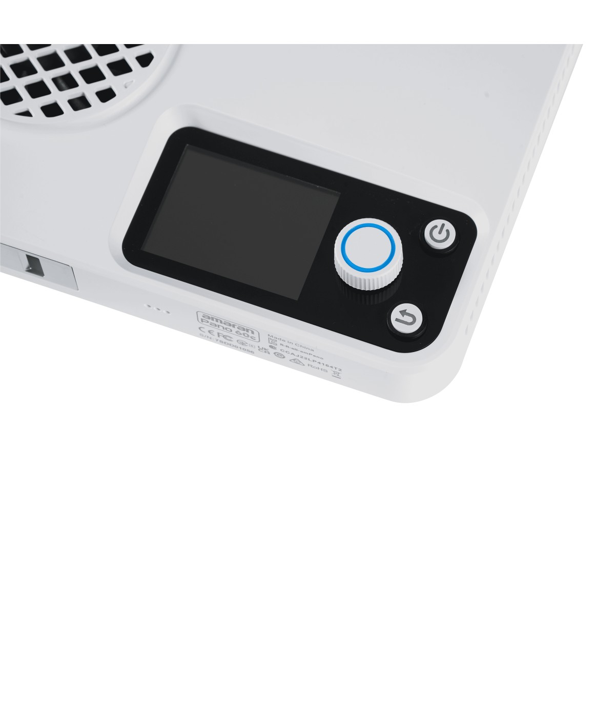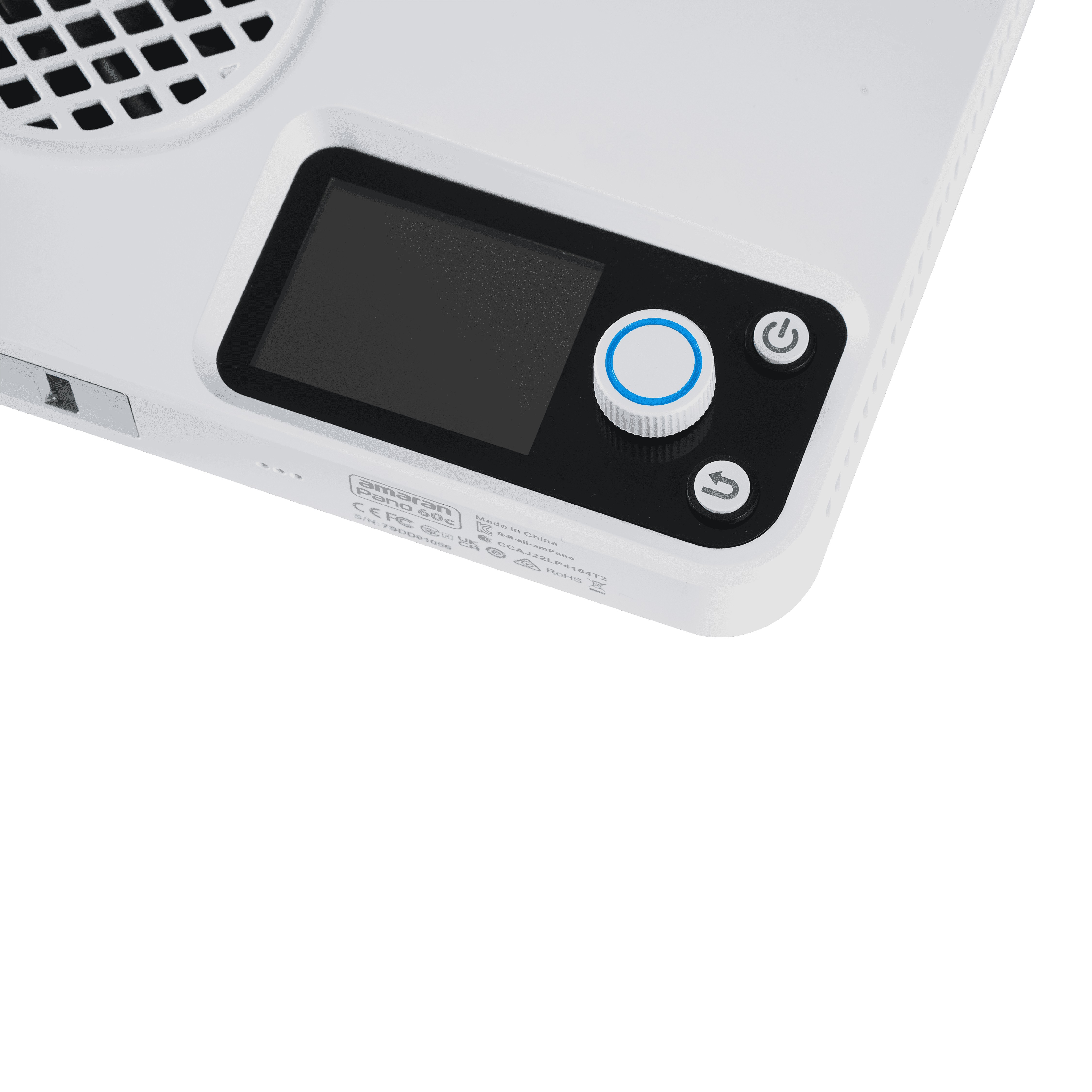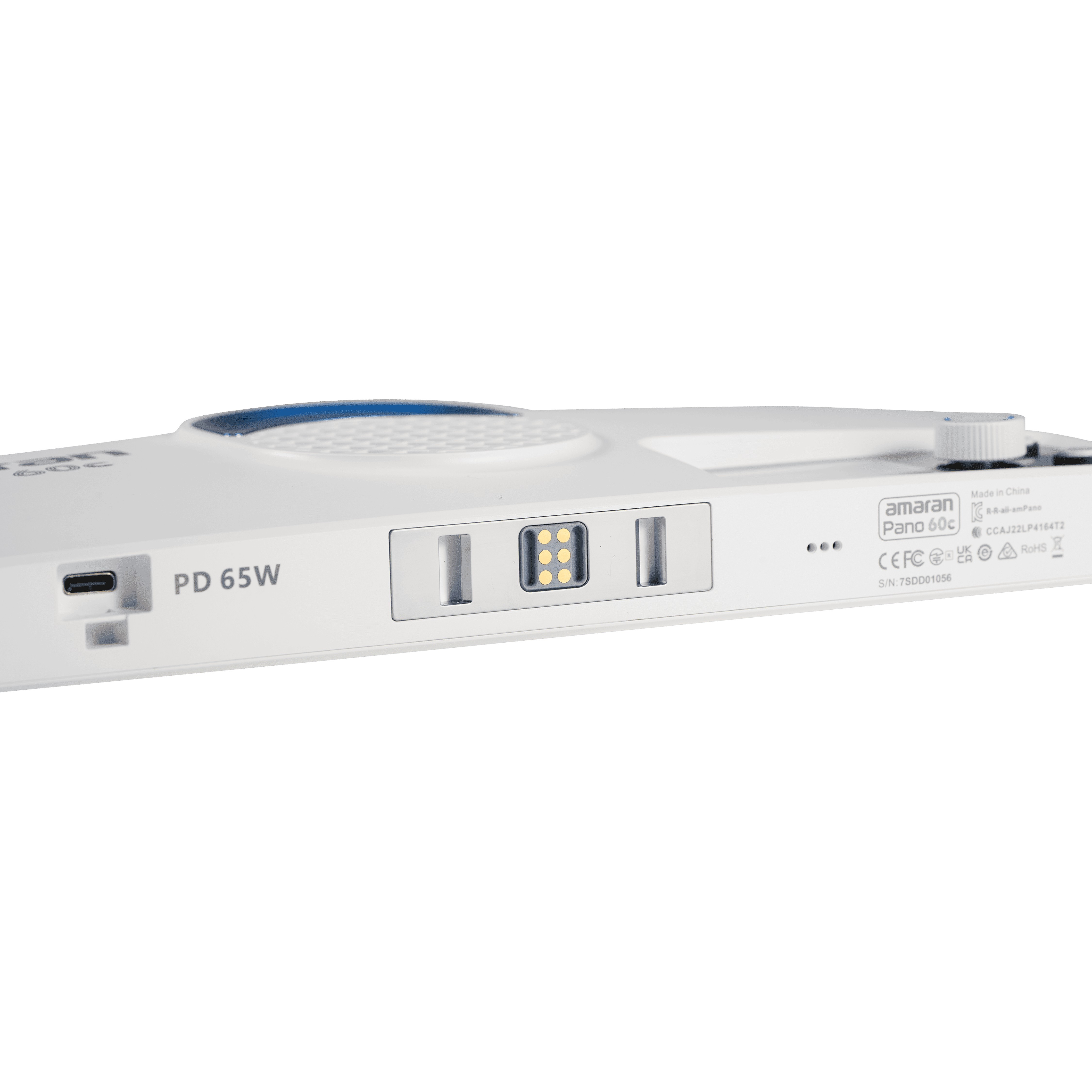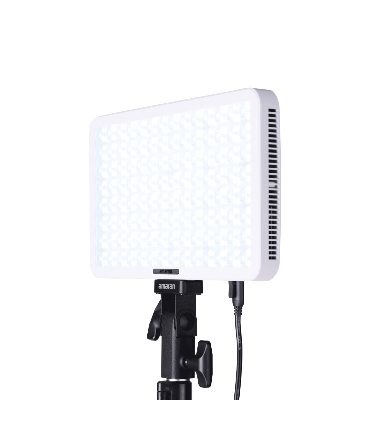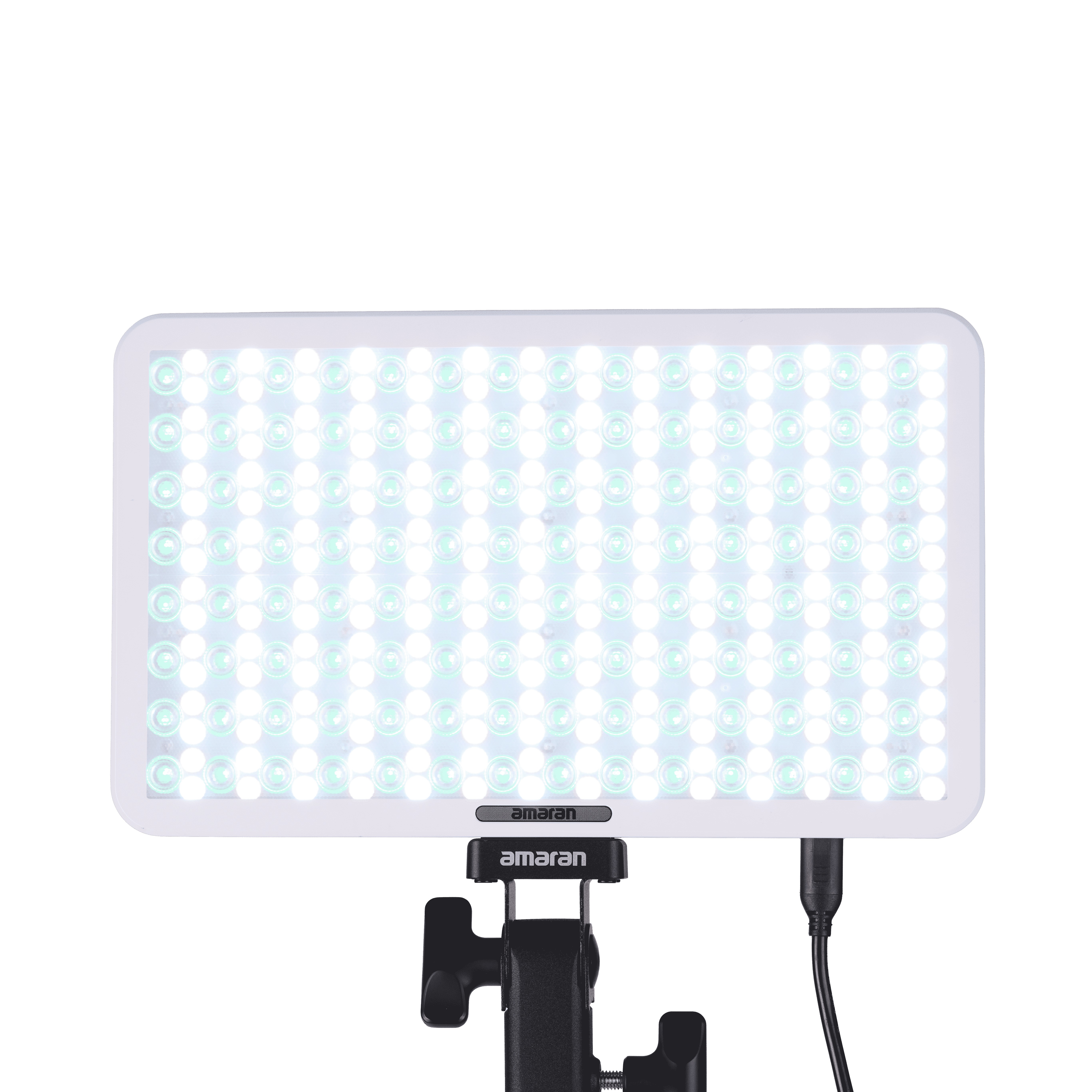 Panel Amaran Pano 60c de 60W, con LED matricial RGBWW 2,300K a 10,000K (1,800K a 20,000K con modo CCT+), en color blanco. Panel compacto y portátil (25,5 x 15,5cm; 0,6kg), con modo de ventilador silencioso o inteligente. Modos de trabajo: CCT con ajuste verde/magenta, HSI, gelatinas y 12 efectos (fuegos artificiales, bombilla, paparazzi, fuego, TV, etc).