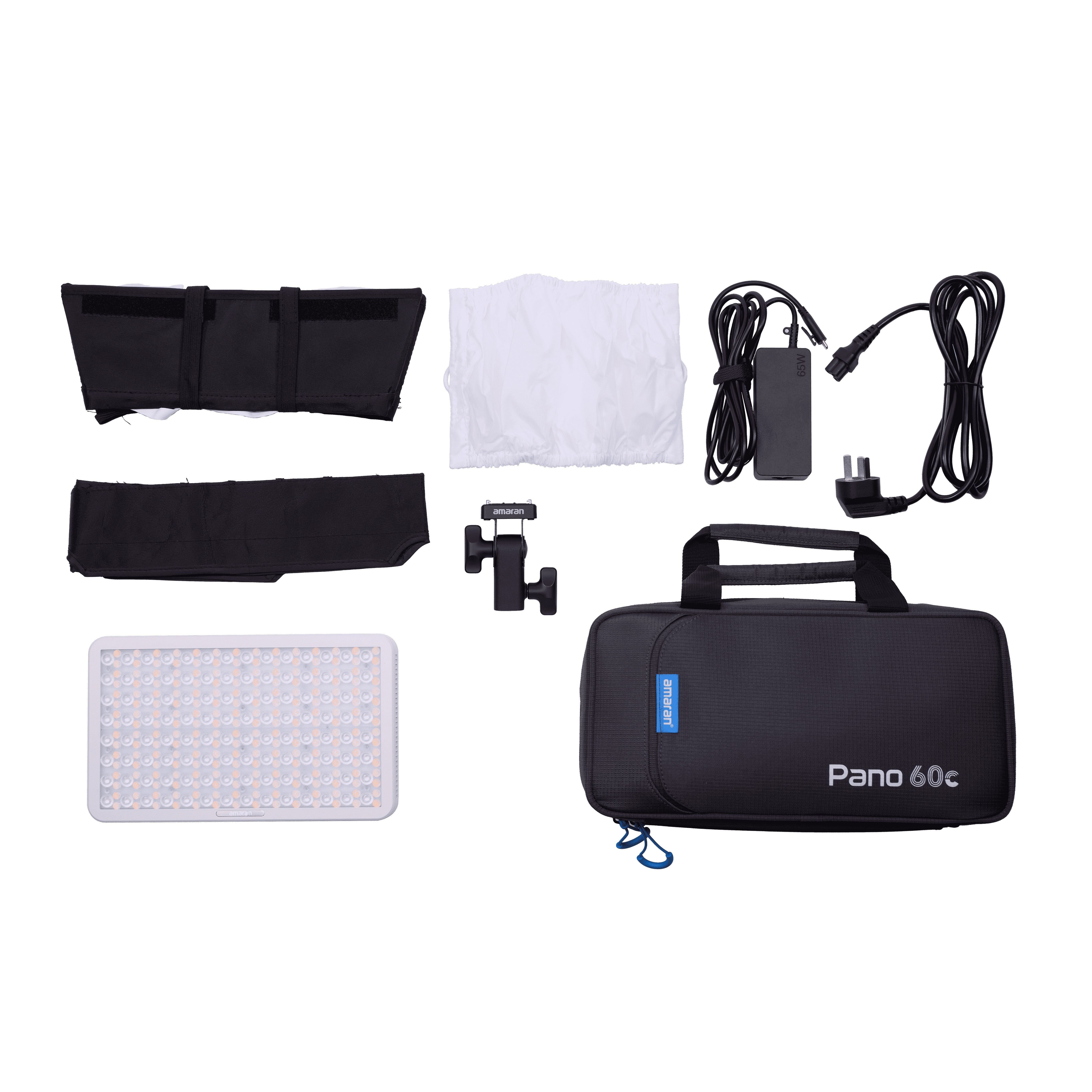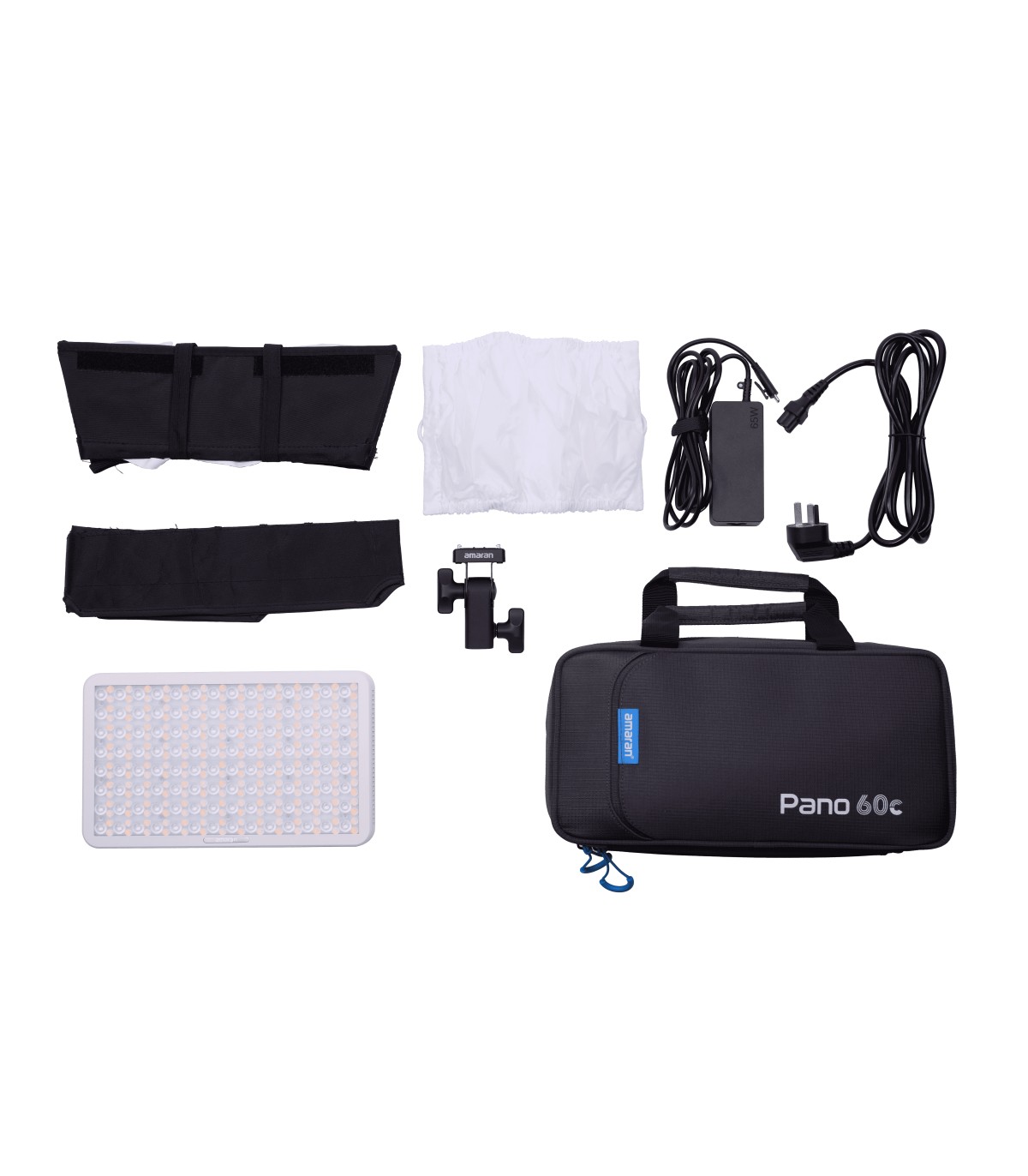 El kit incluye el panel de 60W, caja de luz, nido de abeja, difusor, adaptador amaran Ace Lock (para soporte de iluminación), adaptador de alimentación, cable y bolsa acolchada de transporte.
