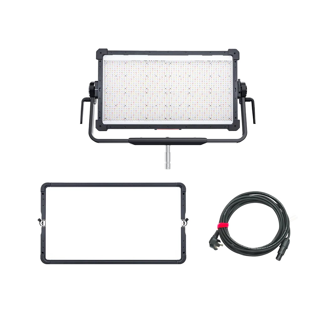 Su sistema de montaje frontal de accesorios amplía las posibilidades creativas y agiliza el montaje de modificadores. El kit incluye el panel de 1000W (21kg), difusor plano, cable a cabeza de 6m, horquilla extraíble para su montaje en escenarios, trusses o exteriores, y maleta con ruedas.