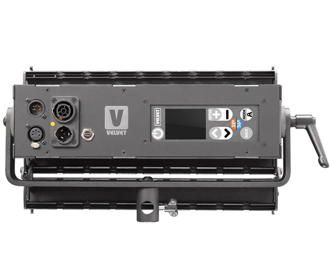 Panel CYC4 Studio de 94W LED matricial de 4 barras móviles en arco, RGBW 2500K a 10000K, wireless DMX, de Velvet; softlight con sombra suave; haz vertical desde 45º hasta 95º, haz horizontal 45º. Modos de trabajo: CCT con ajuste verde/magenta, HSI, RGB, gelatinas y efectos. Incluye panel 94W con horquilla con manguito 16mm, control DMX, alimentador AC universal y cable alimentación de 3m. Datos fotométricos a 5600K: 1.000 Lux para cubrir, a 1,5m de distancia, una pared de 4m de altura de forma homogénea (desde el suelo o desde el techo). Indicado para platós y estudios con techo medio alto, como luz de fondos y cicloramas con color y efectos. Como cubre un ancho de 1,20m para cubrir parades más anchas se recomienta montar varios Cyc separados 1,35m entre sí (entre sus ejes, marcados por el manguito 16mm).