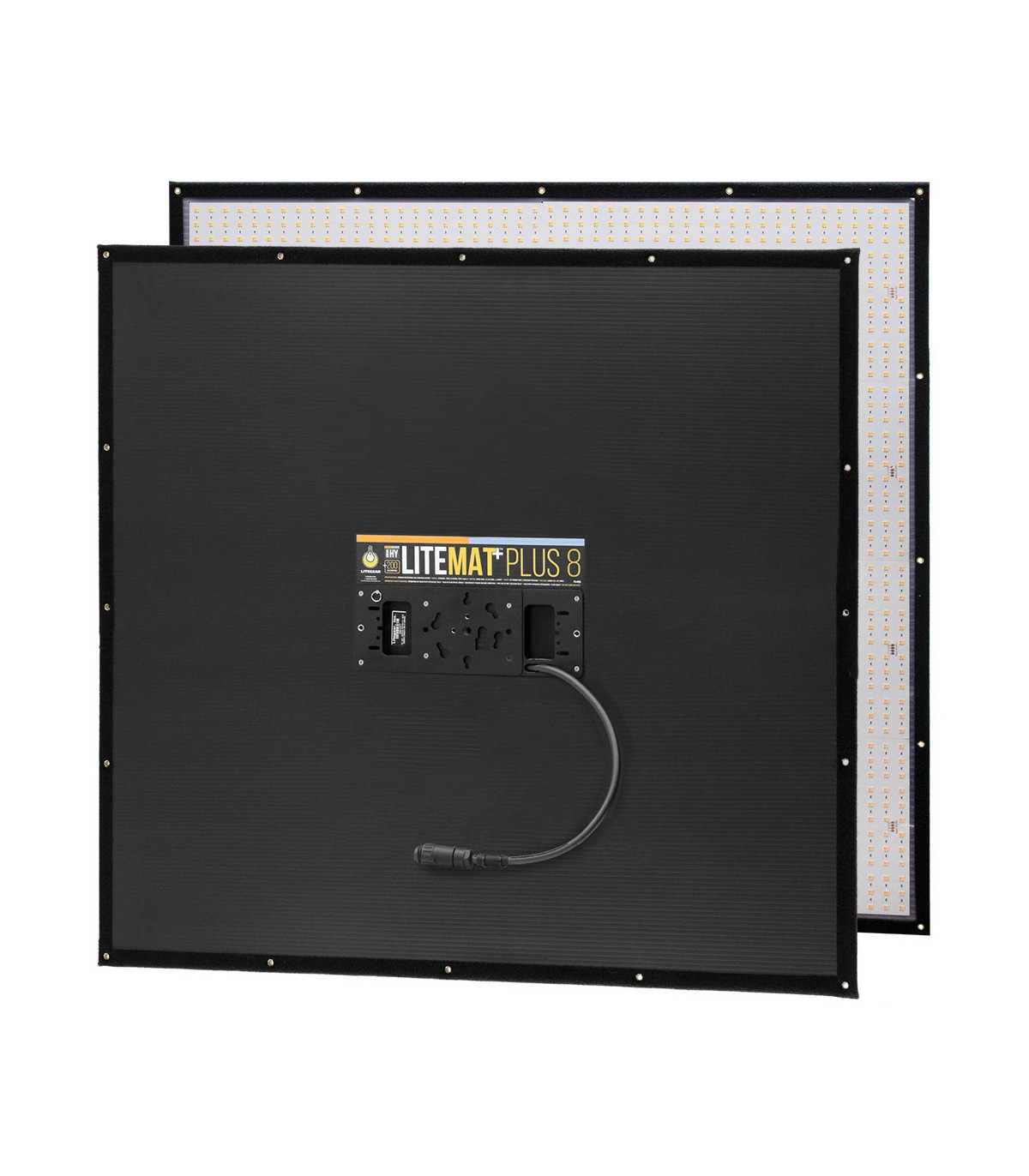 Panel LED ligero LiteMat Plus 8 de 400W LED Bicolor 2600K a 6200K, WDMX, de LiteGear. Su característica principal es la ligereza, pero al ser panel matricial genera multisombras si lo ponemos muy cerca de un objeto a una pared, por esa razón viene con tres difusores para convertirlo en softlight con sombra medio suave, haz 60º con eggcrate plástico cromado. Modo de trabajo: CCT con ajuste verde/magenta. Incluye panel 102x102cm de 400W con brazo montura K y manguito 16mm, 3 difusores, nido de abeja rígido (eggcrate), control 400W WDMX, cable a cabeza de 7m, cable alimentación, fuente de alimentación y bolsa de transporte. Datos fotométricos a 6000K SIN difusores: 10.549 Lux a 0.9m, 3.800 a 1.5m, 1.173 a 2.5m. Sistema liviano diseñado para cine, televisión y vídeo. Al proporcionar LEDs espaciados uniformemente distribuidos en un área grande, LiteMat crea una luz suave sin necesidad de difusión. El método de “pixelización suave” permite que la unidad logre niveles de brillo mientras mantiene un tamaño de 23mm de grosor y un peso de 4.7kg. Indicado para andar liger@ de equipaje y tener siempre un recurso a mano para una esquina, un techo...