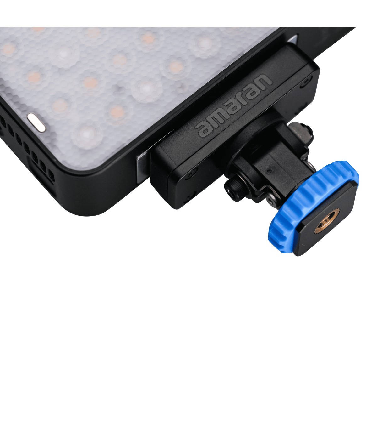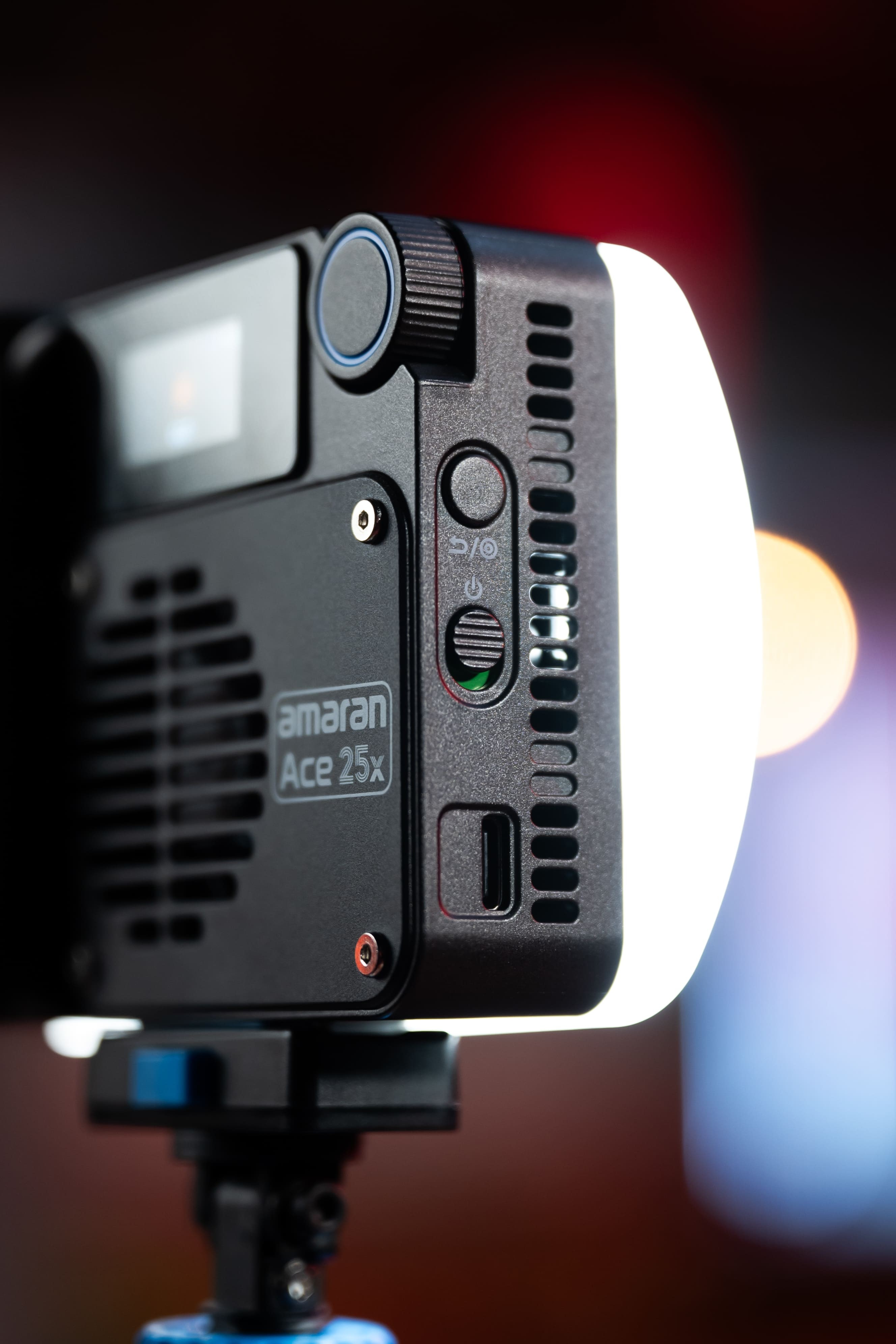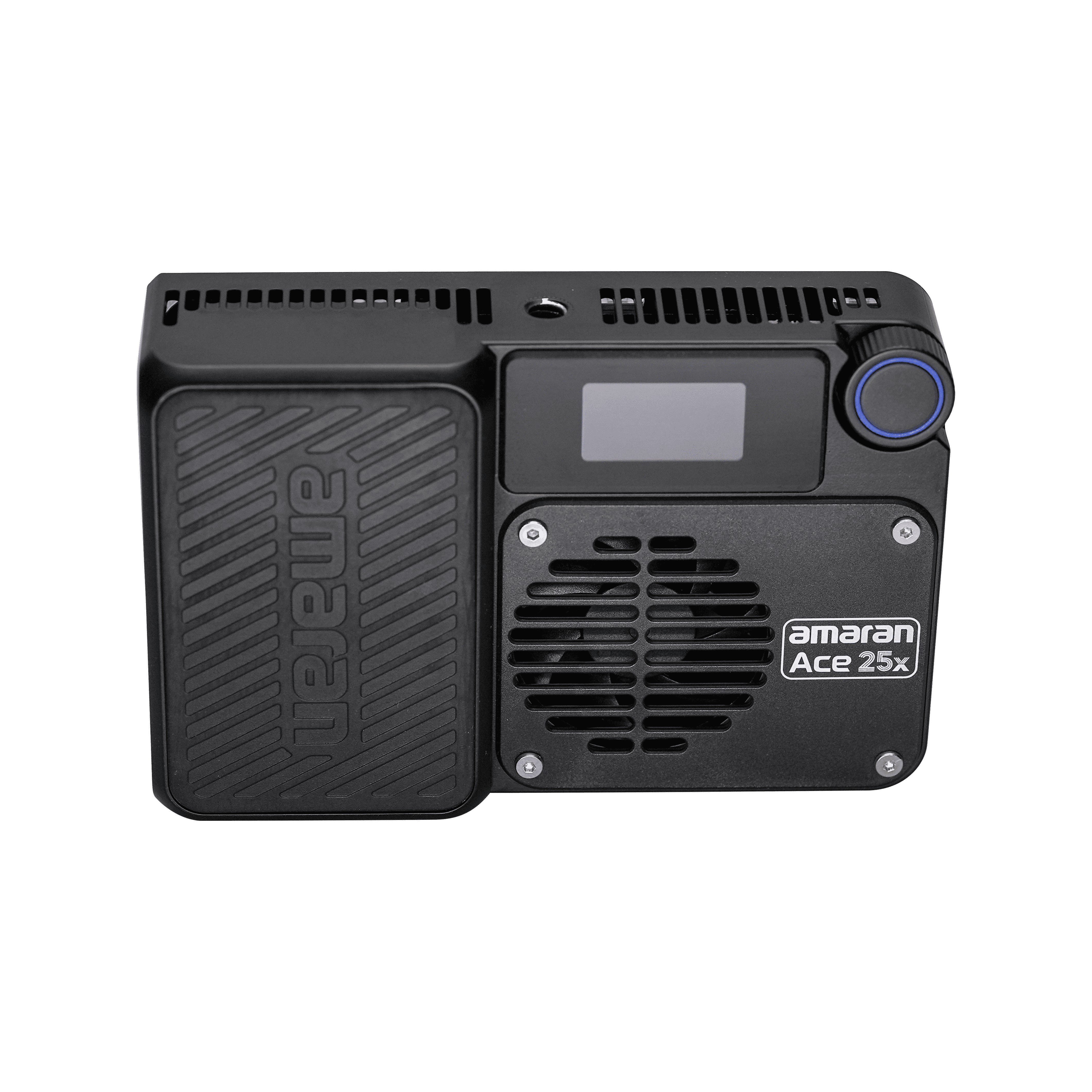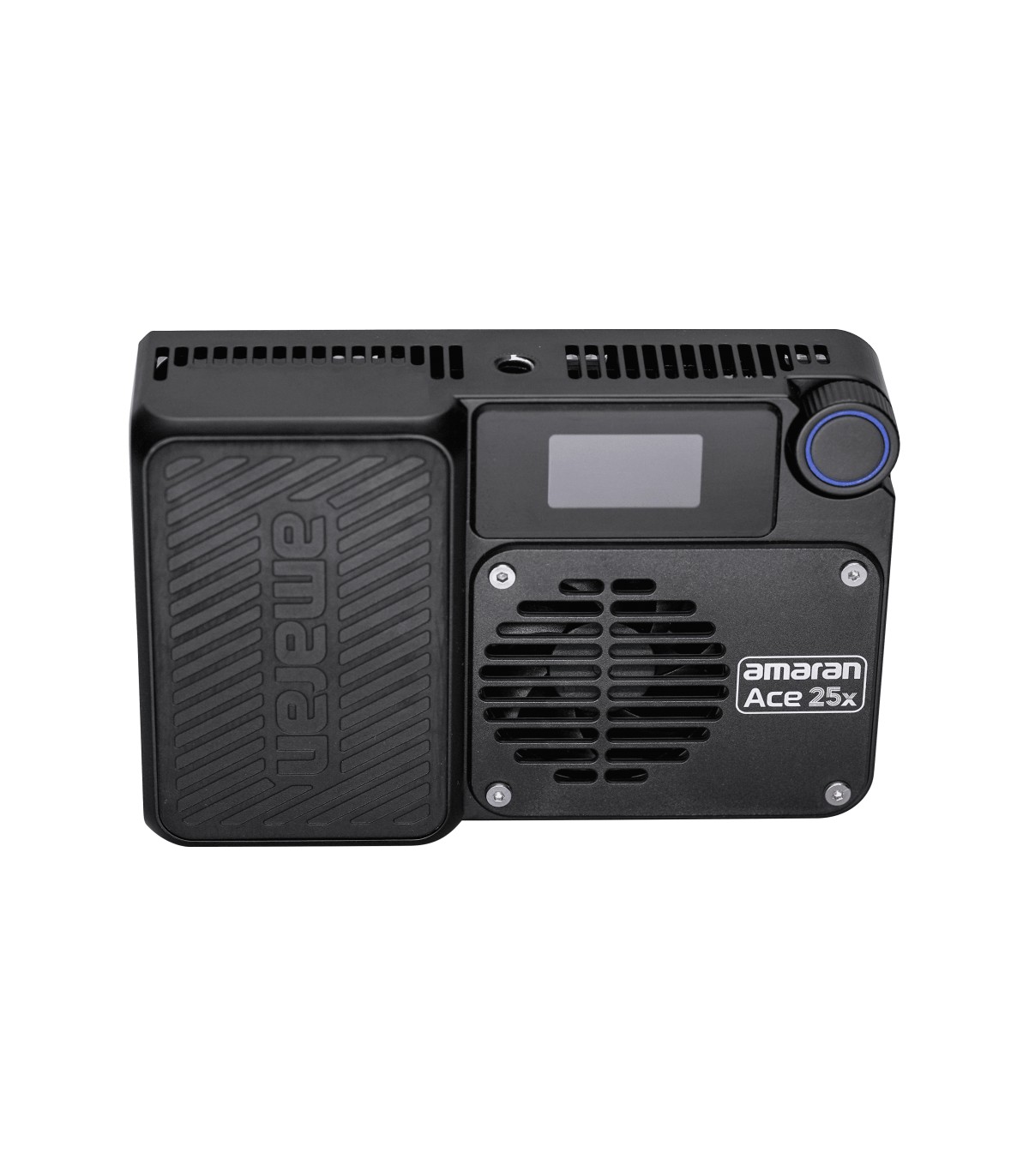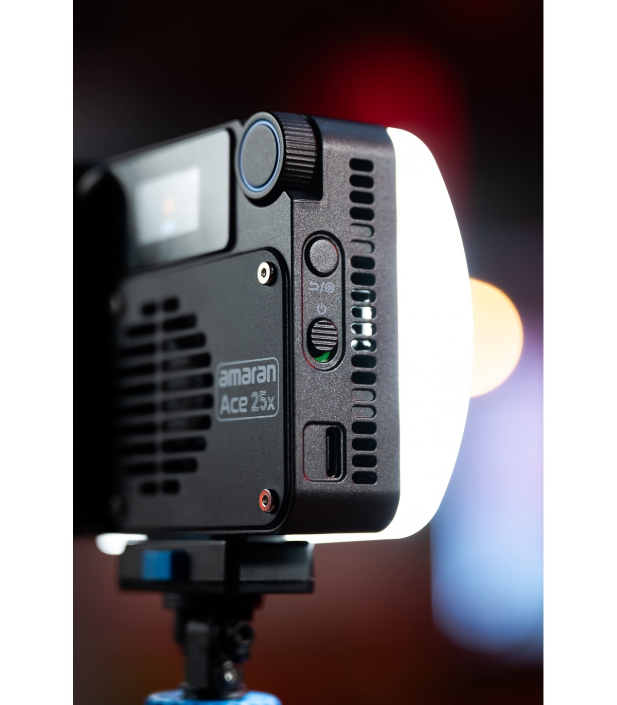 Panel LED mini Amaran Ace 25x de 25W (32W en Boost Mode), bicolor, con temperatura de color ajustable de blanco cálido a blanco frío (2,700K a 6,500K), en color carbón. Softlight con sombra suave, y con el difusor dome sombra super suave.