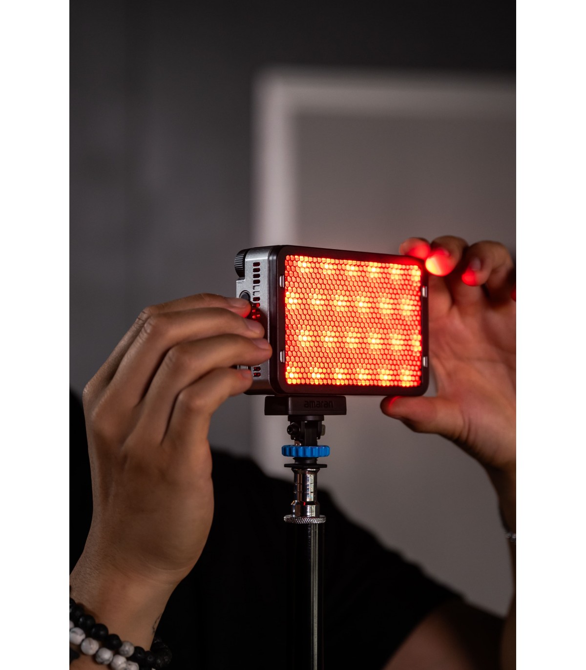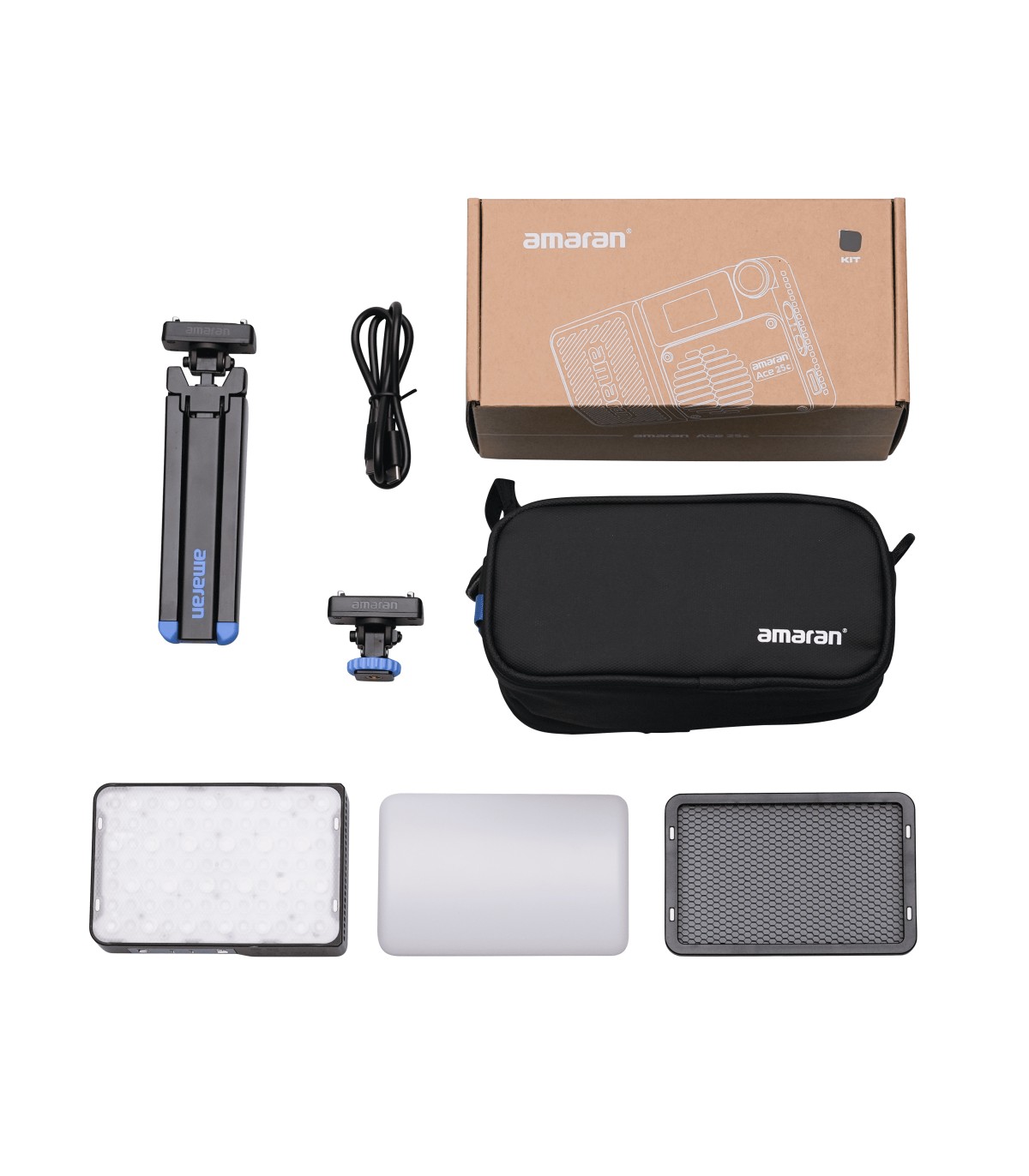 Kit panel mini Amaran Ace 25c de 25W (32W en Boost Mode), LED matricial RGBWW 2.300K a 10.000K (con ajuste verde-magenta), en color charcoal. Softlight con sombra suave, y con el difusor dome sombra super suave. Modos de trabajo: CCT, HSI y efectos.