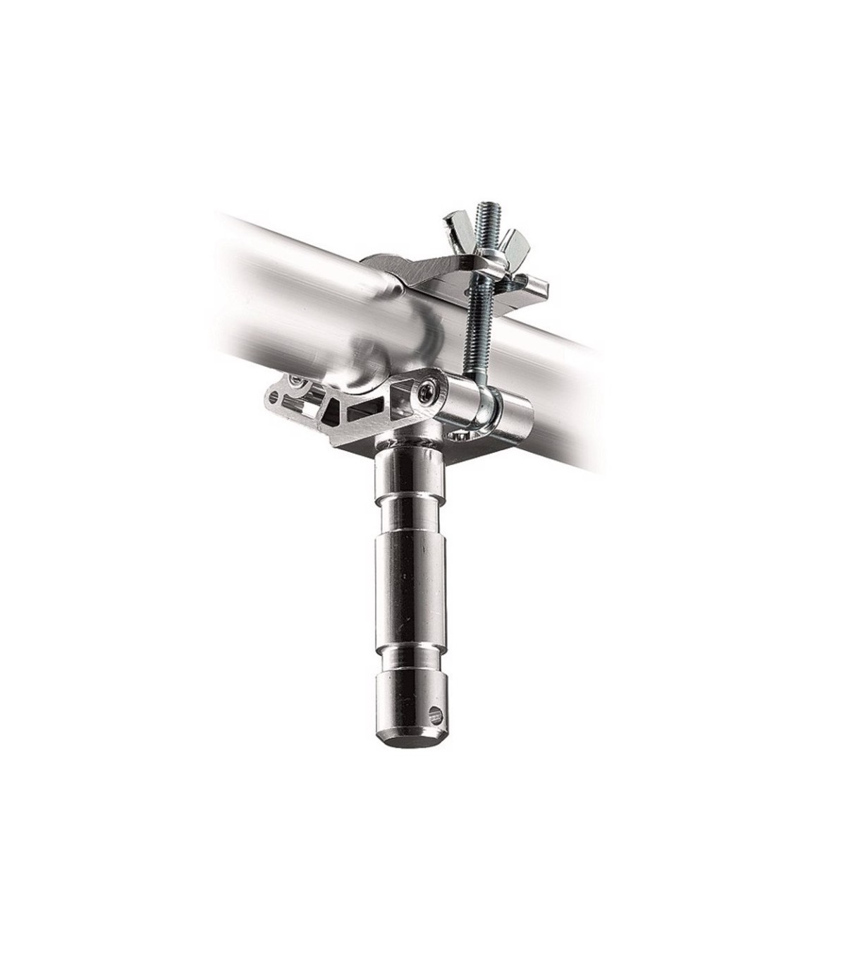 Pinza truss MP de aluminio con espárrago de 29mm y palometa para cierre de la mordaza. Conocida también como Big Ben. Para tubos desde diámetro 42mm hasta 52mm. Capacidad 300kg, peso 0,60kg. Especial para hacer porterías con trípodes y truss o tubo redondo.