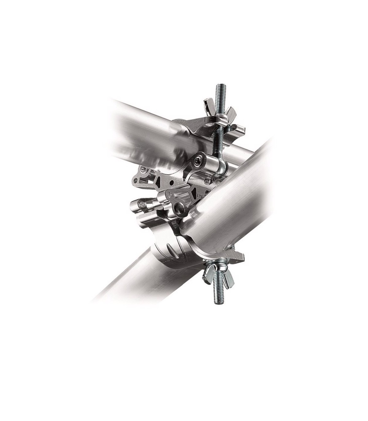 Pinza truss MP doble aluminio 50mm para tubos de diámetro 42 a 52mm; acabada en espárrago 29mm. También conocida como soporte Big Ben. Capacidad 300kg, peso 2,85kg. Indicada para montar truss de 50mm de diámetro y de 20 a 40cm de ancho sobre trípode; con dos pinzas sobre dos trípodes puedes montar una portería.