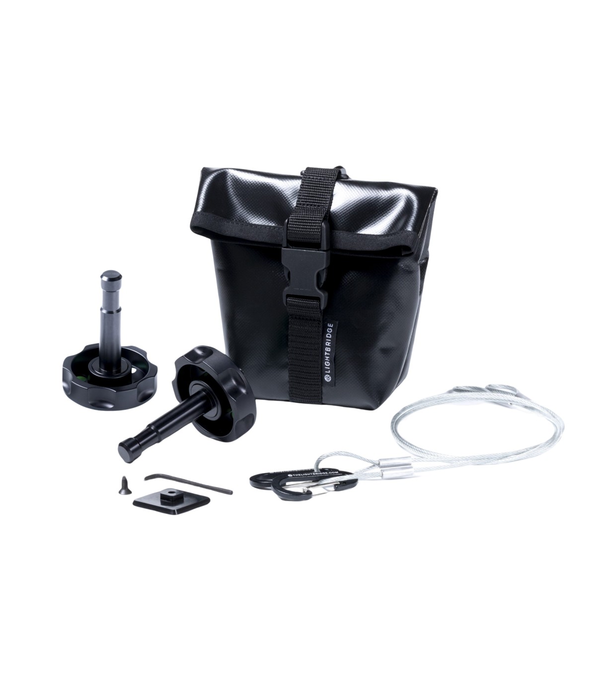 Kit C-Grip de LightBridge con 2 ruedas macho, 1 cuña, 2 cables de seguridad y 1 bolsa. Las ruedas C-Wheels se adaptan a las guías montadas detrás de los reflectores desde 7x7cm hasta 50x50cm permitiendo su desplazamiento para buscar la posición ideal.