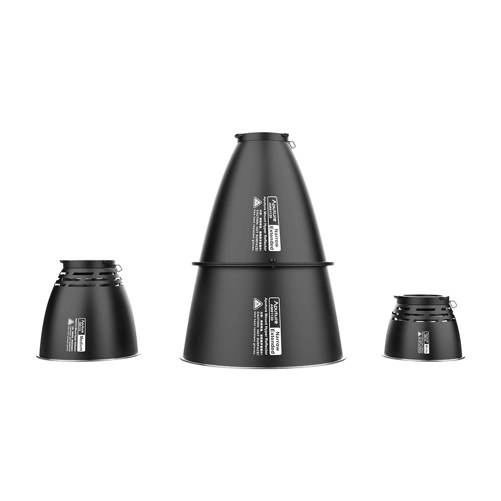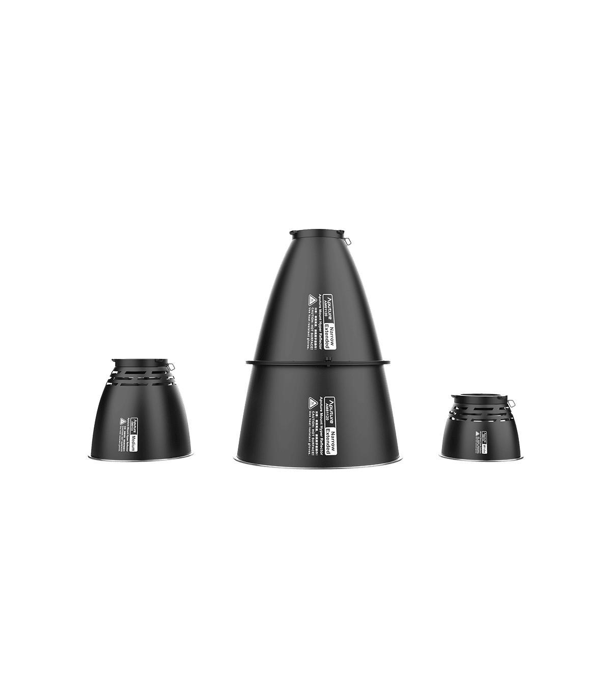Kit de reflectores para el STORM XT52 de Aputure. Incluye 2 reflectores adicionales al reflector medio de 35° incluido con el foco: el reflector Narrow de 25° y el reflector Wide de 50°. Están diseñados para optimizar el rendimiento del STORM XT52, creando un haz de luz uniforme, sin franjas de color.