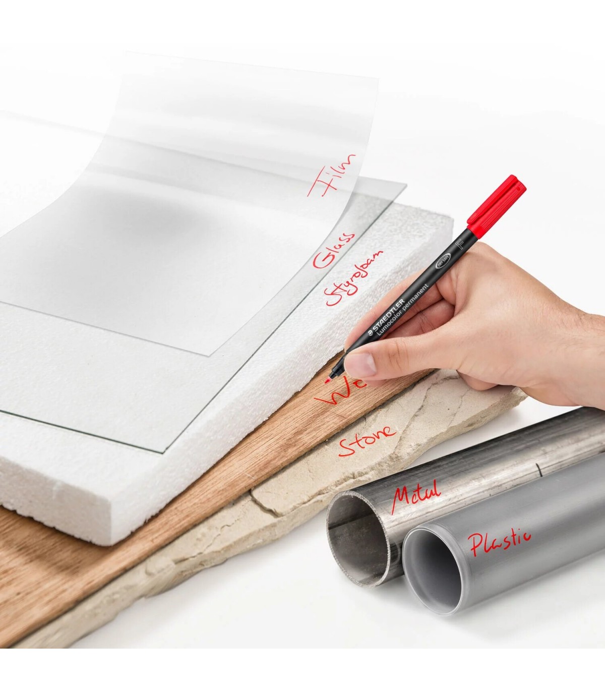 Rotulador Staedtler Lumocolor® 318 permanente F de color rojo, con trazo de 0.6mm. Universal para usar en casi todas las superficies. Tinta permanente con poco olor.