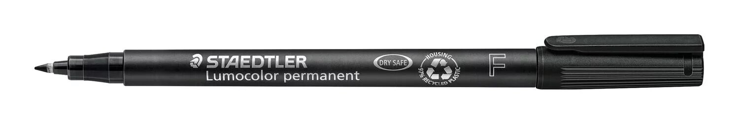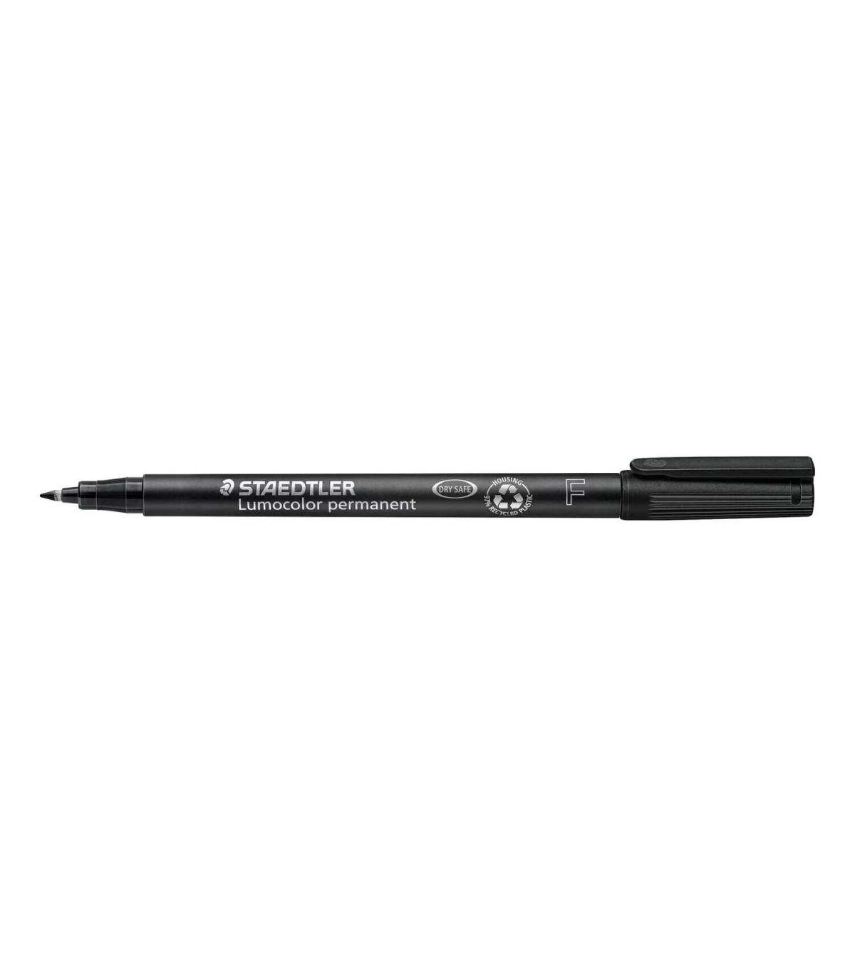 Rotulador Staedtler Lumocolor® 318 permanente F de color negro, con trazo de 0.6mm. Universal para usar en casi todas las superficies. Tinta permanente con poco olor.