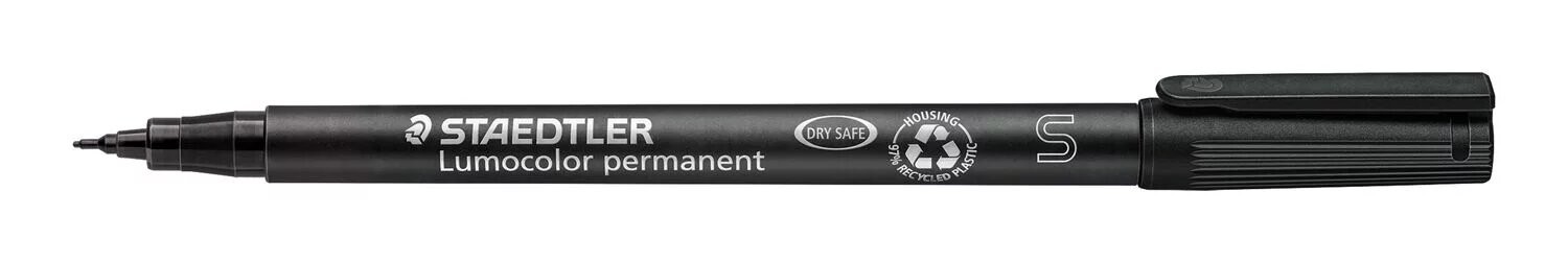 Rotulador Staedtler Lumocolor® 313 permanente S de color negro, con trazo de 0.4mm. Universal para usar en casi todas las superficies. Tinta permanente con poco olor.
