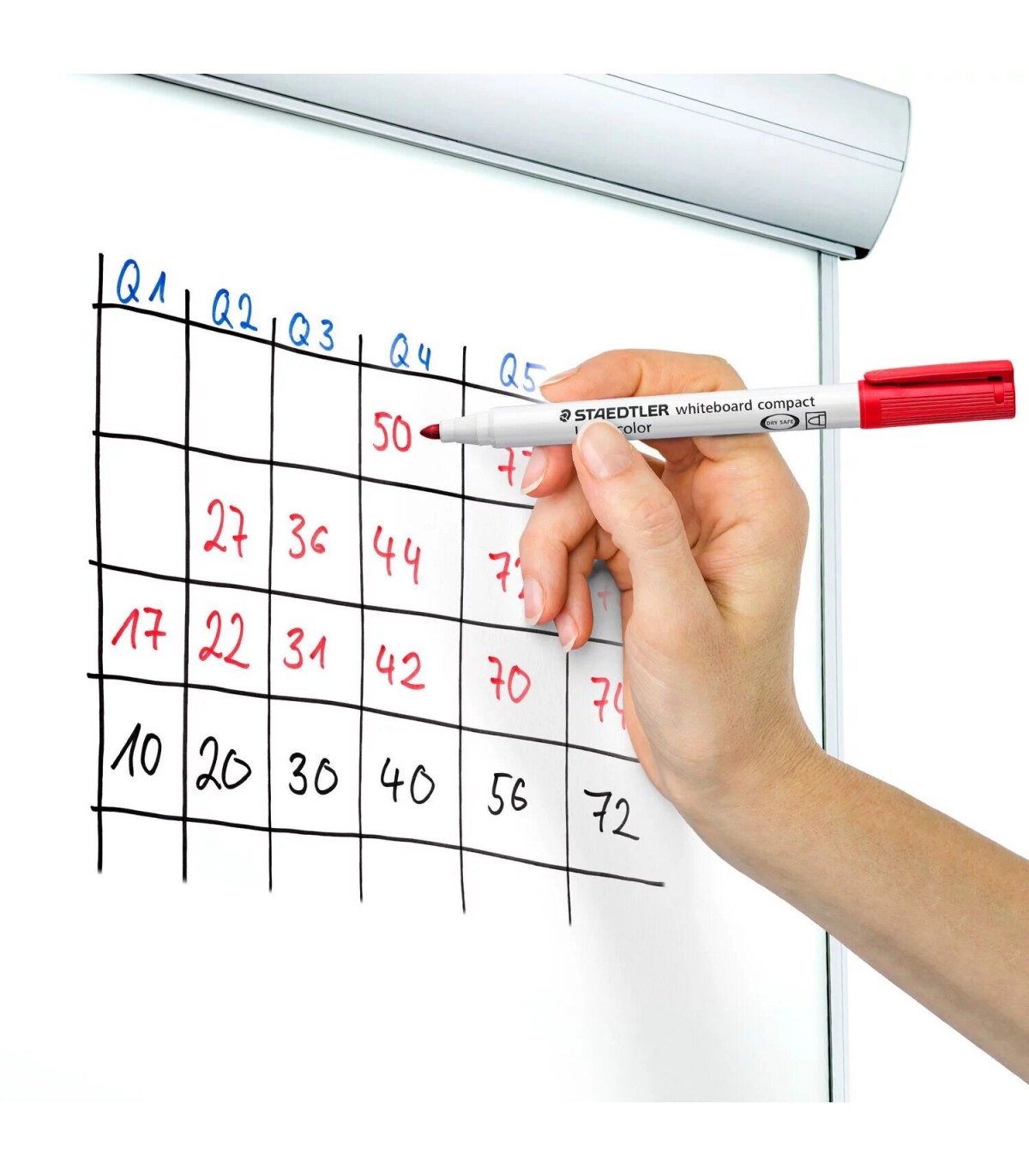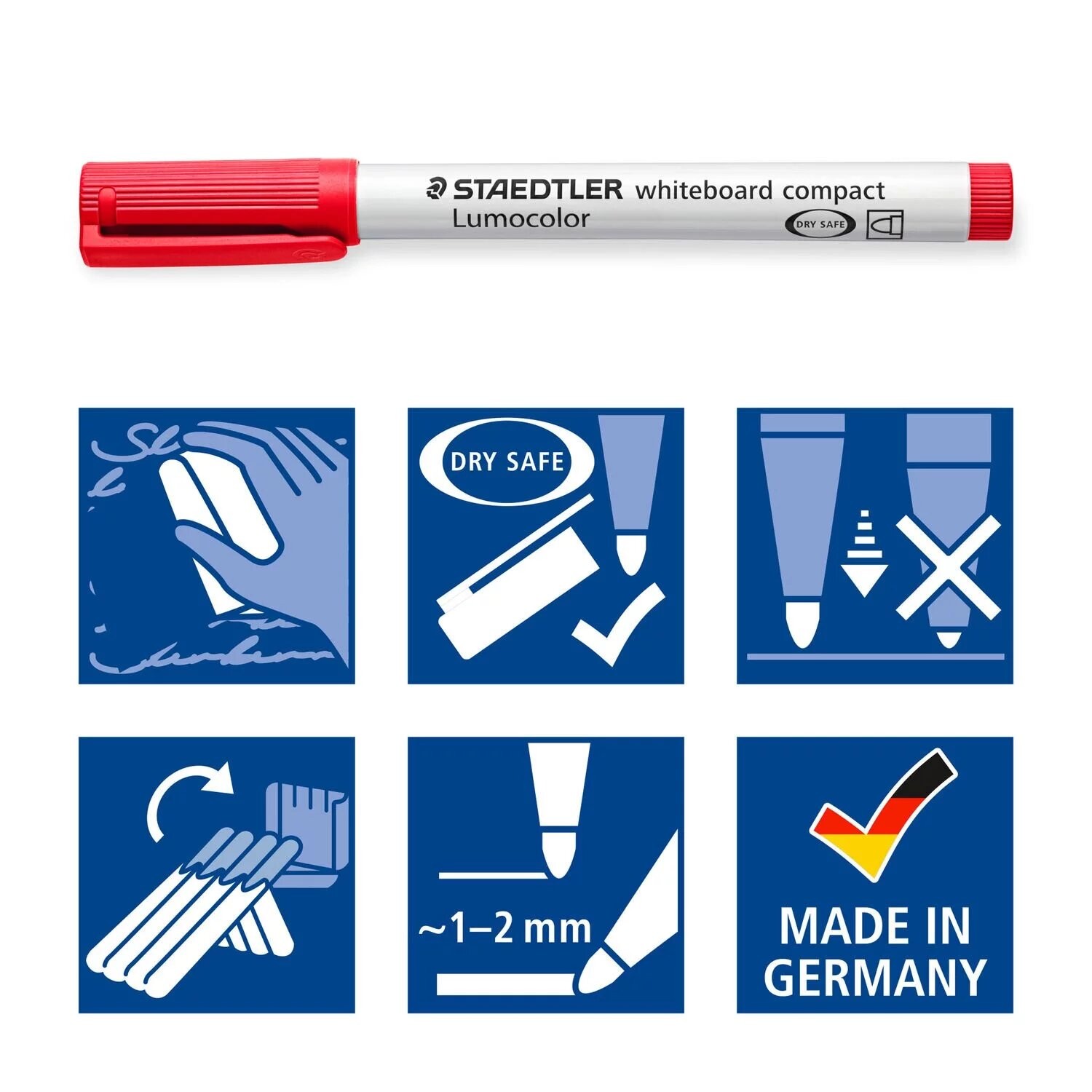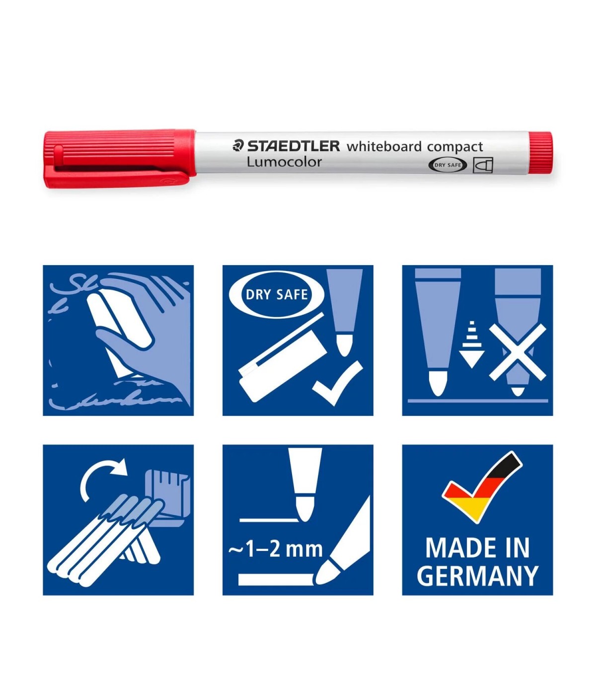 Rotulador Staedtler Lumocolor® 341 para pizarra y claqueta de color rojo y punta con trazo de 1mm hasta 2mm. Secado rápido y poco olor. Se puede limpiar con un paño, en seco.