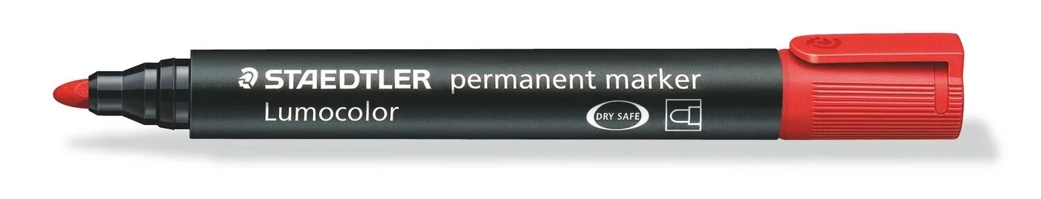 Rotulador Staedtler Lumocolor® 352 permanente de color rojo y punta con trazo de 2mm. Color intenso, poco olor. Resistente a la luz.