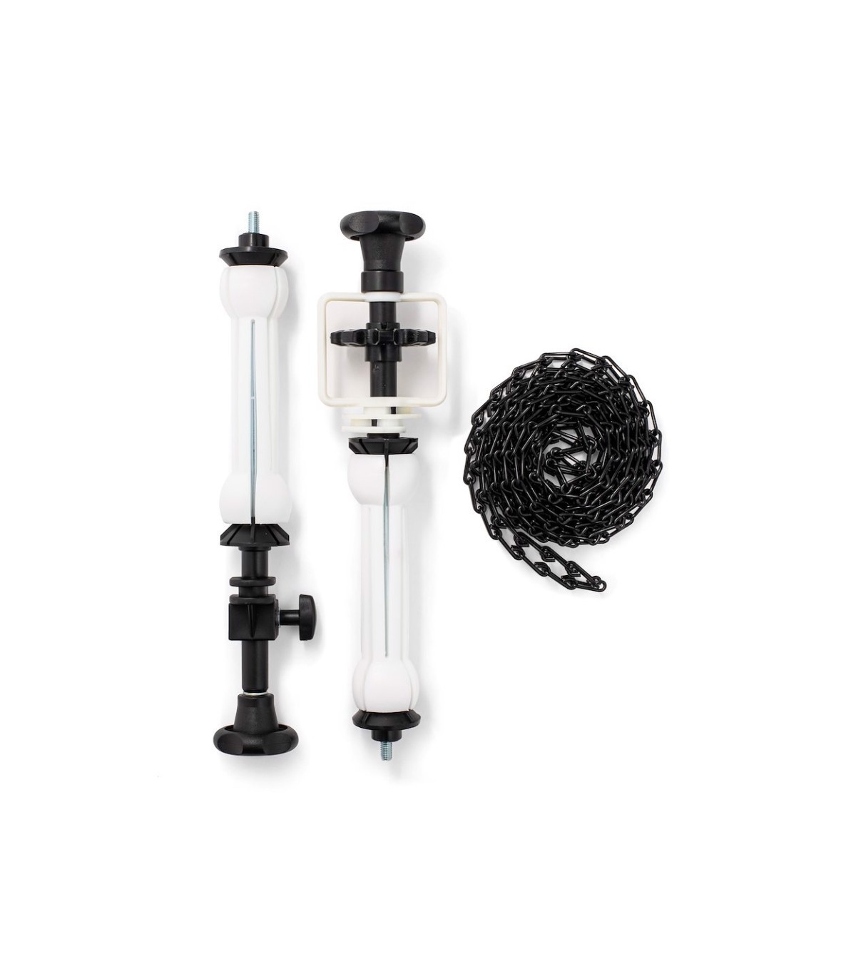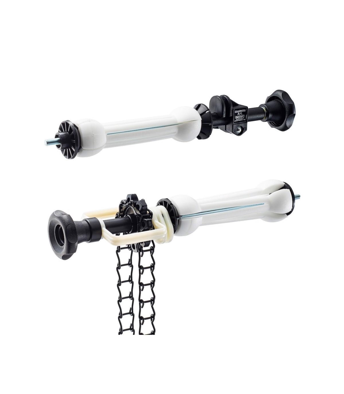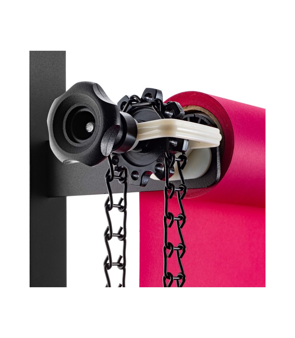Expan manual para fondos, con rueda para expandirlo, en un lado cadena metálica de color negro y en el otro lado palometa de freno. Se compone de dos piezas más la cadena. Capacidad 10kg, peso 1,2kg. Indicado para sujetar los fondos de papel con tubo interior desde diámetro 46mm hasta 78mm.