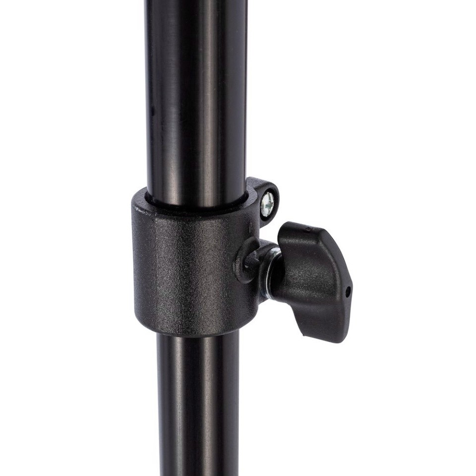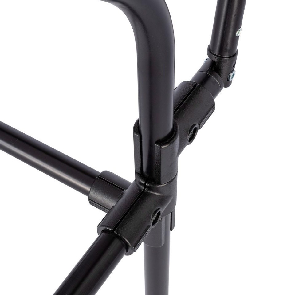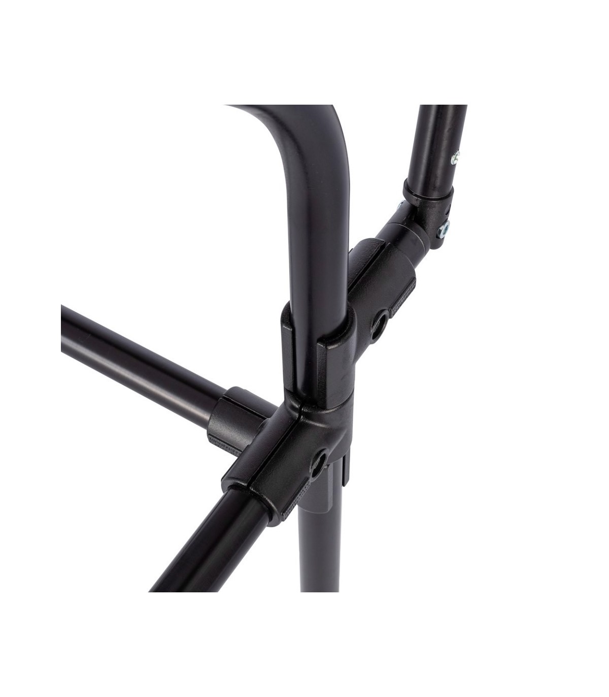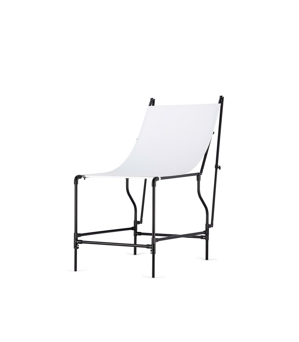 Mesa de Estudio Mini de aluminio negro para bodegones, con plexiglás translúcido de 150x78cm. En las patas y travesaños se pueden montar focos con pinzas para retroiluminación. Alturas: máxima con el respaldo vertical 157cm, mínima con el respaldo plano 70cm. Otras medidas: capacidad 10kg, peso 10kg. Indicado para fotos de bodegones en estudios de tamaño reducido.