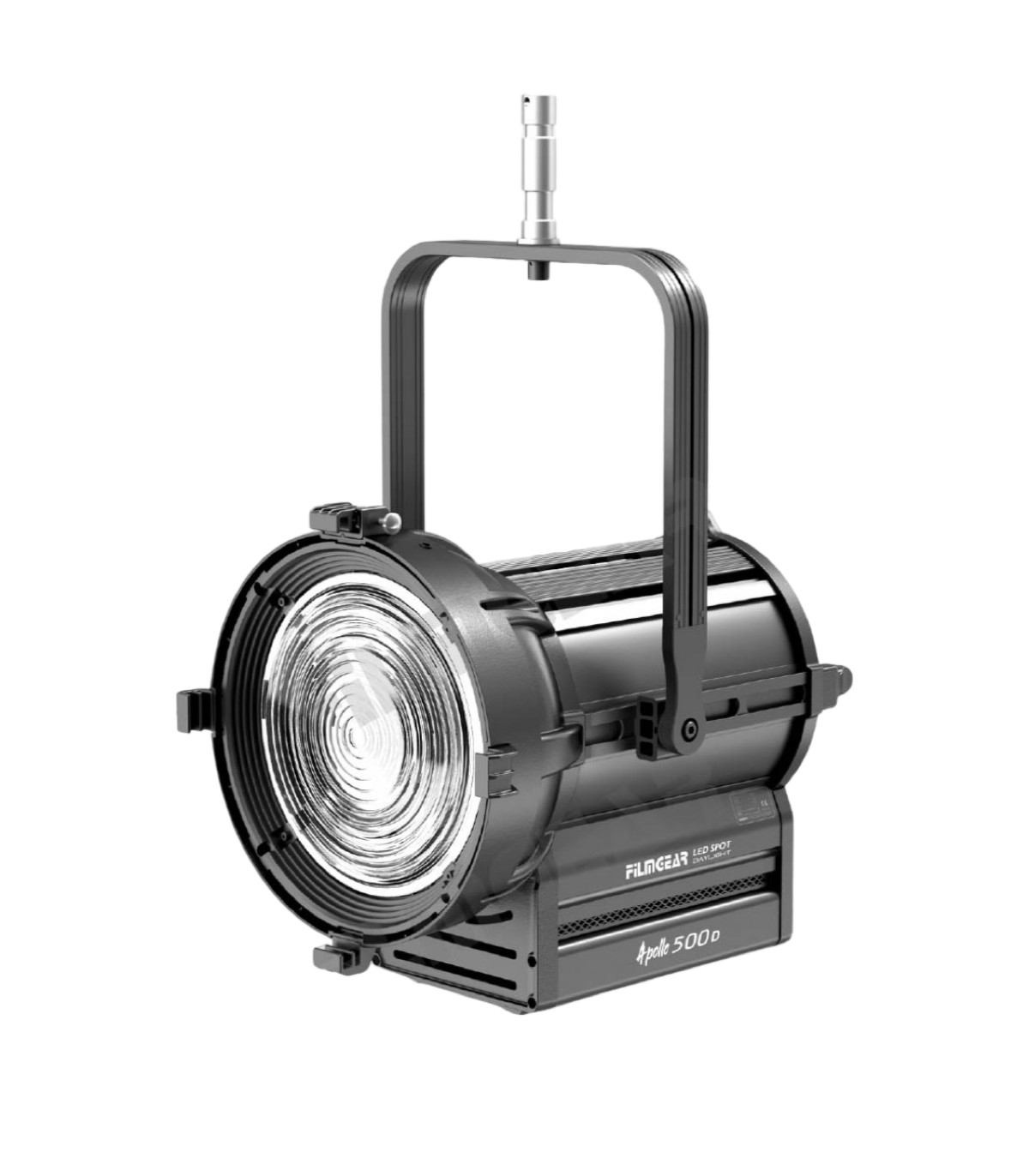 Foco Apolo LedSpot 500W COB LED 5600K con lente Fresnel de 250mm, DMX; luz dura con sombra marcada al más puro estilo del Fresnel clásico variando el haz desde 15º hasta 55º. Incluye cabeza 500W con horquilla, visera 4 hojas con eslinga de seguridad y cable alimentación AC. Datos fotométricos a 5600K: spot 15º: 62.431 Lux a 2m, 27.747 a 3m, 9.989 a 5m; flood 55º: 16.844 Lux a 2m, 7.487 a 3m, 2.695 a 5m. Indicado para luz principal y entrada por la ventana en cine.
