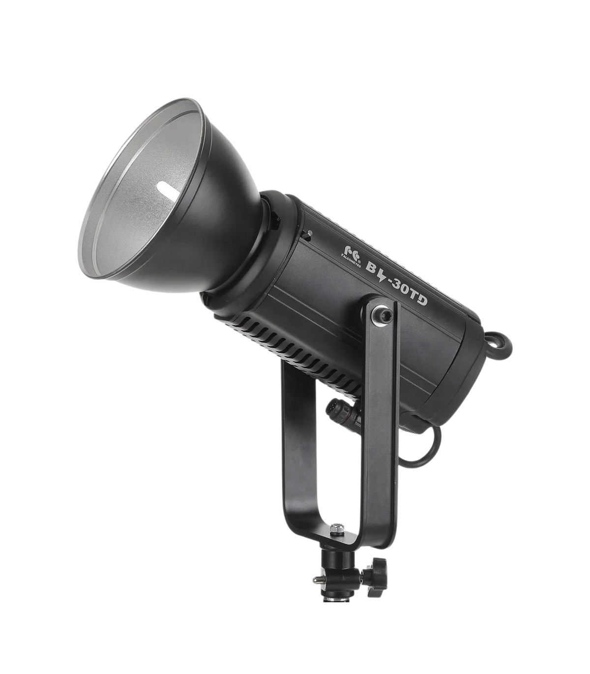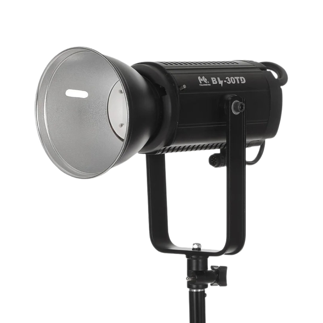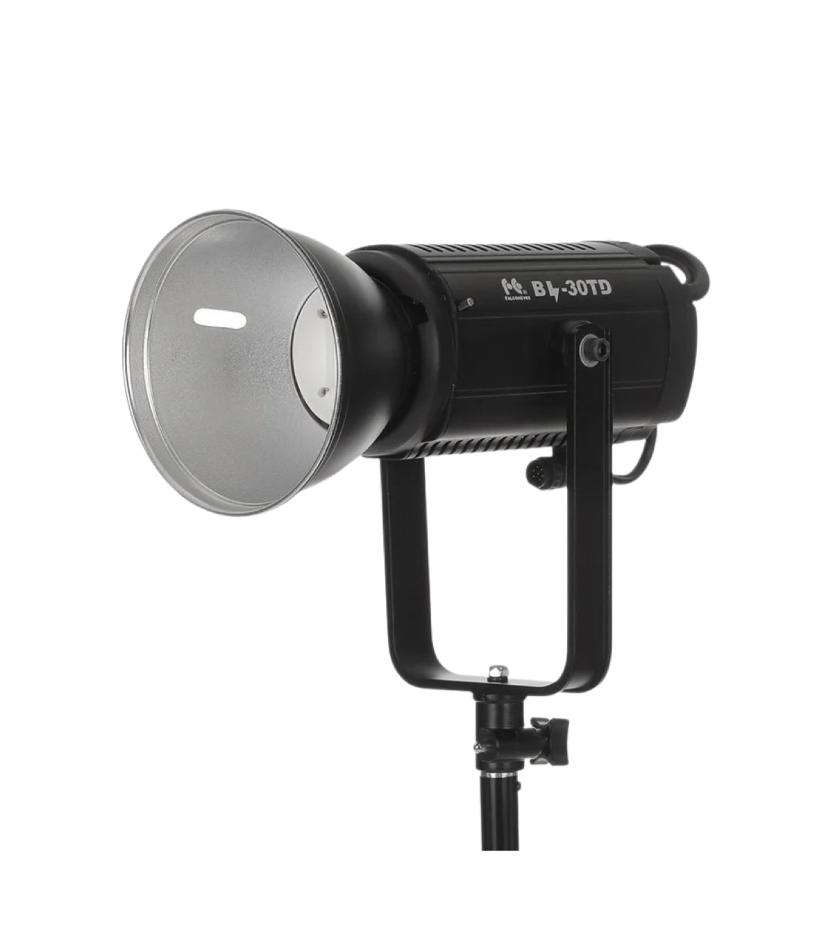 Foco BL-30TD de 300W COB LED Bicolor 3000K a 8000K, DMX; luz dura con sombra marcada, haz 40º con reflector. Incluye cabeza 300W con montura, horquilla con manguito 16mm, reflector, control DMX con adaptadores V-Lock, cable de alimentación AC y maleta de transporte. Datos fotométricos a 5600K CON reflector: 104.000 Lux a 0,5m, 18.500 a 1m, 3.850 a 2m, 1.750 a 3m. Indicado para fotografos y streamers.