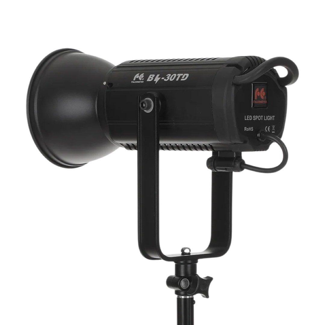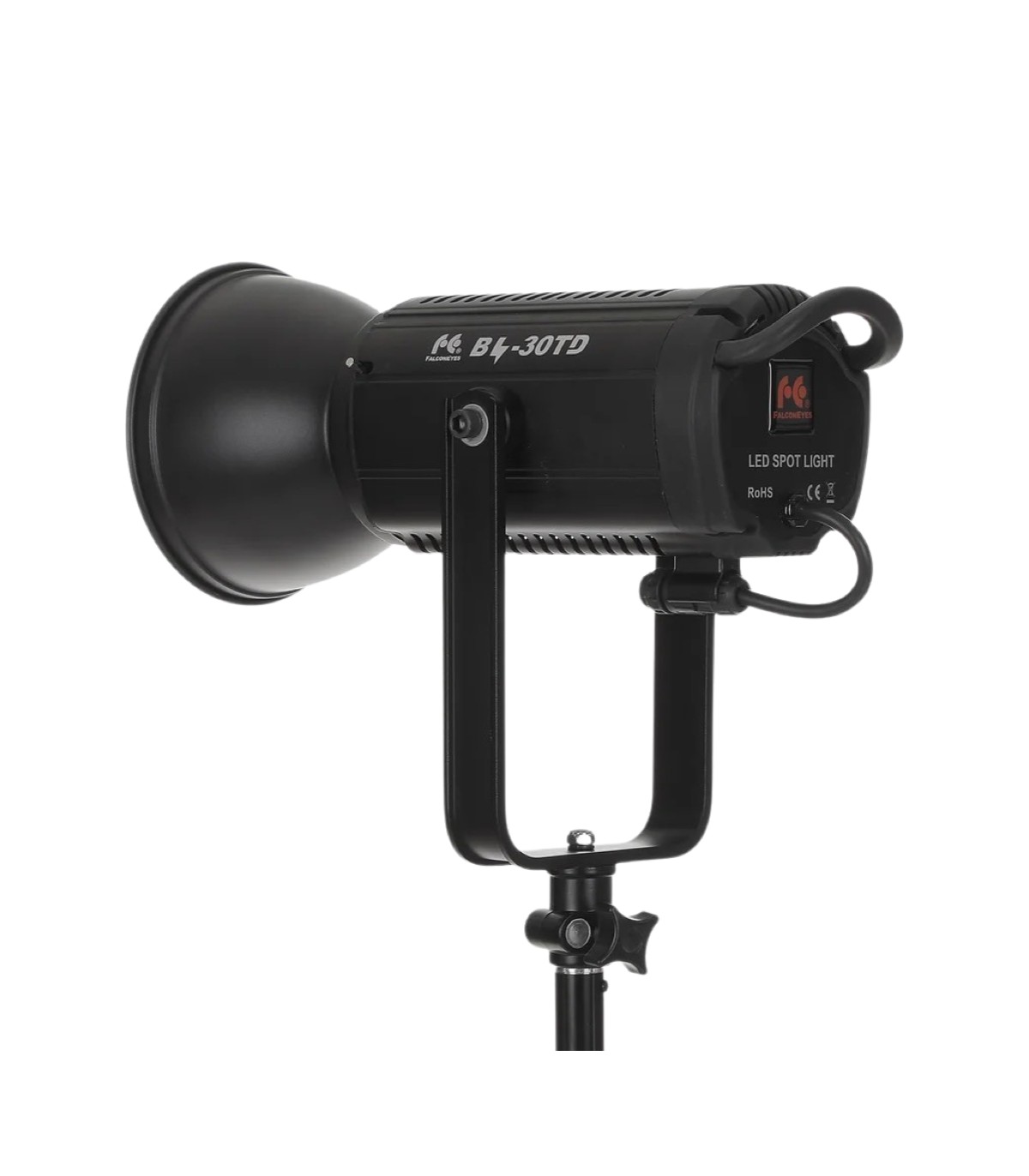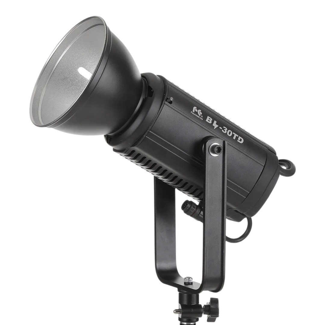 Foco BL-30TD de 300W COB LED Bicolor 3000K a 8000K, DMX; luz dura con sombra marcada, haz 40º con reflector. Incluye cabeza 300W con montura, horquilla con manguito 16mm, reflector, control DMX con adaptadores V-Lock, cable de alimentación AC y maleta de transporte. Datos fotométricos a 5600K CON reflector: 104.000 Lux a 0,5m, 18.500 a 1m, 3.850 a 2m, 1.750 a 3m. Indicado para fotografos y streamers.